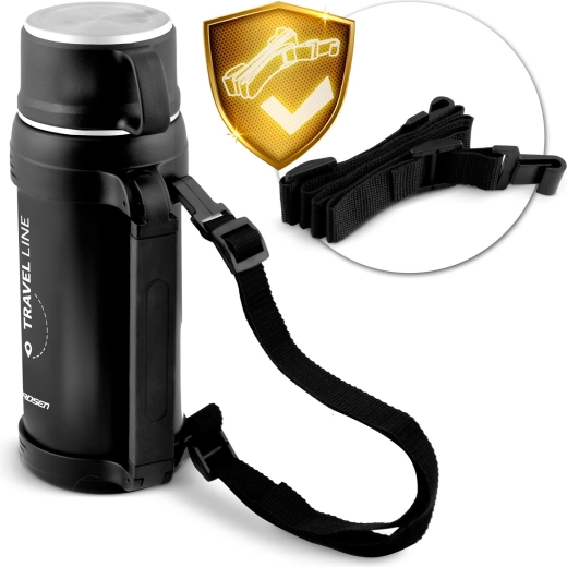 A practical travel thermos with a 1.5 L capacity keeps drinks hot for up to 12 hours and cold for up to 24 hours. Thanks to its double-walled stainless steel, lightweight design, and adjustable side handle, it’s ideal for trips and daily commuting. The lid doubles as a cup, plus there’s a secure lid lock and a adjustable shoulder strap included for free.