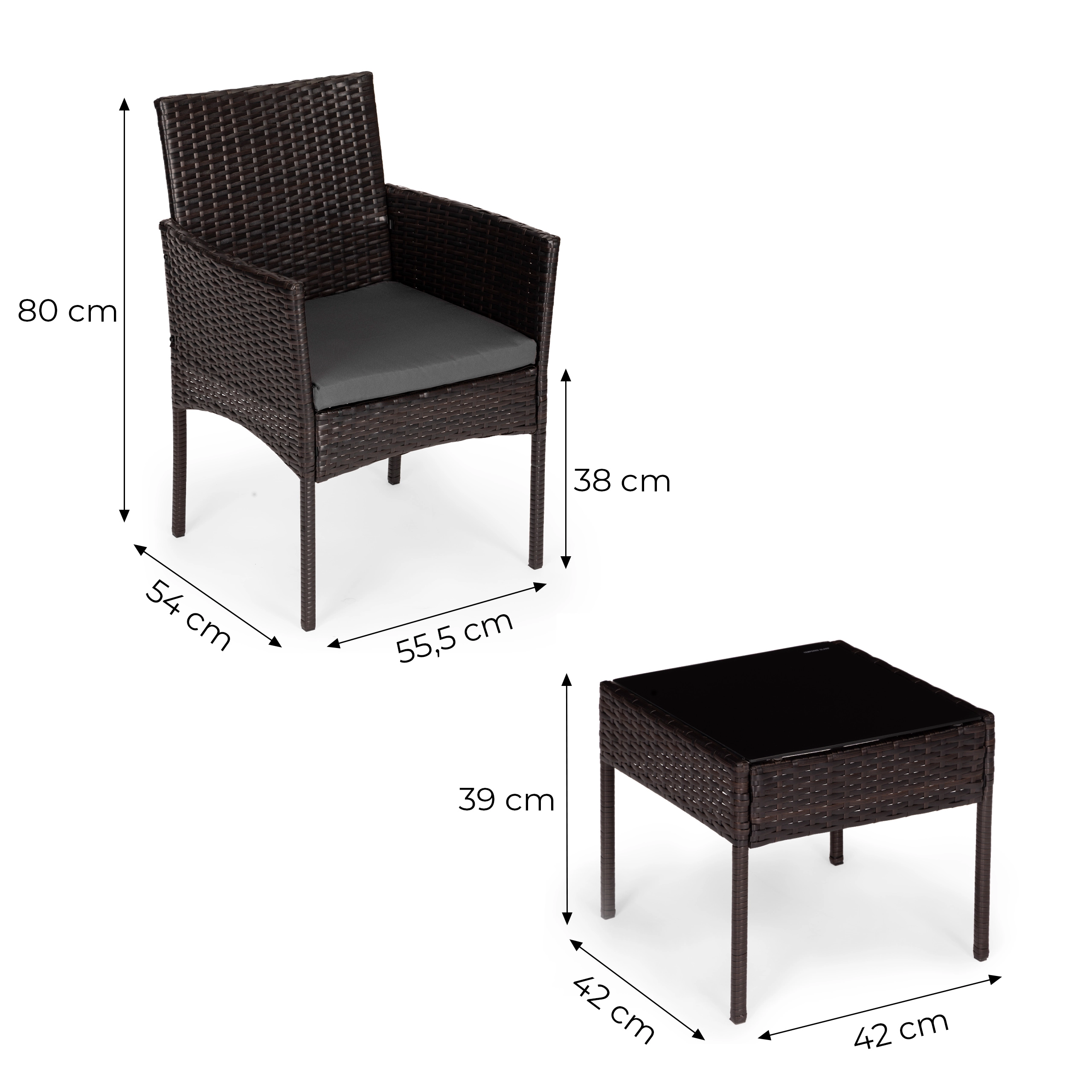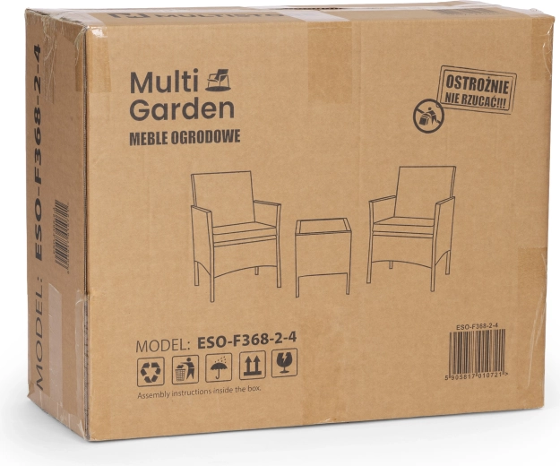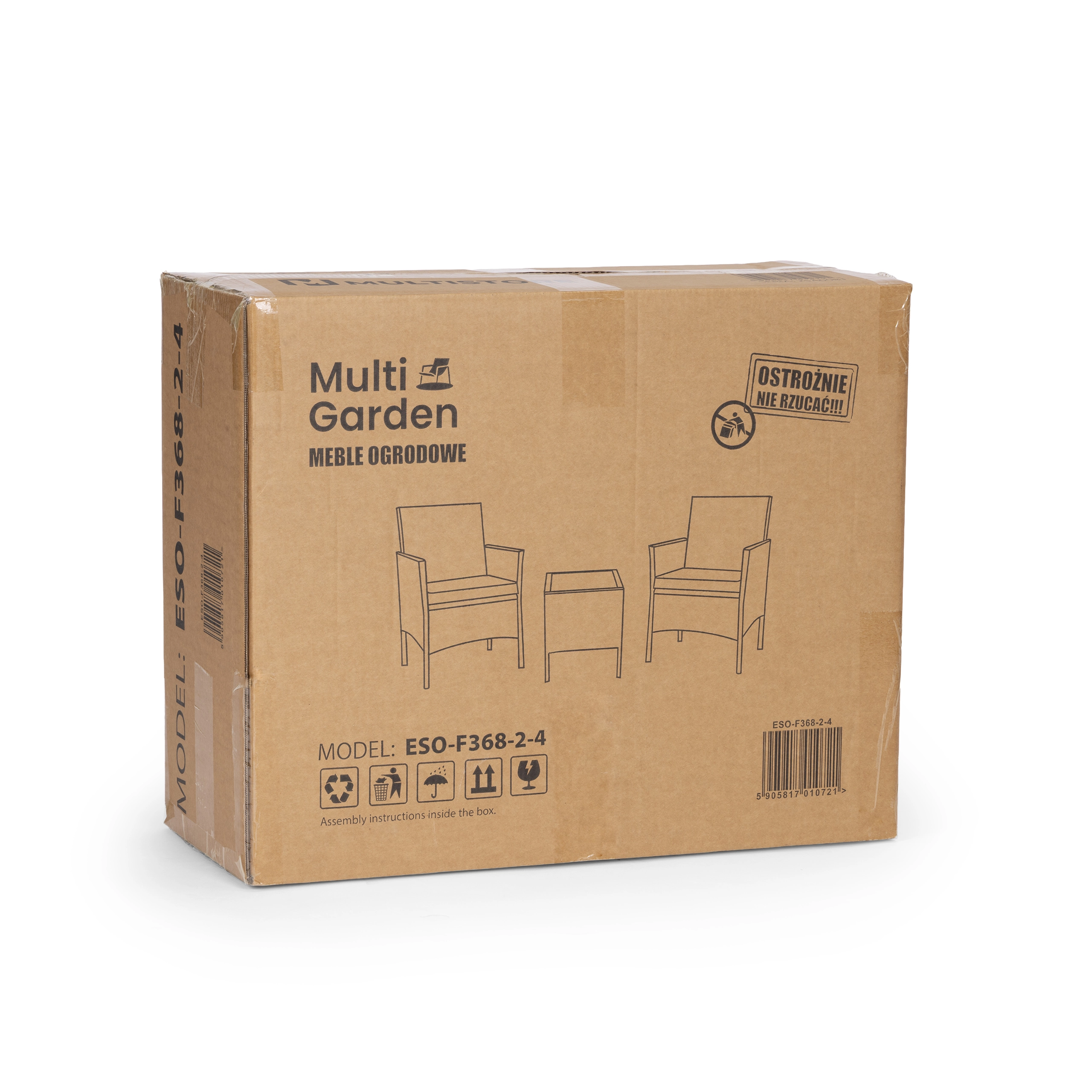 A stylish garden set for 2 from MultiGarden combines technorattan, a sturdy steel frame, and a table with tempered glass. Includes padded cushions made of 160 g/m² polyester. The furniture is weather-resistant, low-maintenance, and perfect for the patio, balcony, and garden.
