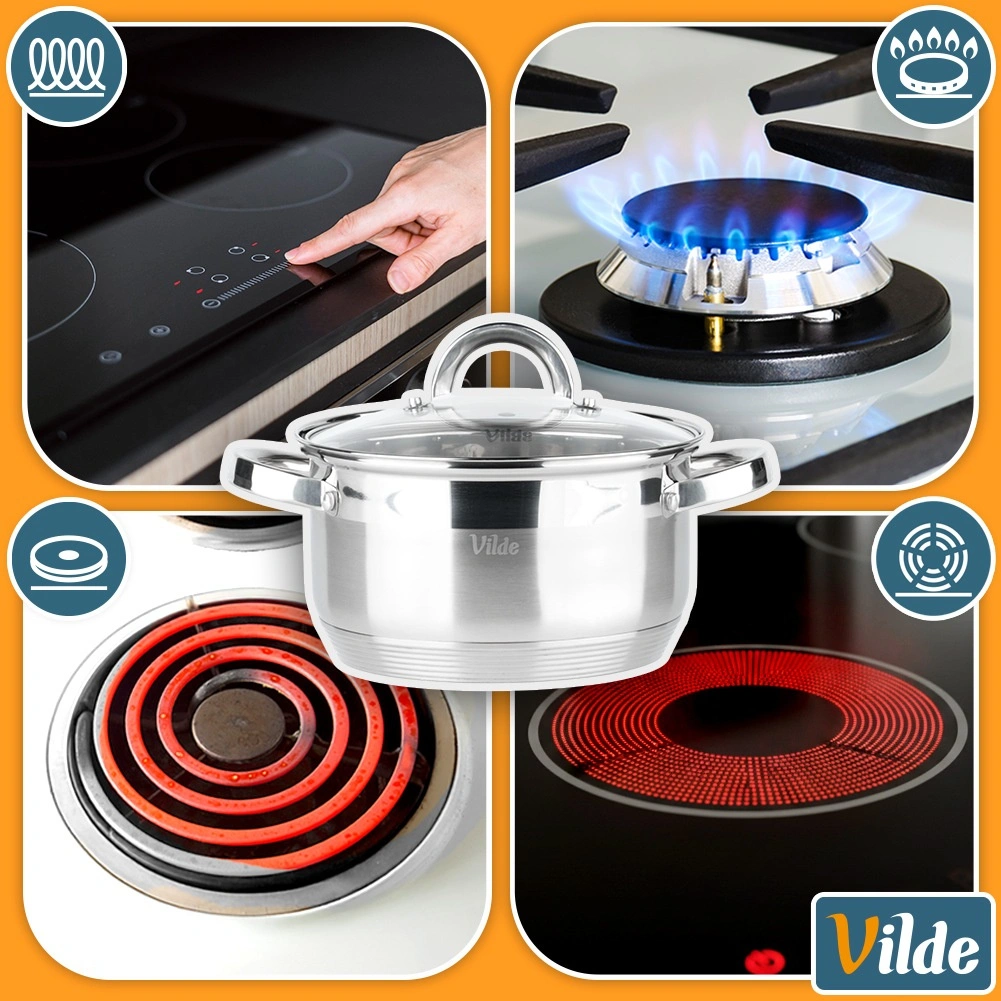 The stainless steel pot is compatible with gas, electric, ceramic, halogen, and induction hobs.