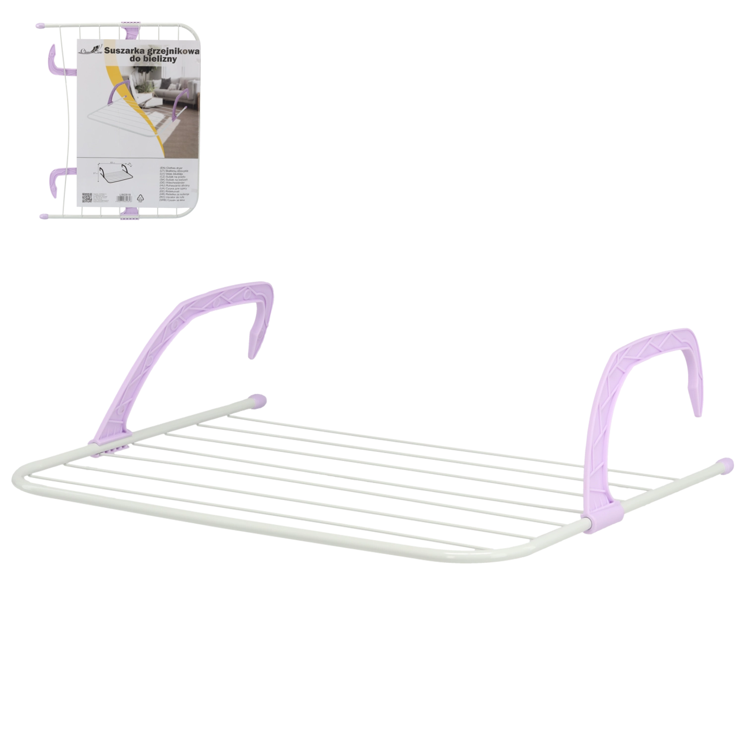 A compact hanging radiator drying rack offering up to 6 m of drying area in a minimalist design. Thanks to its folding arms, you can easily attach it to a radiator, balcony railing, or door. It is lightweight and portable, saves space, and is perfect for small loads of laundry or quickly finishing towels.