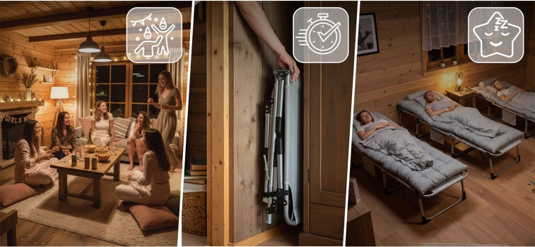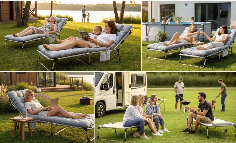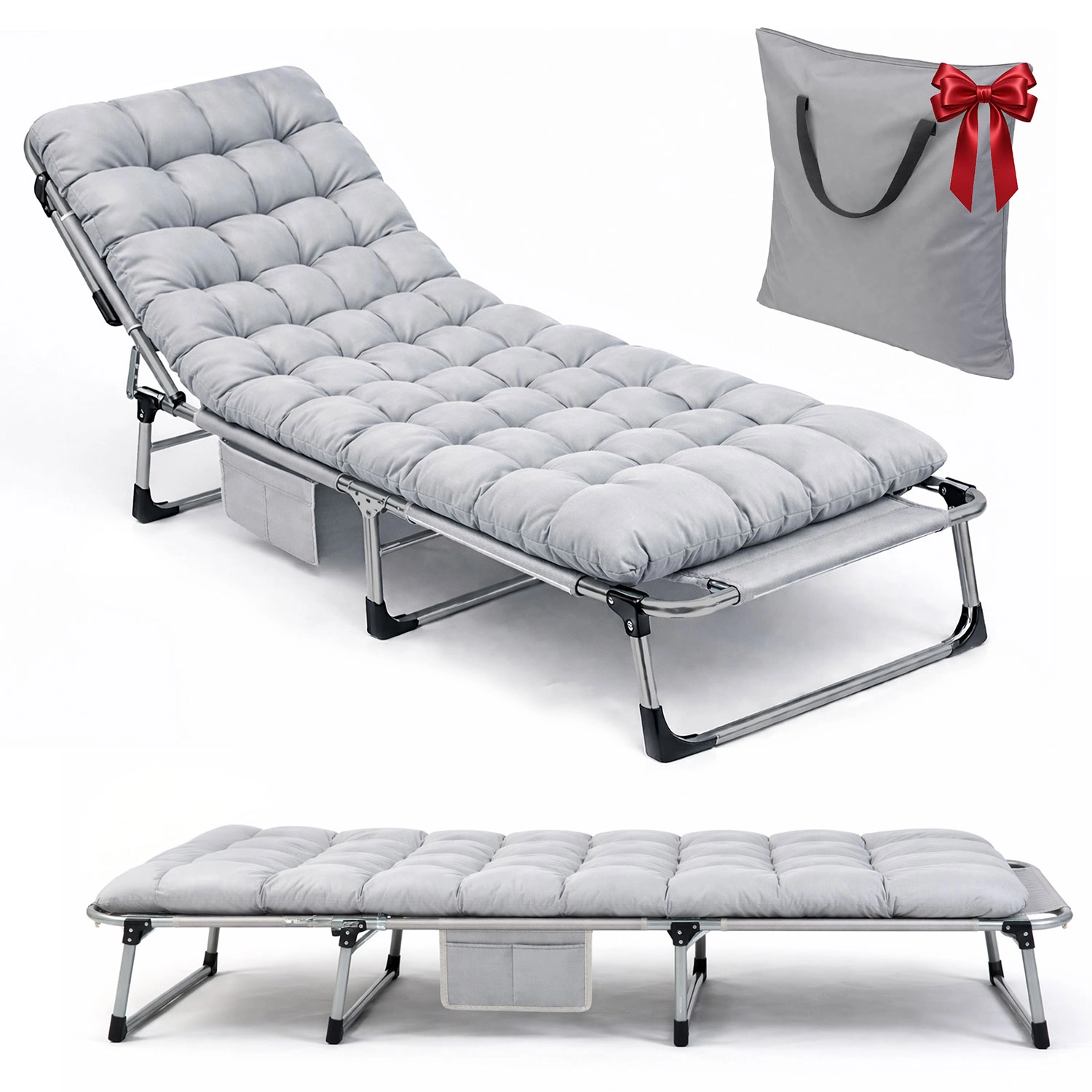 Durable metal frame, non-slip feet, and quick folding. Once folded, the lounger is compact, secured with straps, and stored in a carry bag.