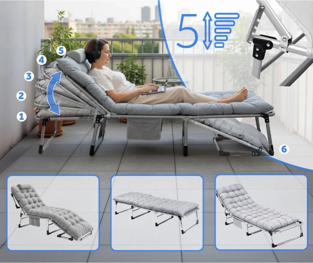 The ChillWell Dream folding lounger and camp bed is designed for maximum comfort while relaxing or sleeping. The ergonomic design provides firm support for the whole body, while the 5-step backrest adjustment and folding foot section let you choose exactly the position you prefer—from fully flat to a comfortable recline for reading.