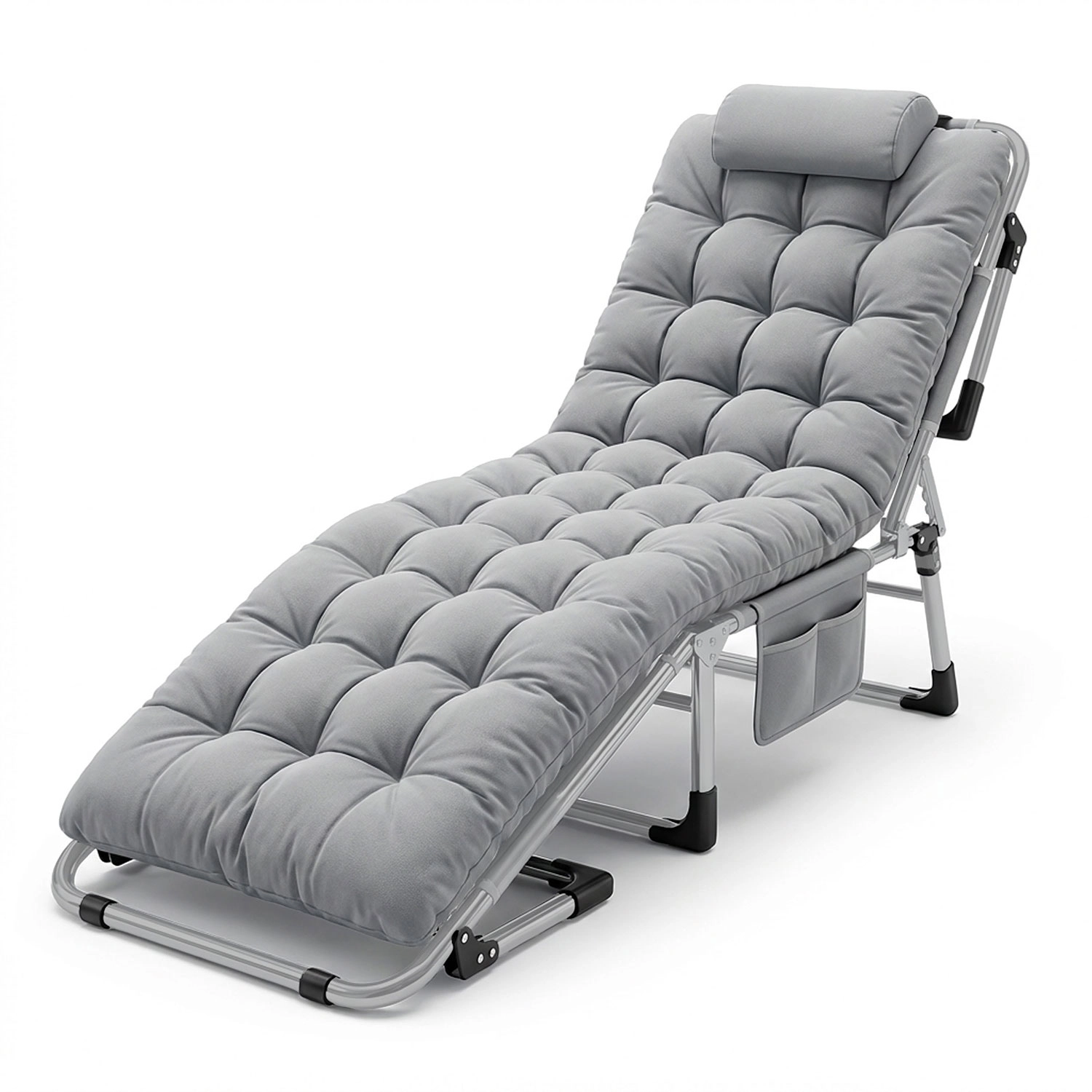 Thanks to the metal frame and non-slip foot caps, the lounger is stable and durable for outdoor use. The thick, soft mattress with headrest remains lofty and comfortable even with frequent use. A practical side pocket keeps your phone, book, or bottle within reach. When folded, the lounger is compact, secured with hook-and-loop straps, and stored in a carry bag.