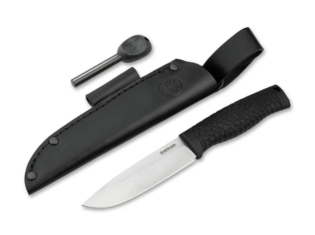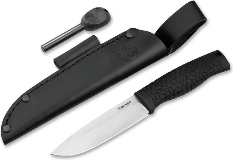 The Böker Manufaktur Solingen Bronco outdoor knife is a reliable partner for bushcraft, camping, and survival. It features a wide CPM-3V steel blade with a plain edge, a single-sided guard for a secure grip, and a durable TPE handle that offers confident traction even when wet. A premium leather sheath with a fire starter for quick fire-making is included.