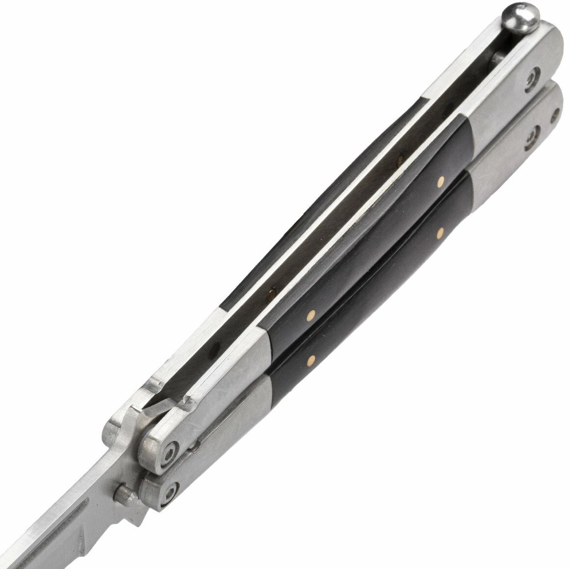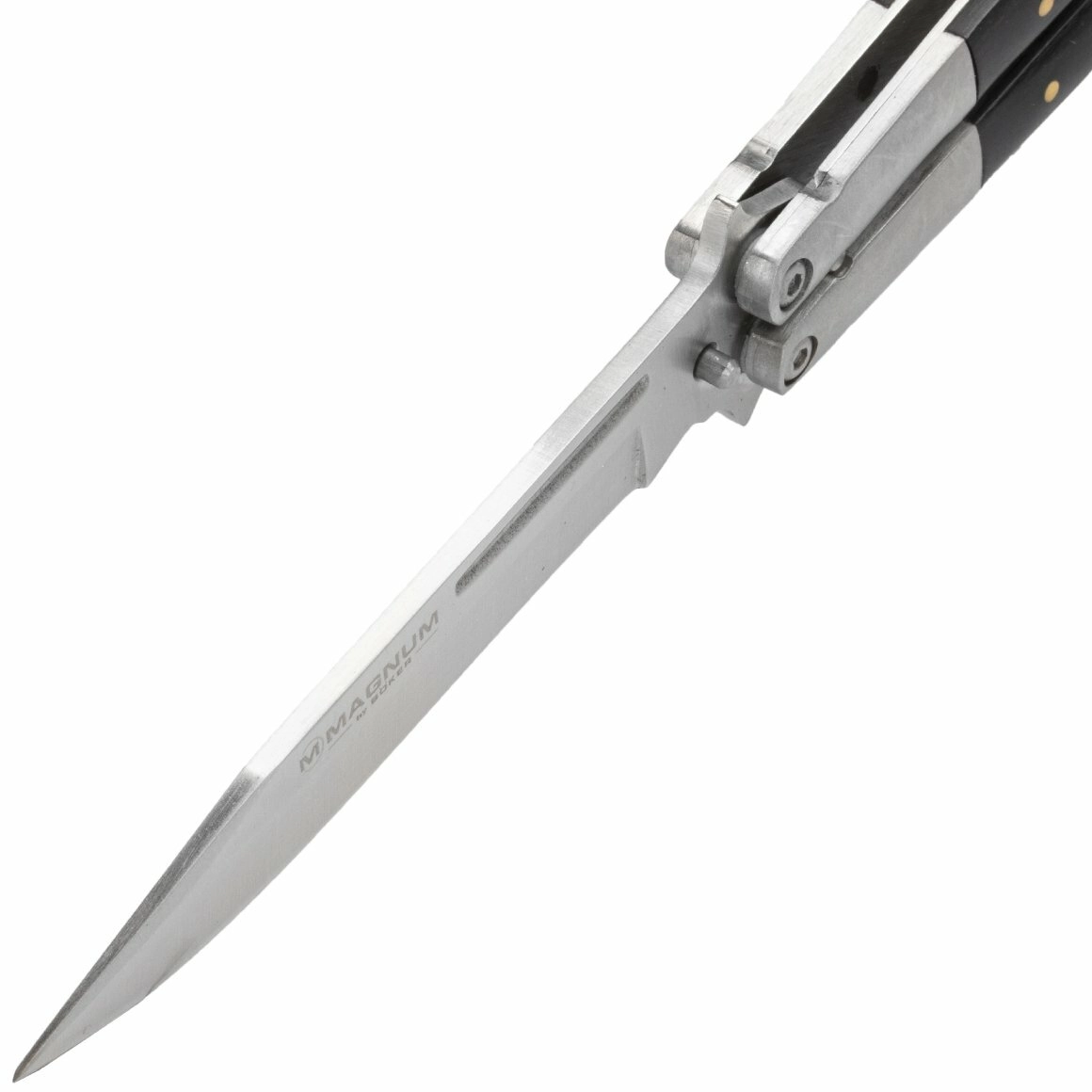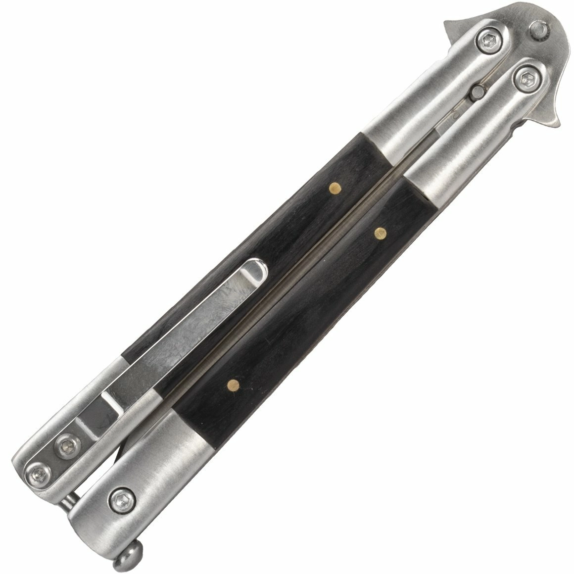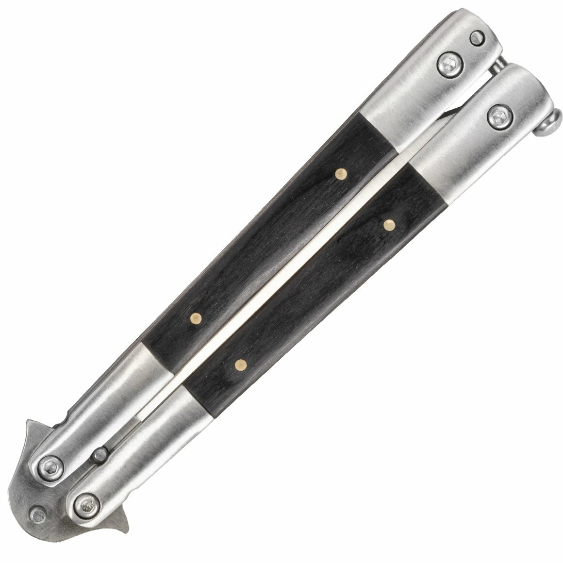 The Magnum Wood balisong delivers reliable performance in a compact form. The Drop Point blade with a plain edge and flat grind is made from 440C stainless steel, known for its high corrosion resistance and solid edge retention. The satin finish adds an elegant look and makes maintenance easier.