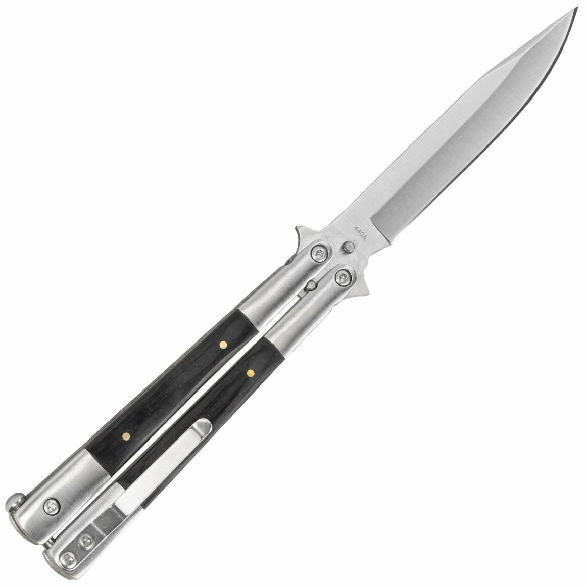 The stylish Magnum balisong knife combines precise craftsmanship, durable 440C stainless steel, and an elegant Pakkawood handle. Ideal for EDC, balisong enthusiasts, and collectors – featuring smooth action, a secure balisong latch, and a versatile blade with a satin finish.
