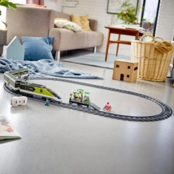 Build your own railway with the LEGO CITY High-Speed Train 60337. Get a remote-controlled locomotive with dimmable headlights (Powered Up), a dining car and passenger car, a platform, 24 track pieces, and 6 minifigures for endless stories and creative play.