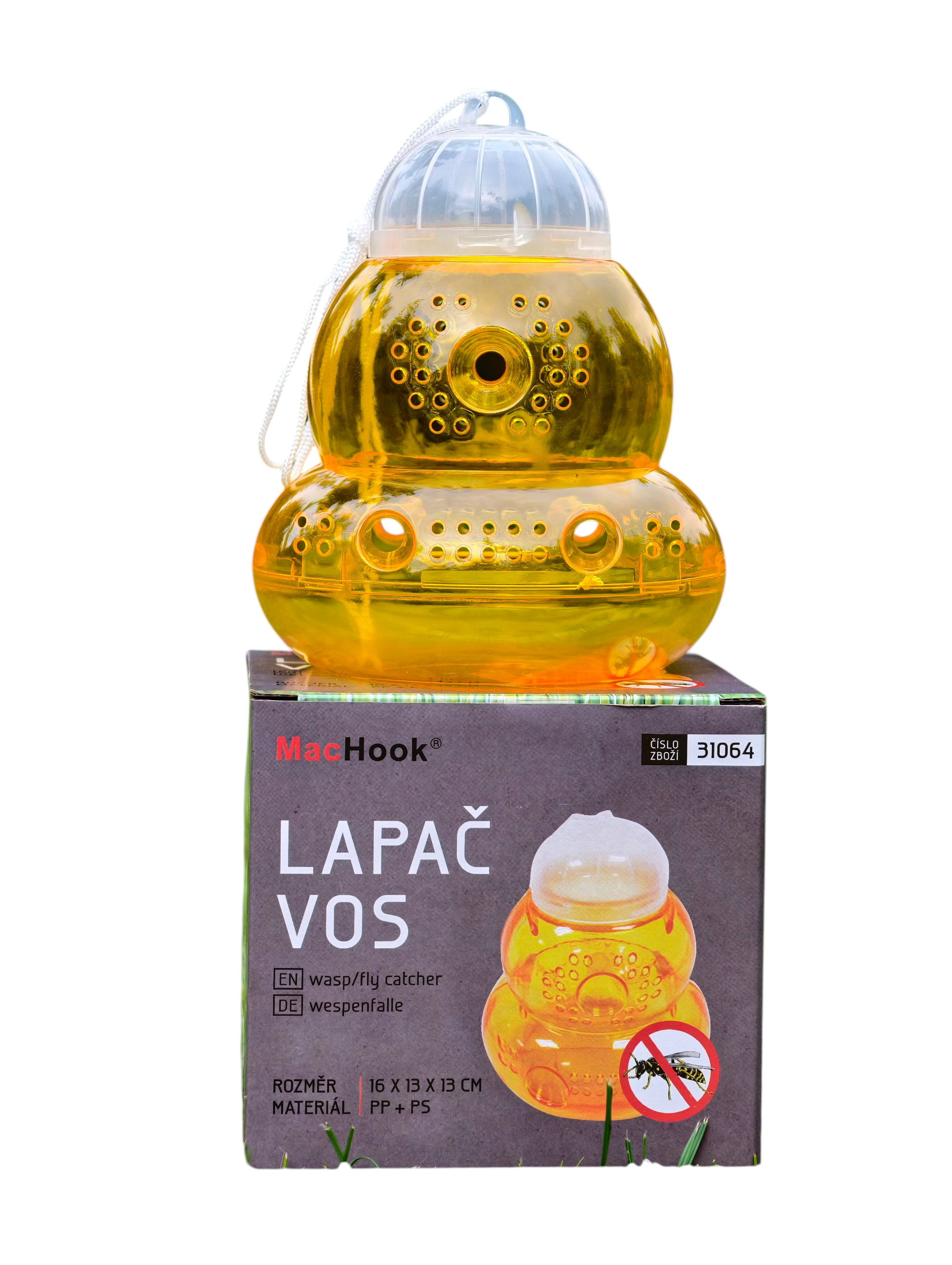 The high-quality transparent body made of PP and PS enables easy fill checks, the lid with an eyelet ensures quick installation, and multiple entry holes boost capture efficiency. Compact dimensions of 16 × 13 × 13 cm suit orchards, vineyards, beds, and balconies.