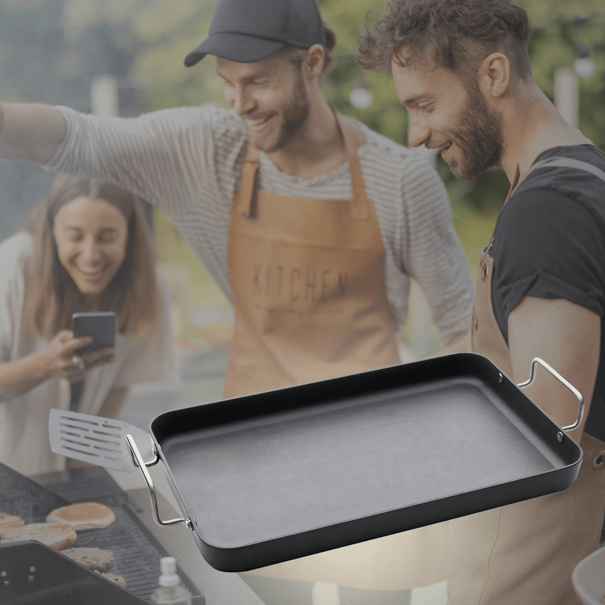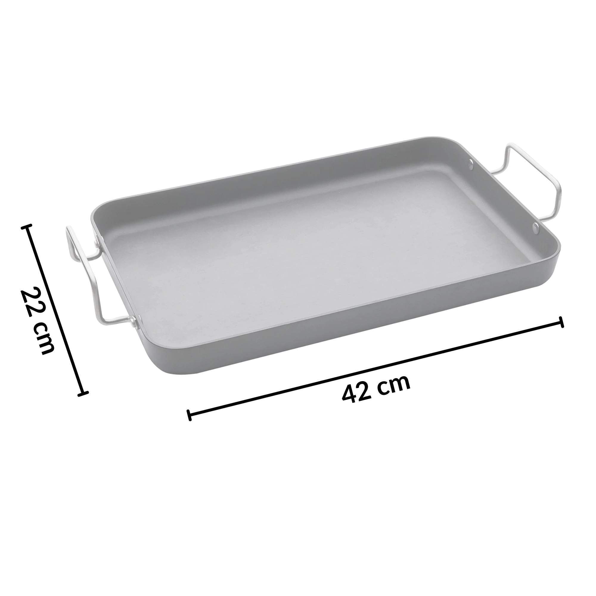 The rectangular shape with a low rim ensures efficient heat contact and consistent results when grilling, frying, and baking.