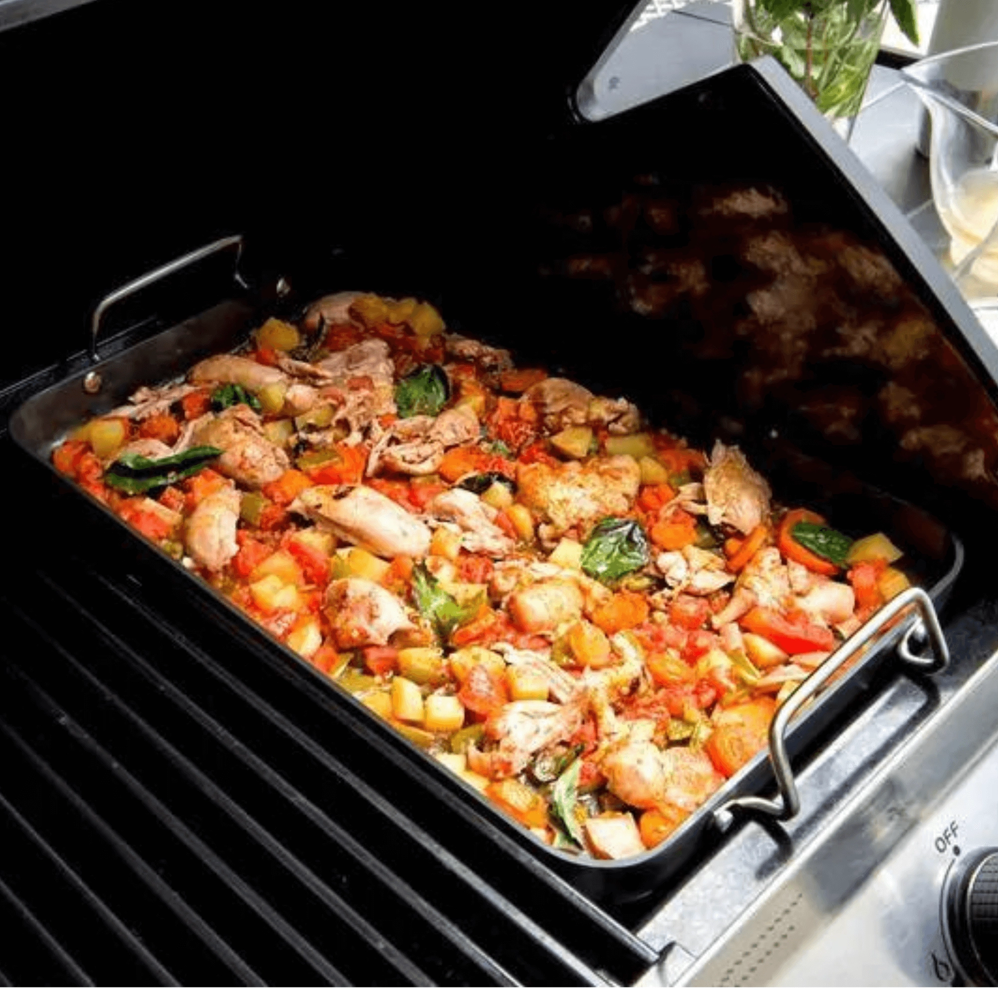 A universal aluminum roasting pan with a hard-anodized exterior and an internal non-stick coating is ideal for the grill, oven, and stovetop. Thanks to the stainless steel handles, it’s easy to carry, scratch-resistant, and easy to clean. Compatible as an interchangeable module with CADAC STRATOS grill grates.