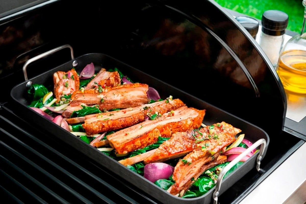 The roasting pan serves as an interchangeable module instead of the grate—ideal for delicate ingredients that would fall through the grid.