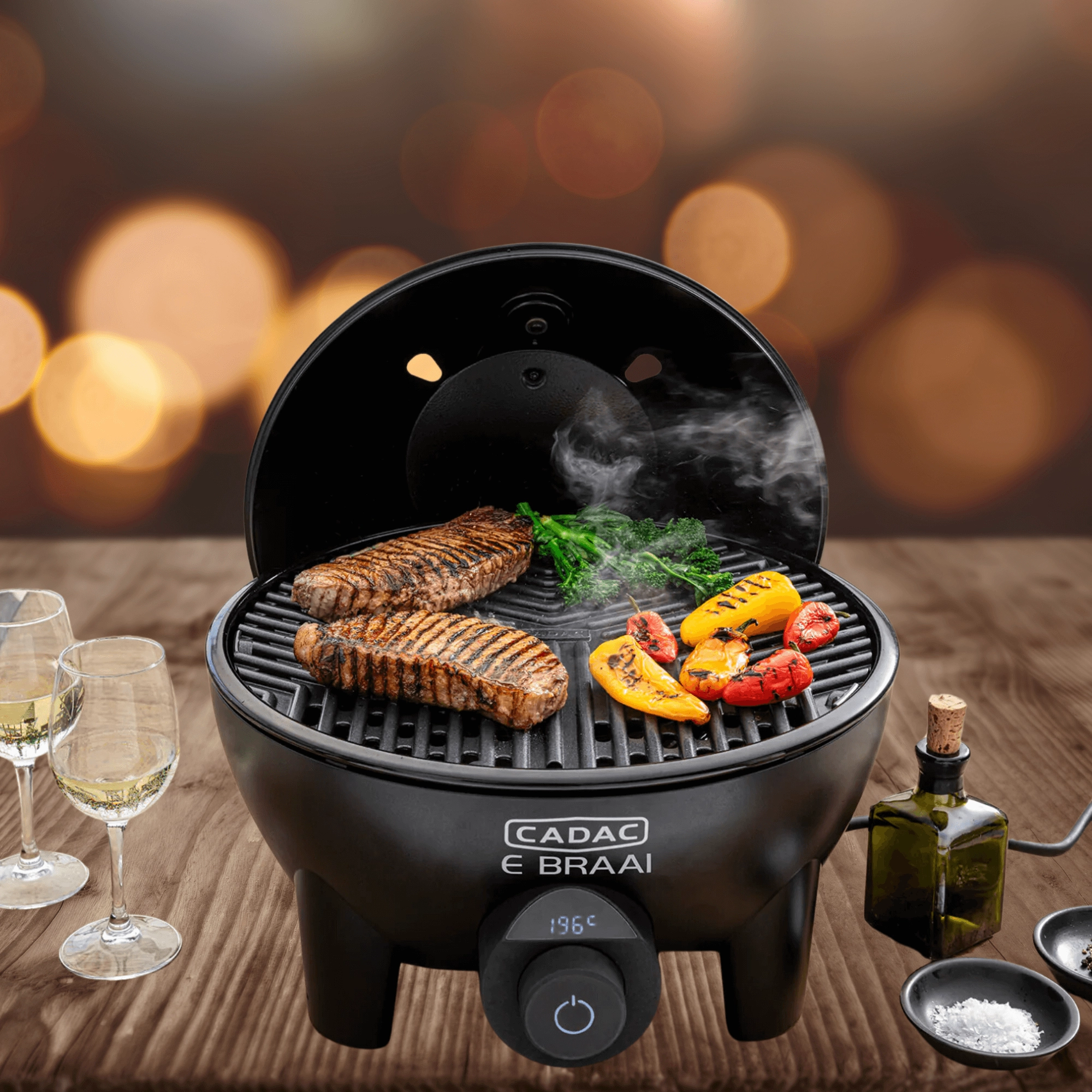 The CADAC E‑Braai tabletop electric grill (Ø 40 cm) brings clean, worry‑free grilling to your balcony, terrace, or campsite. Set the temperature precisely thanks to electronic control that reads directly from the cooking grate—delivering consistent results without the lid‑temperature deviation. Four ventilation openings in the lid ensure smooth air circulation and even heat distribution.