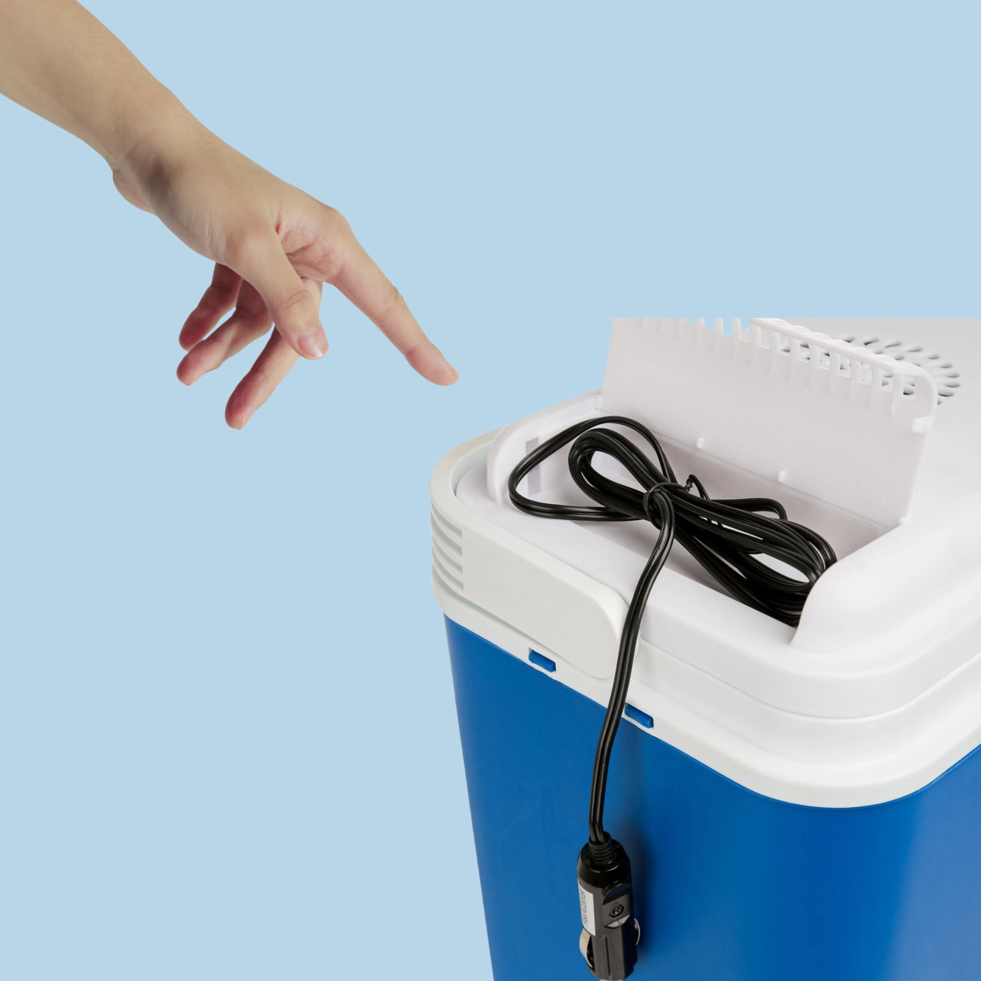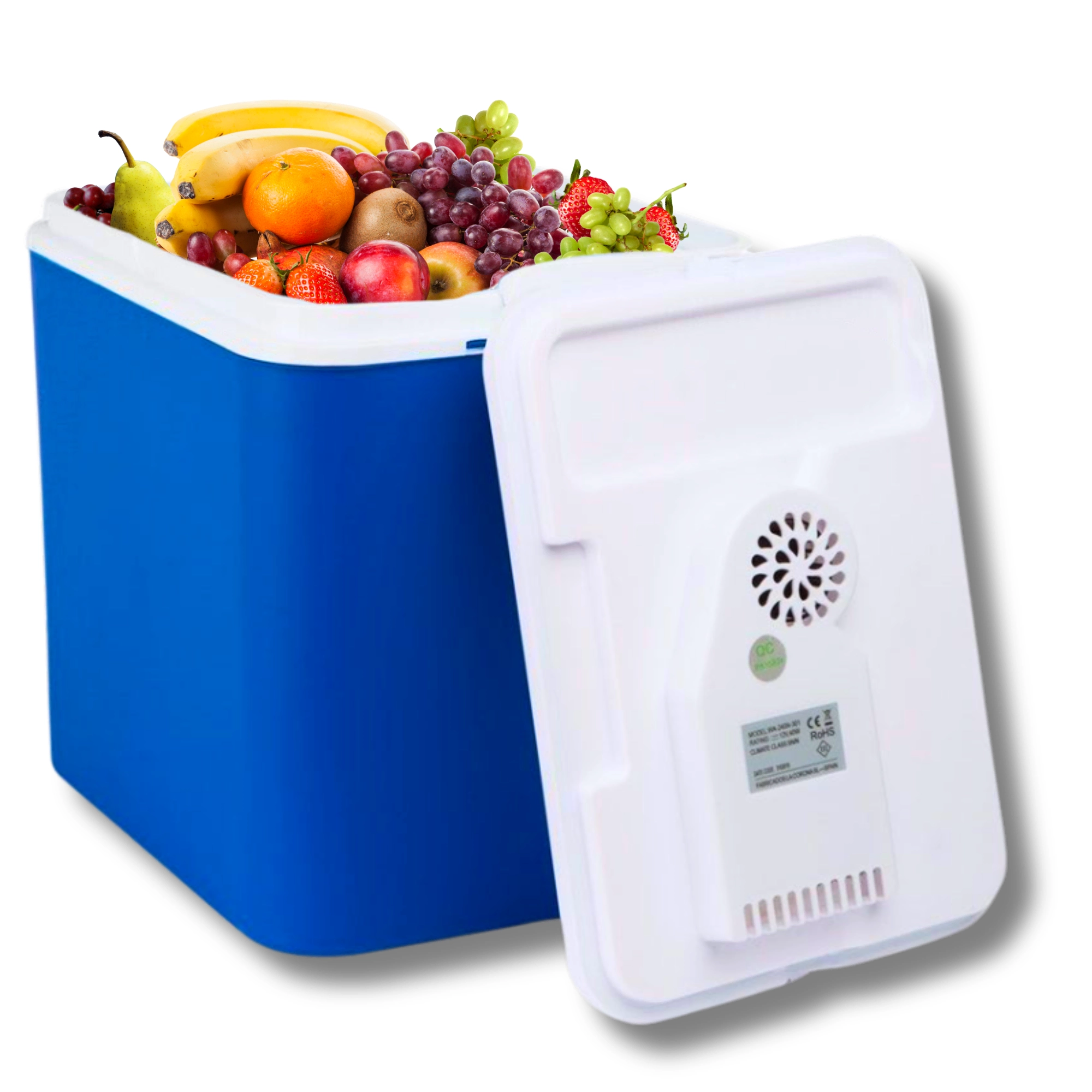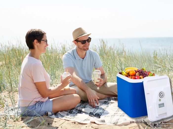 An integrated cooling module in the lid and a 12 V car connector keep your drinks and food fresh throughout the journey. Ideal for cars, RVs, and boats.