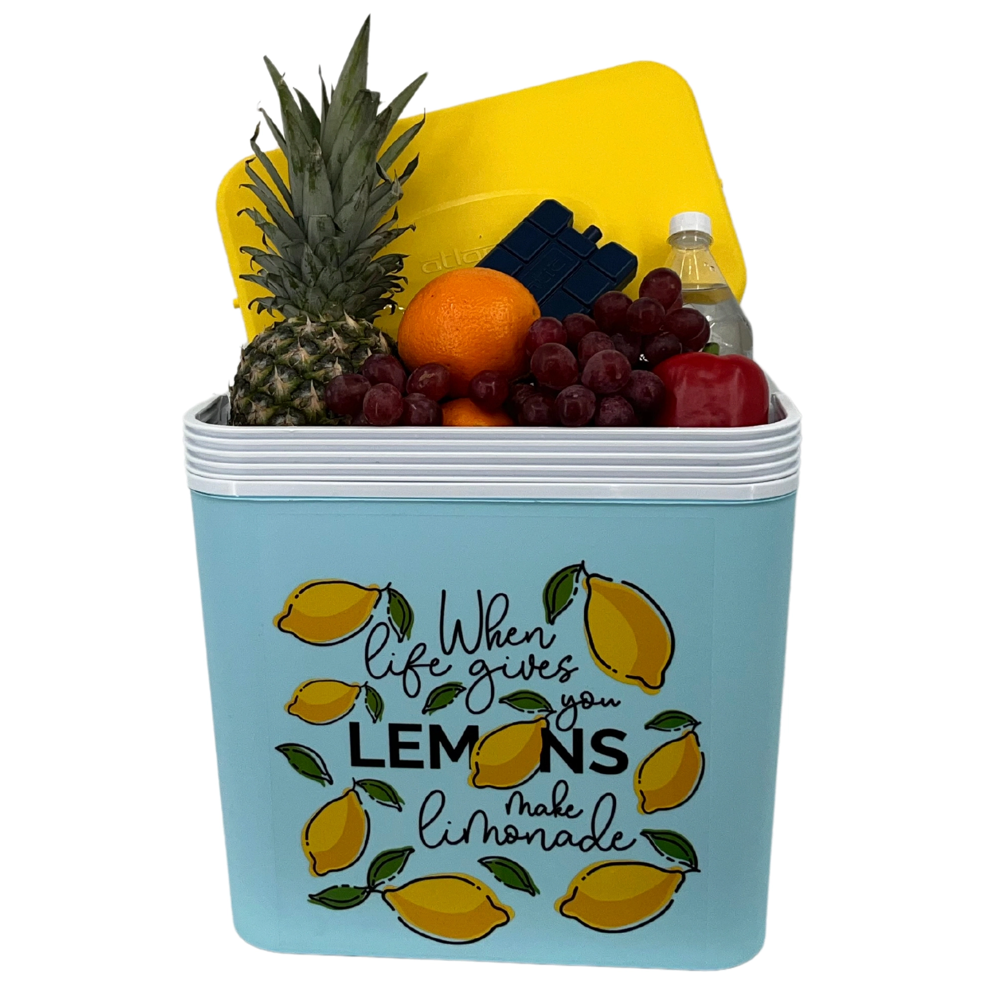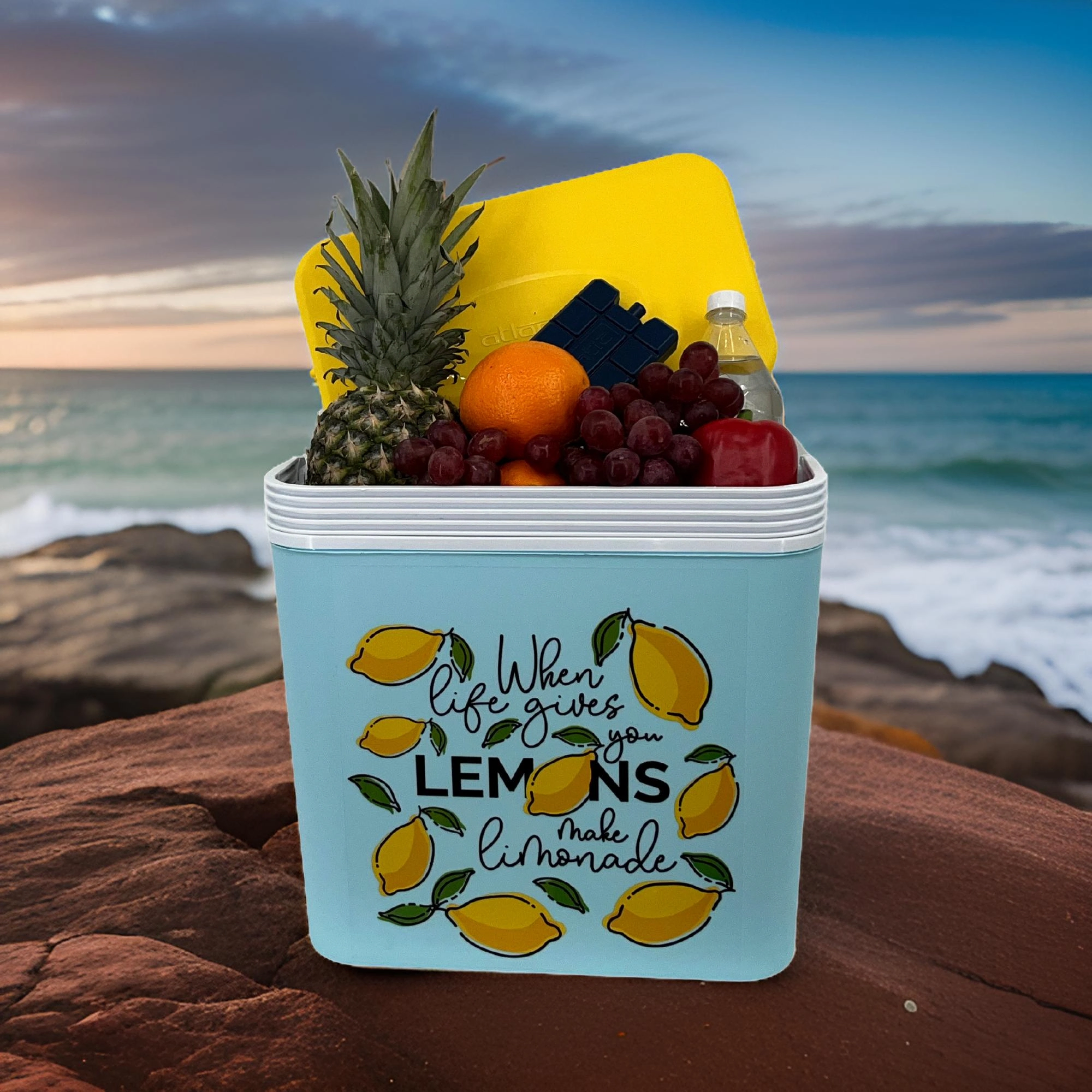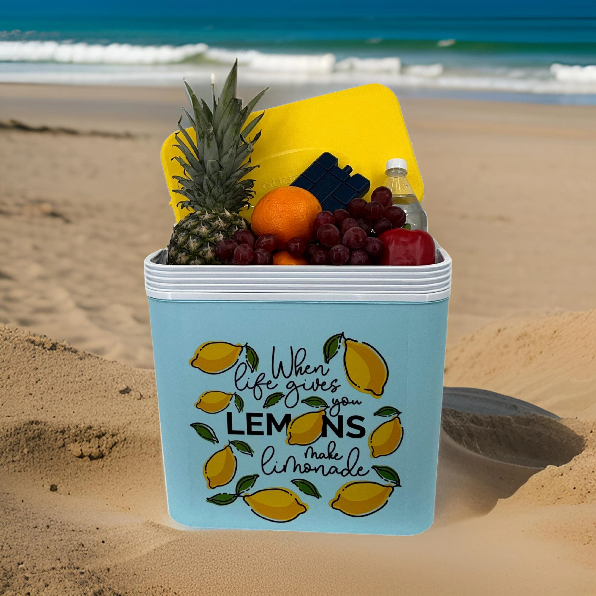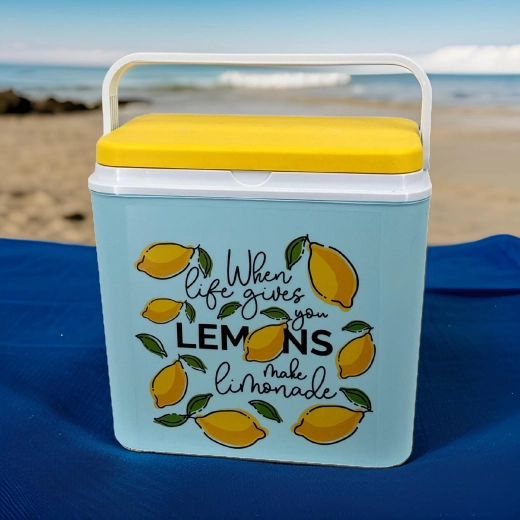 The fresh lemon pattern in a blue–yellow combination adds flair to your outings and makes the cooler easy to spot.