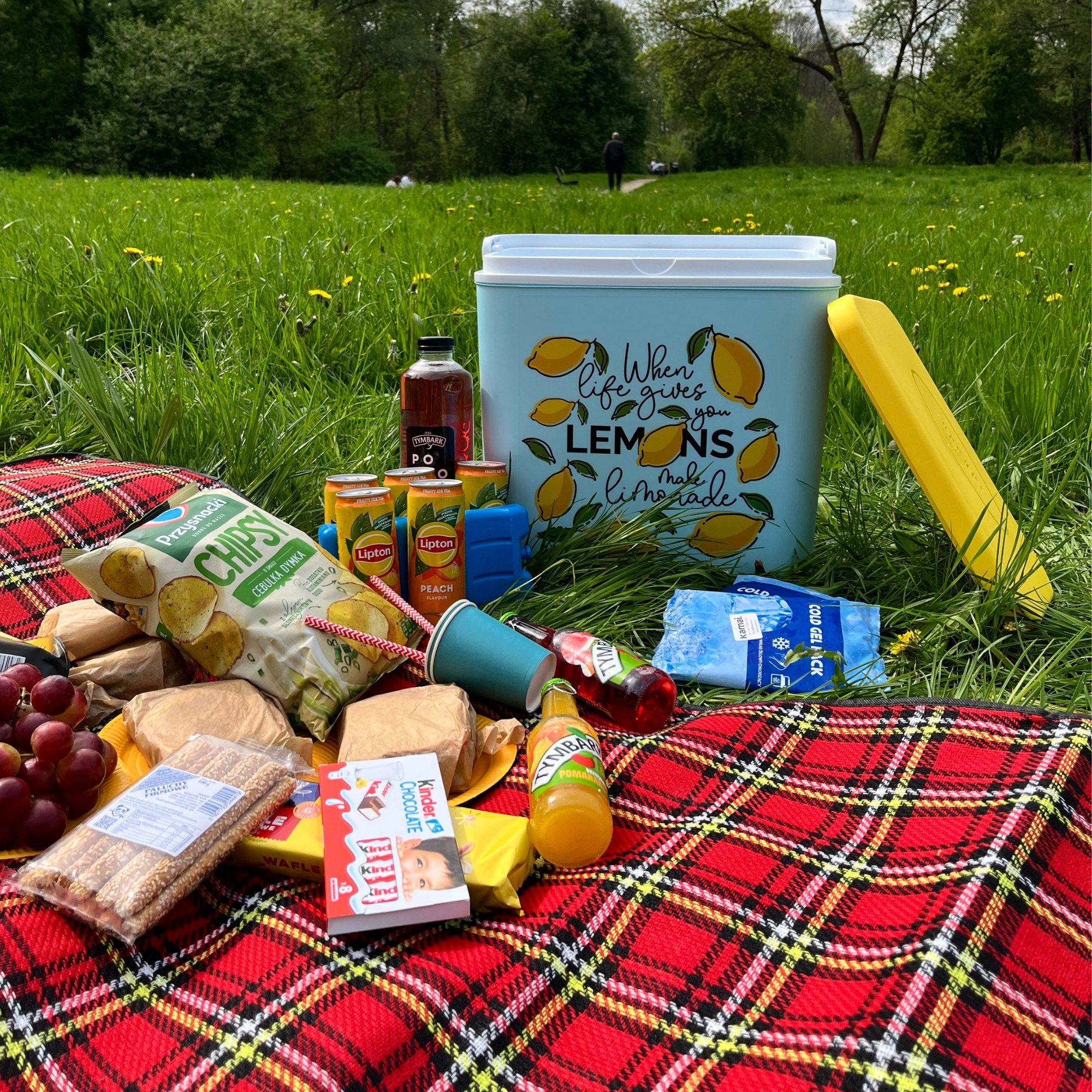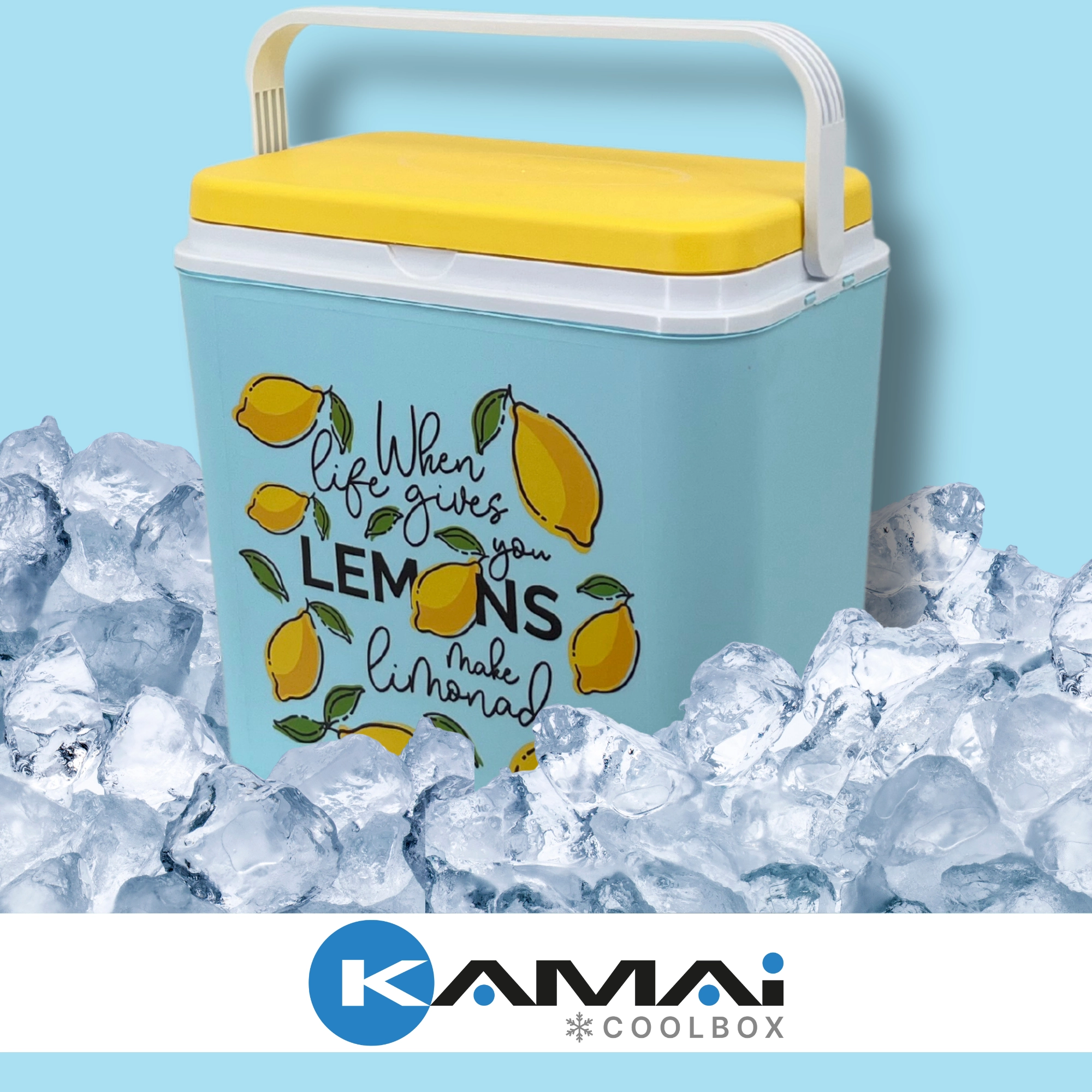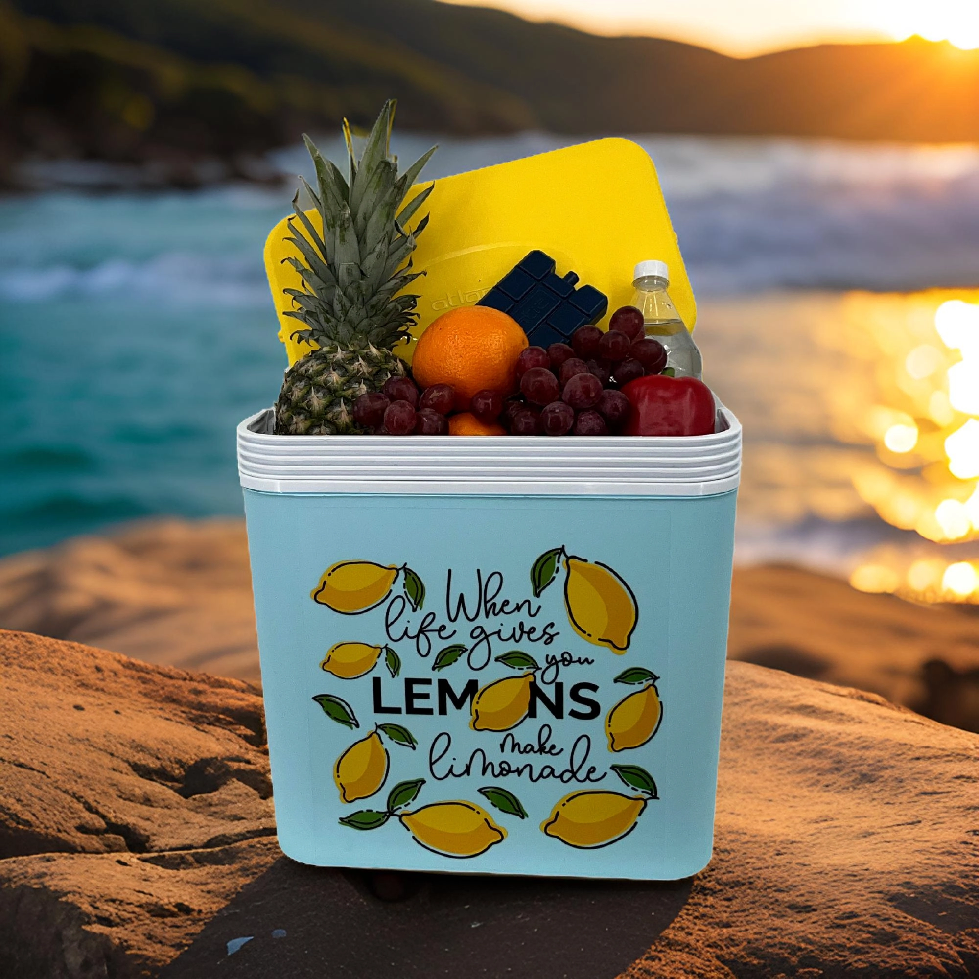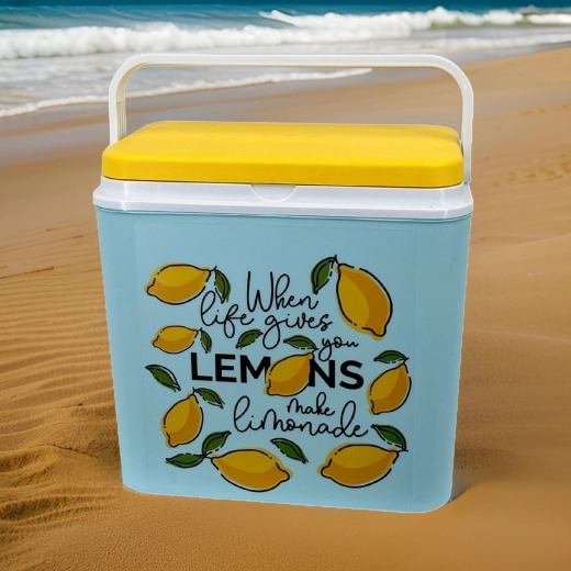 This stylish passive cooler stands out with the LEMONADE motif combining light blue and yellow. Thanks to thoughtful insulation, it maintains a low temperature even on hot days and is ideal for family trips, the beach, and picnics.