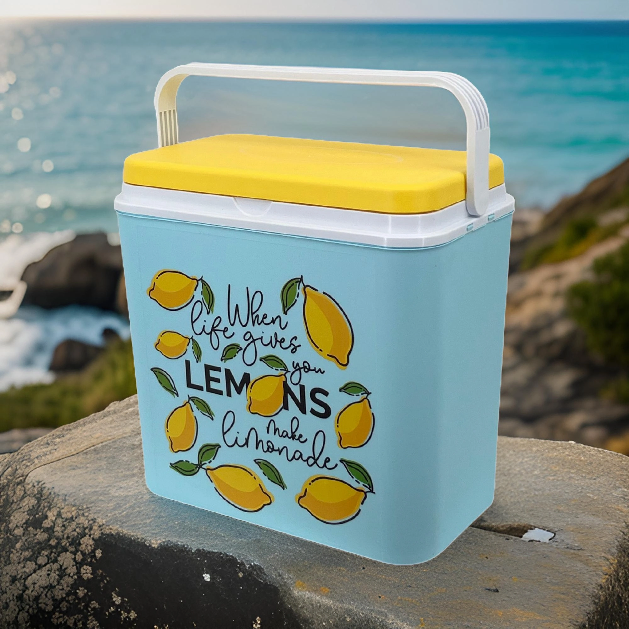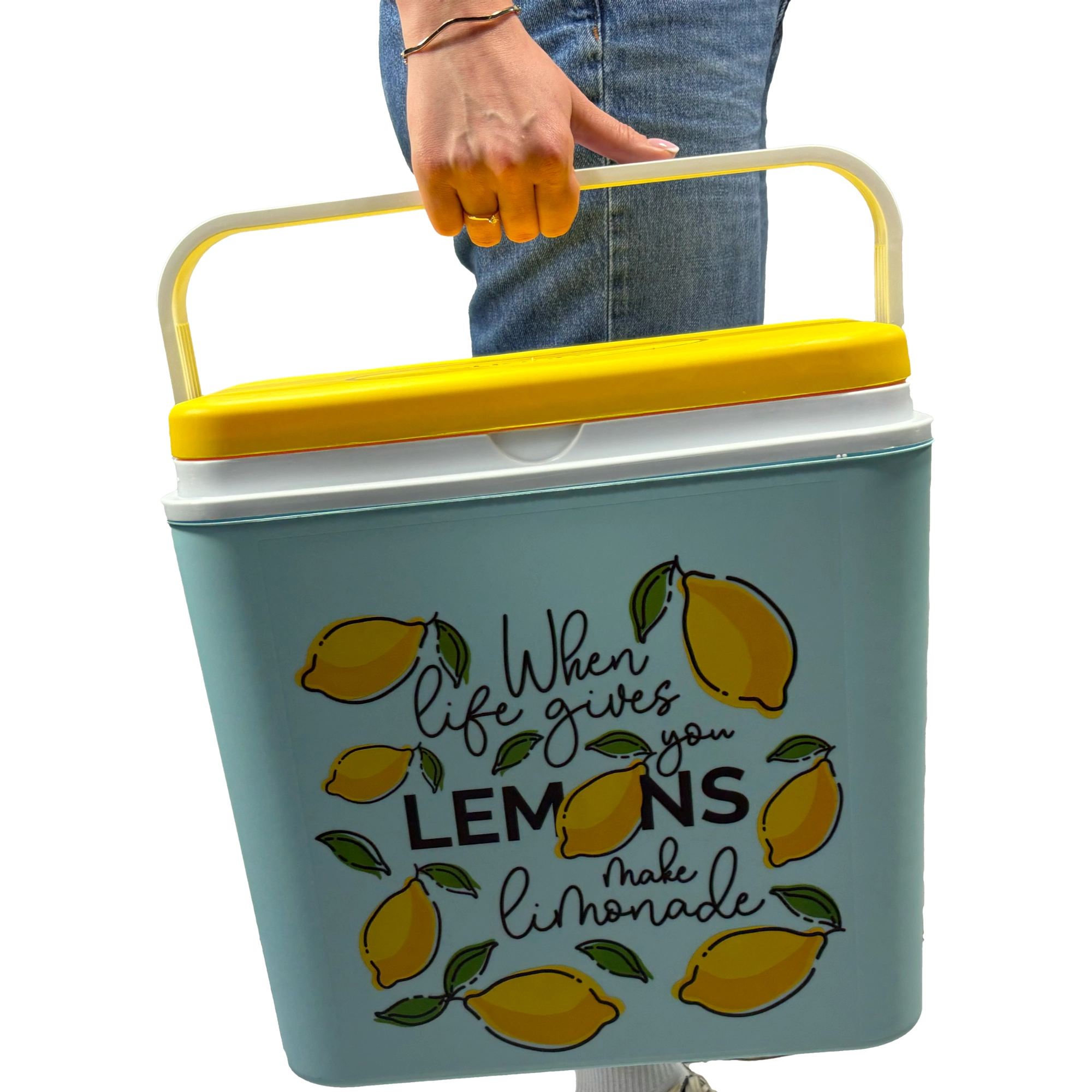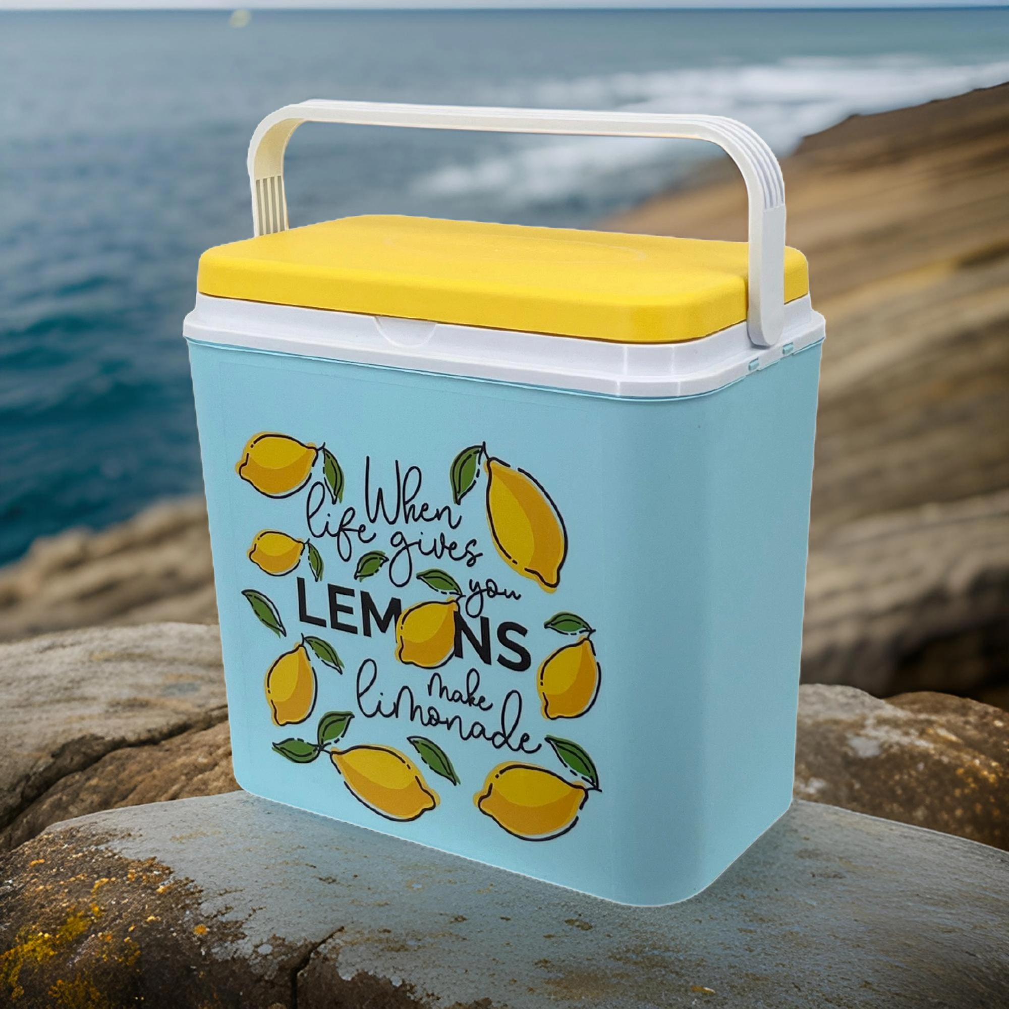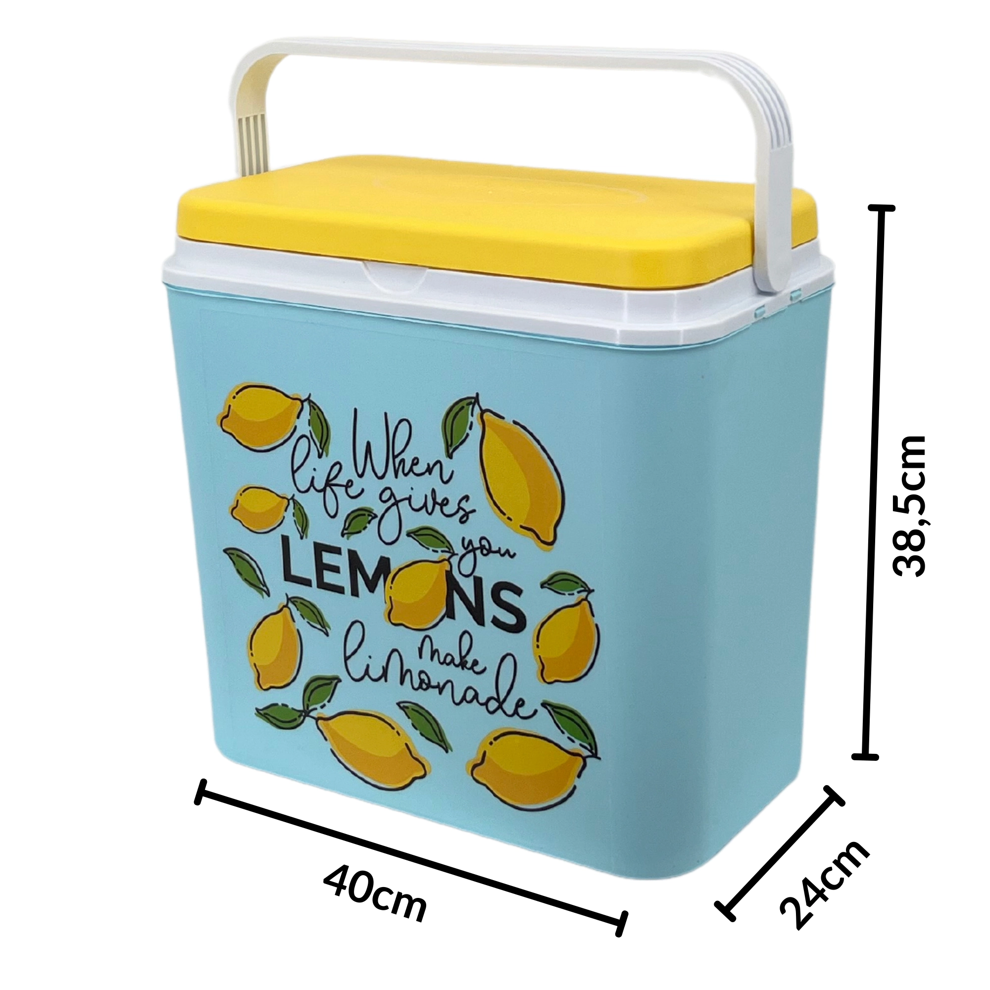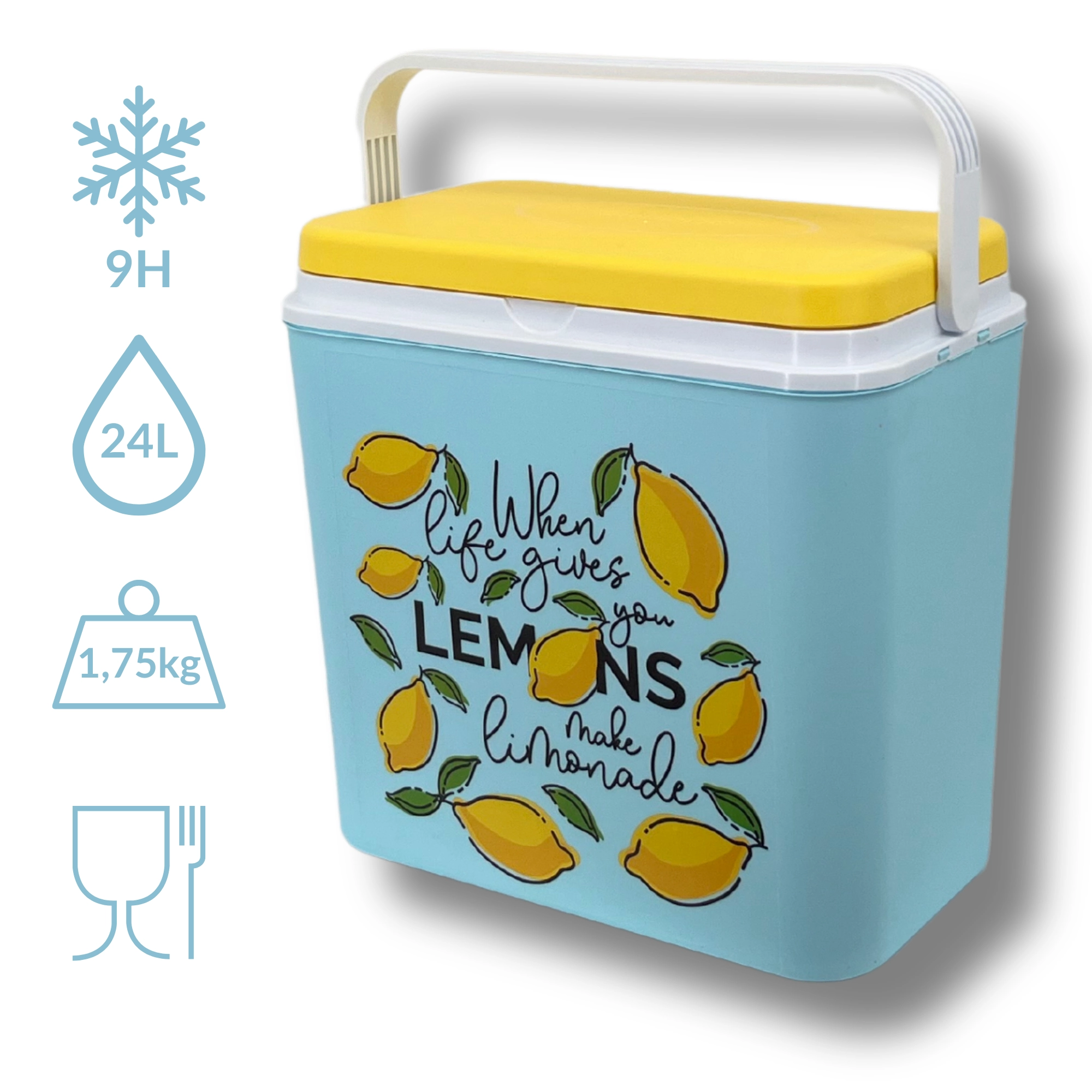 Lightweight passive cooler bag with a 24 l capacity featuring a fresh summer lemon motif keeps your drinks and food cold for a long time on picnics, at the beach, and on trips. It has a sturdy foldable handle with a lock, quality insulation, and is food-safe.