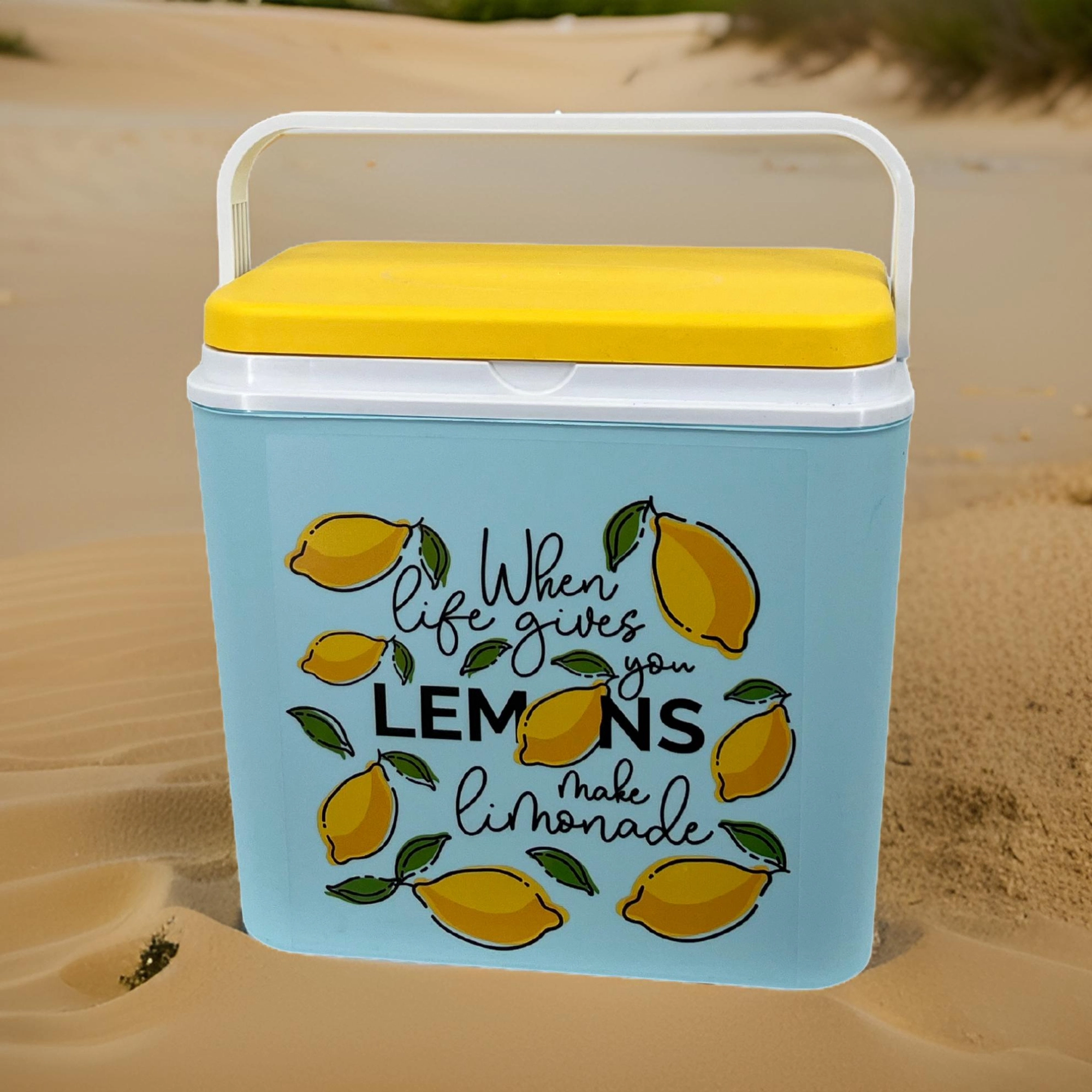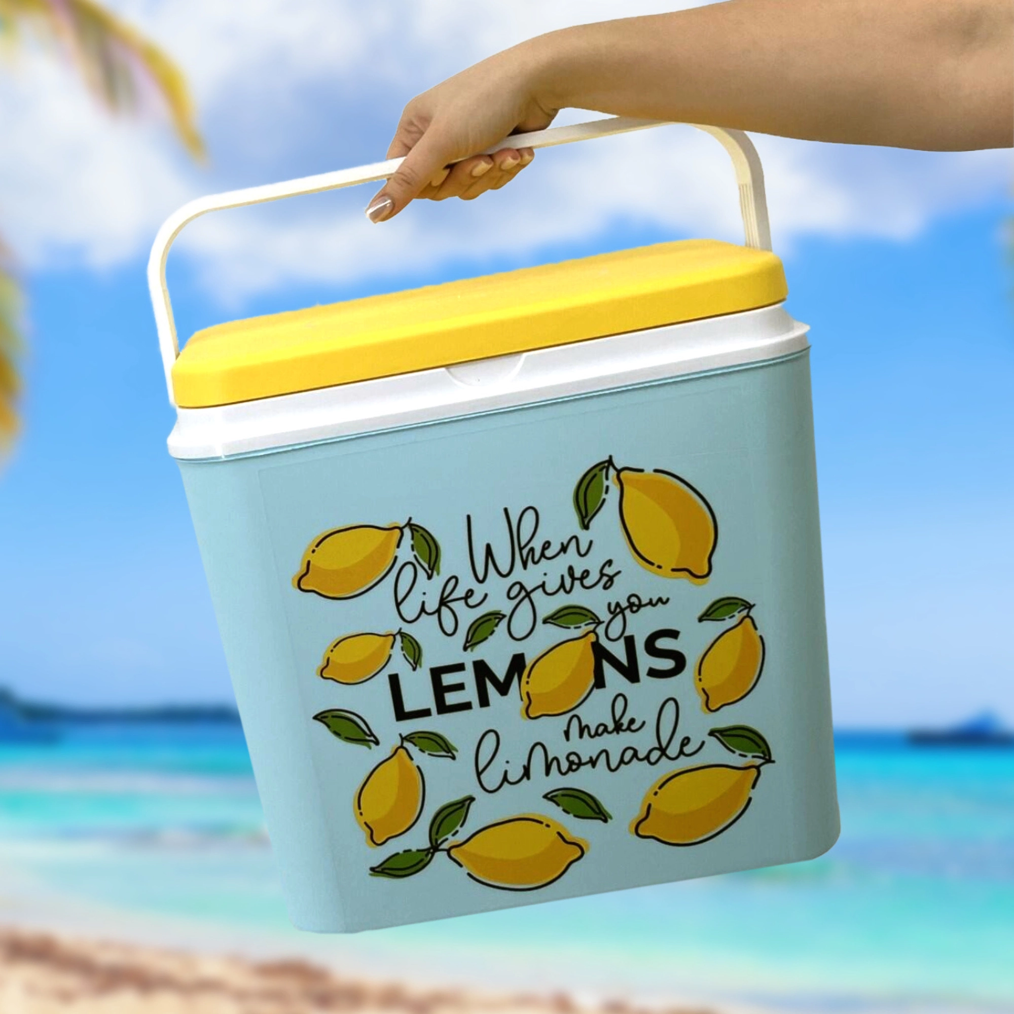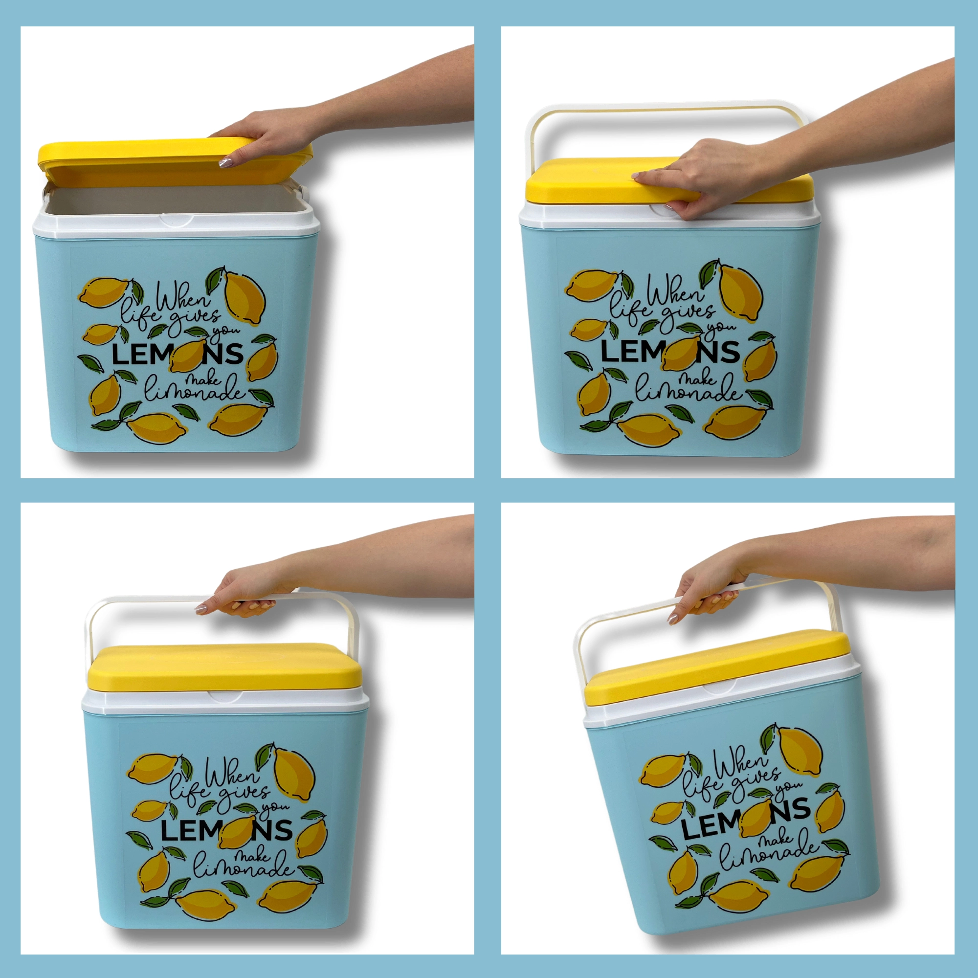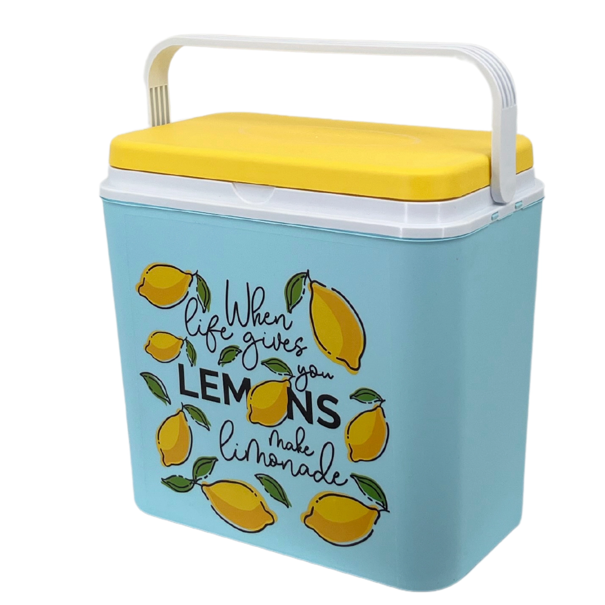 Lightweight passive cooler bag with a 24 l capacity featuring a fresh summer lemon motif keeps your drinks and food cold for a long time on picnics, at the beach, and on trips. It has a sturdy foldable handle with a lock, quality insulation, and is food-safe.