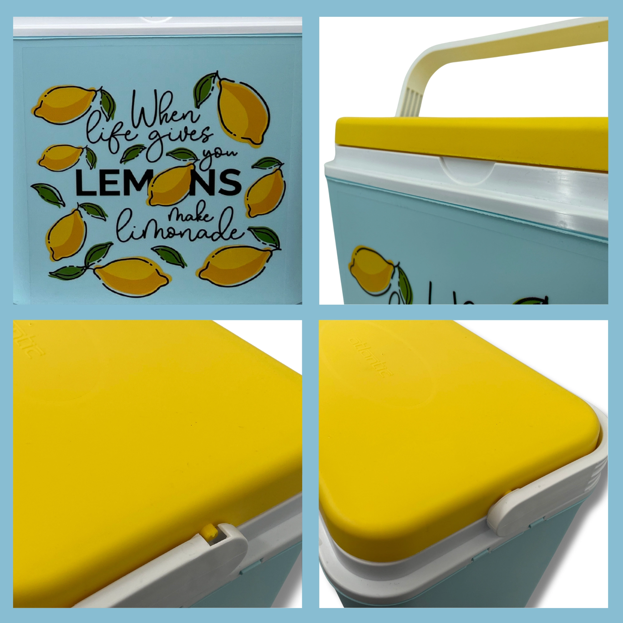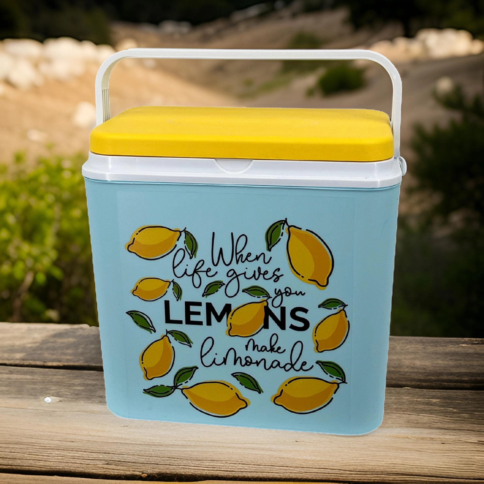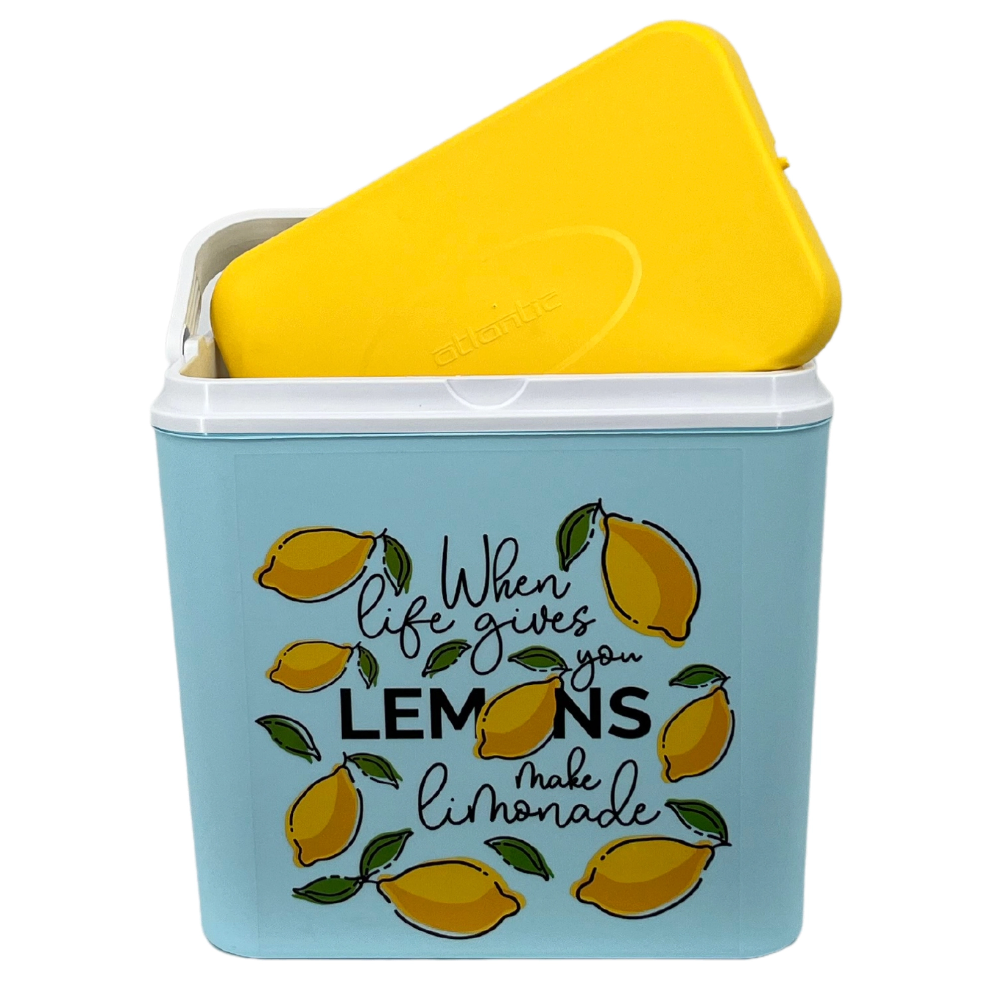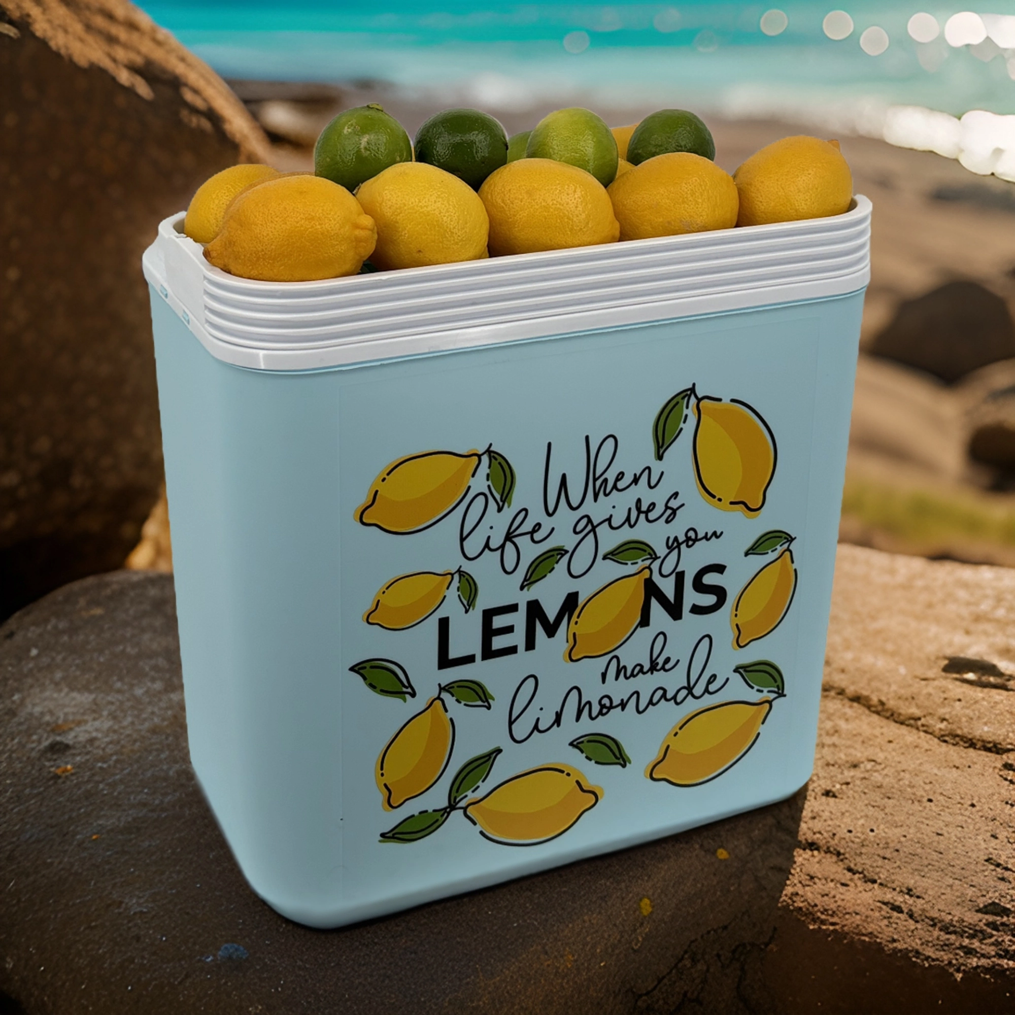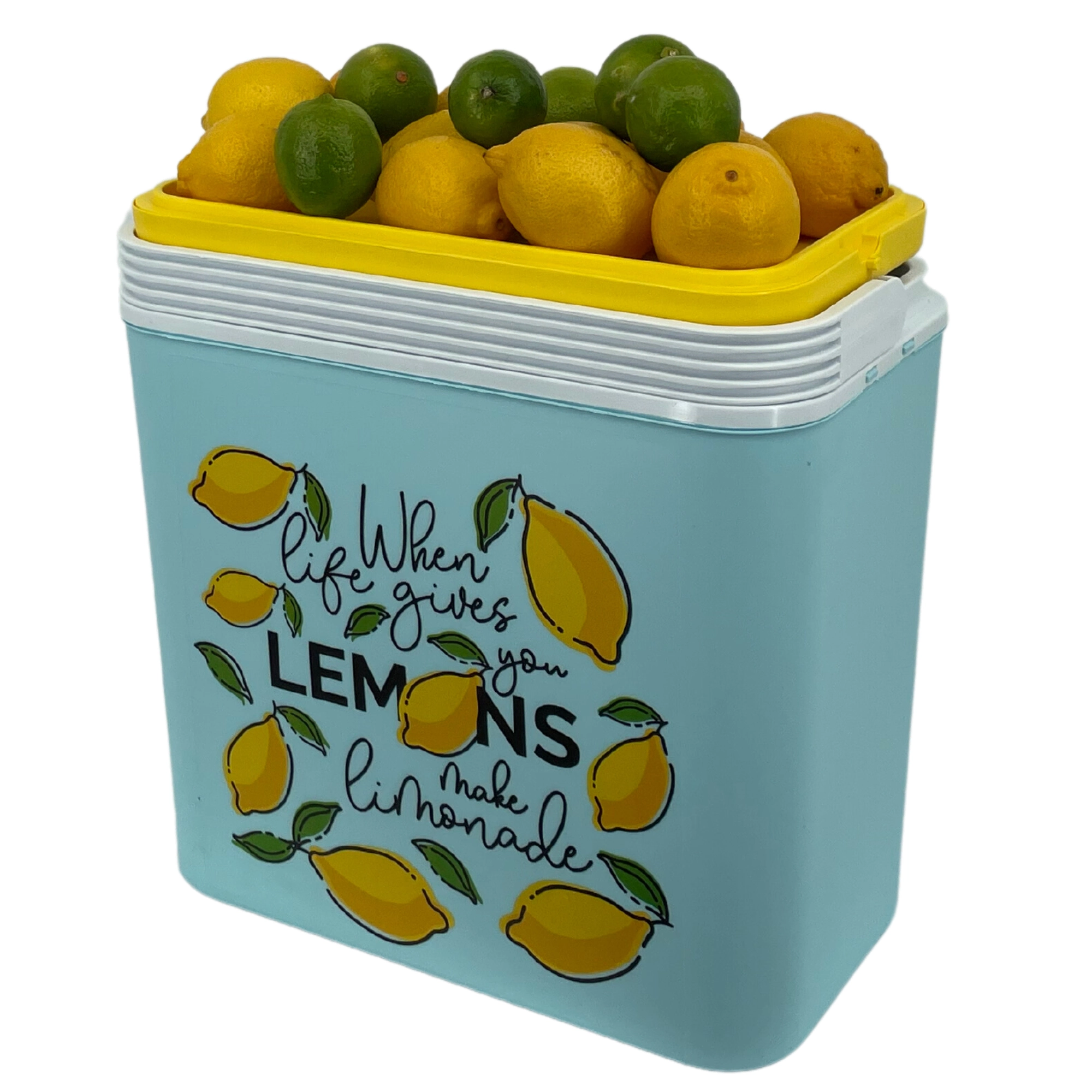 Lightweight passive cooler bag with a 24 l capacity featuring a fresh summer lemon motif keeps your drinks and food cold for a long time on picnics, at the beach, and on trips. It has a sturdy foldable handle with a lock, quality insulation, and is food-safe.