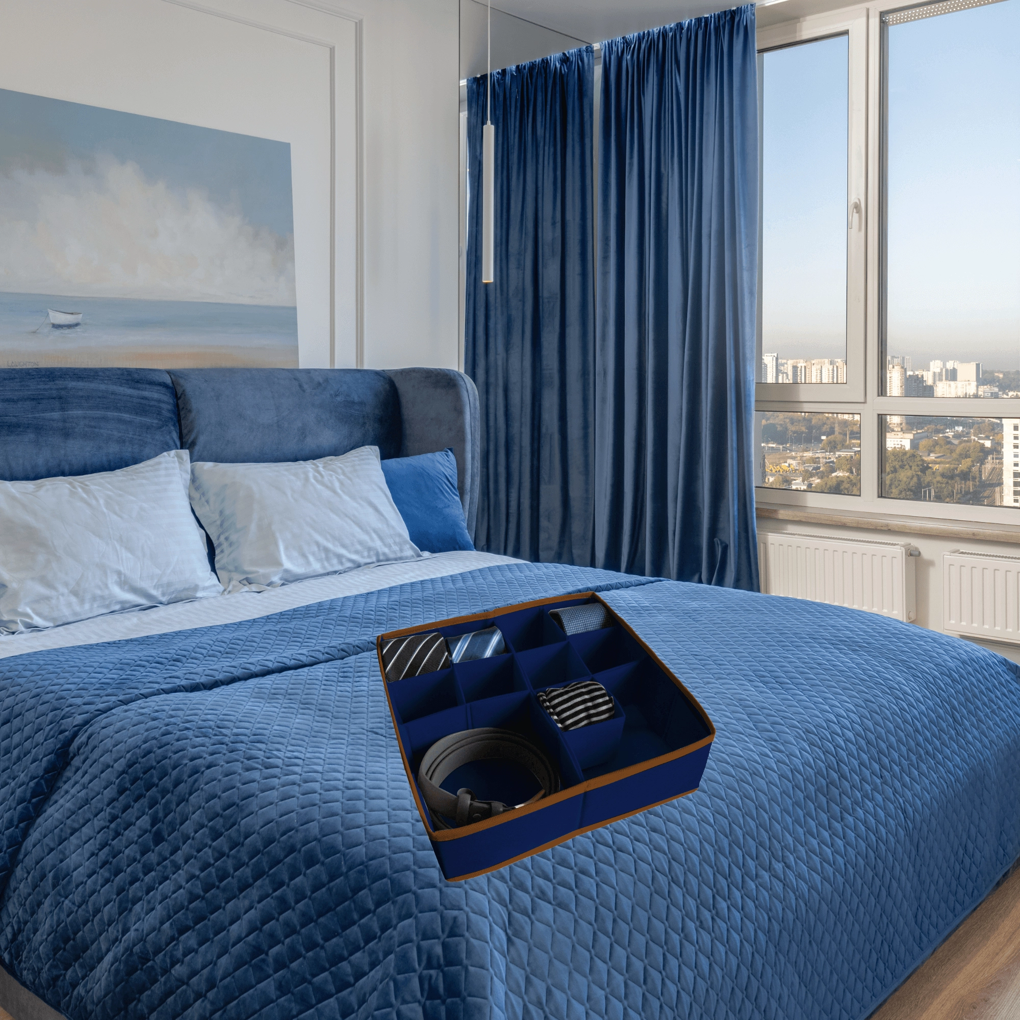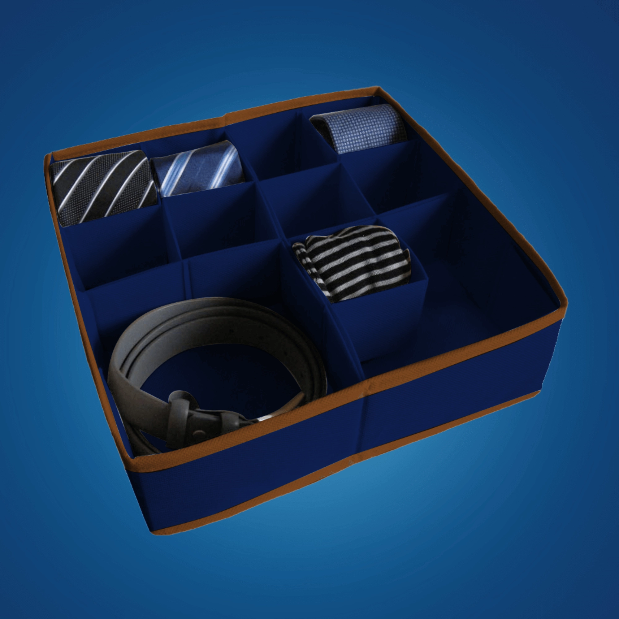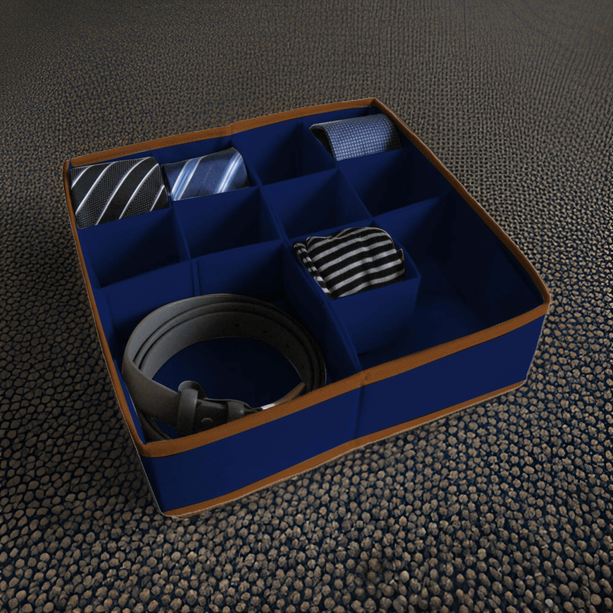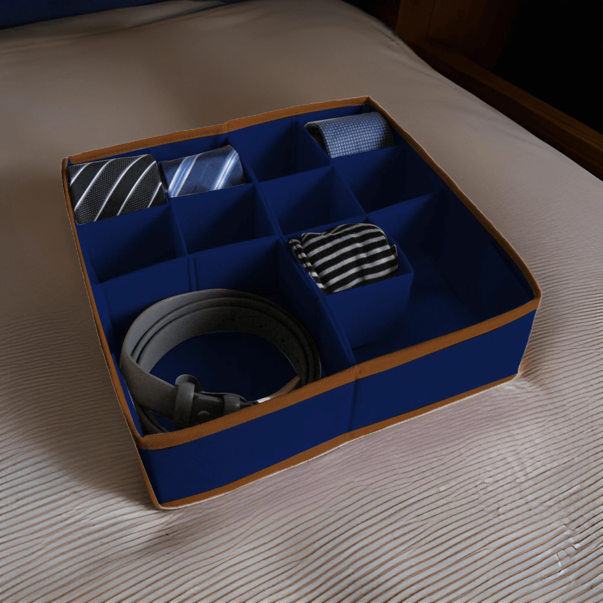 Tidy your drawers in no time. This dark blue organizer made of durable non-woven fabric offers up to 11–16 clear compartments for socks, underwear, belts, or jewelry. Thanks to the modular dividers, you can easily customize the interior layout and keep items clean, sorted, and within reach.