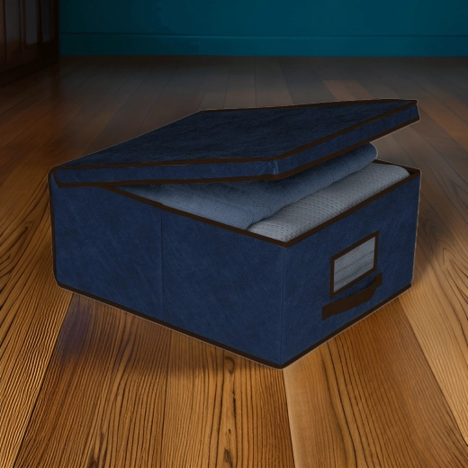 The blue storage box measuring 48 × 36 × 19 cm is made of durable non-woven fabric that is lightweight, breathable, and easy to maintain. The integrated lid holds its shape, protects from dust, and keeps stored items clean. The front transparent window and label holder allow quick identification of the contents without opening.