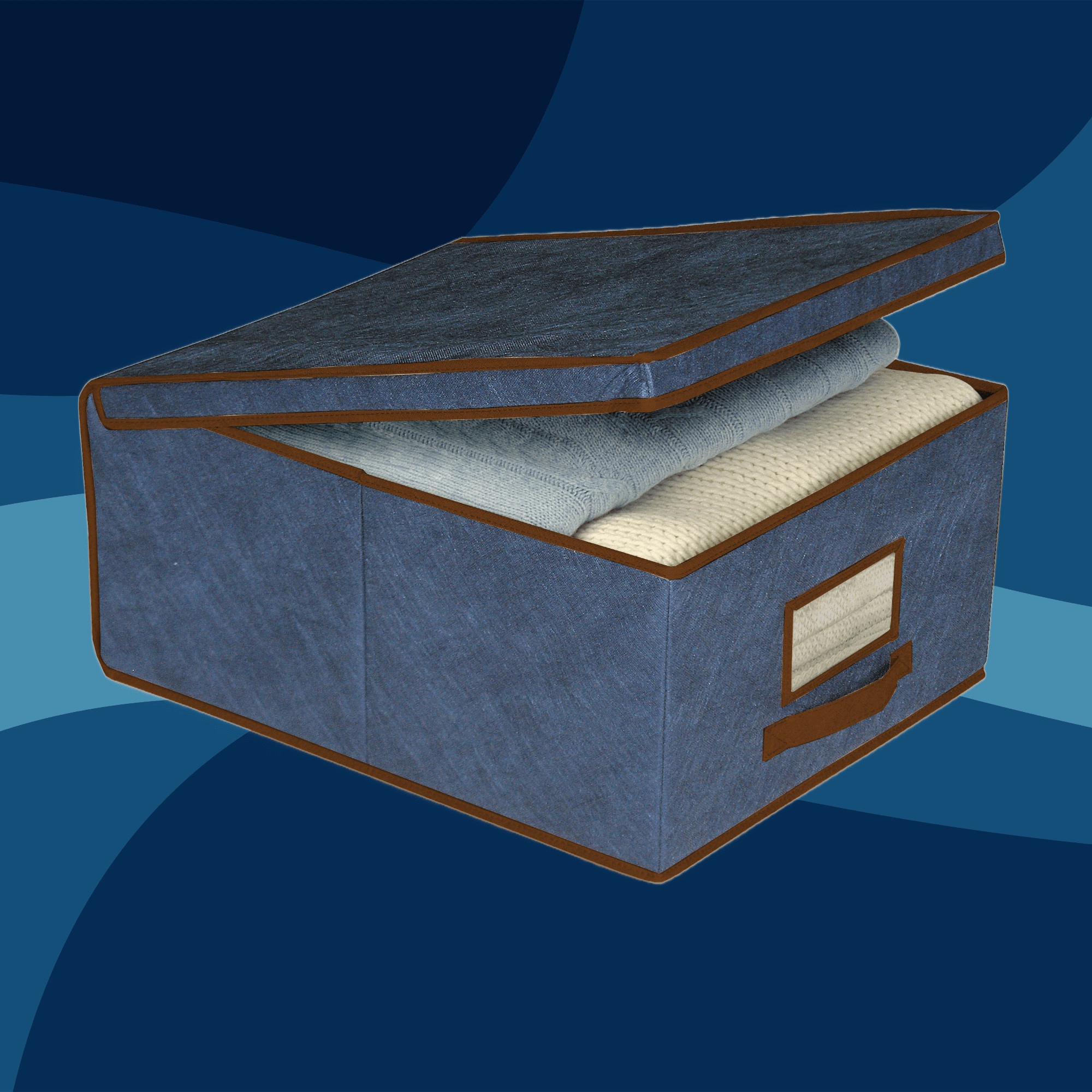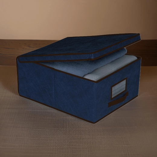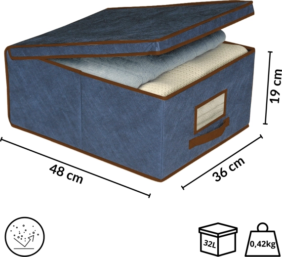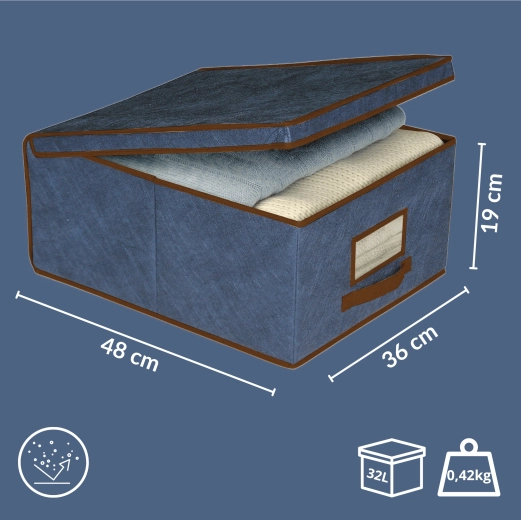 Thanks to the sturdy front handle, you can easily pull the box out from a shelf or the top sections of a wardrobe. It’s ideal for storing seasonal clothing, bed linen, blankets, sweaters, toys, and accessories. The elegant dark blue color with subtle trim suits any interior.