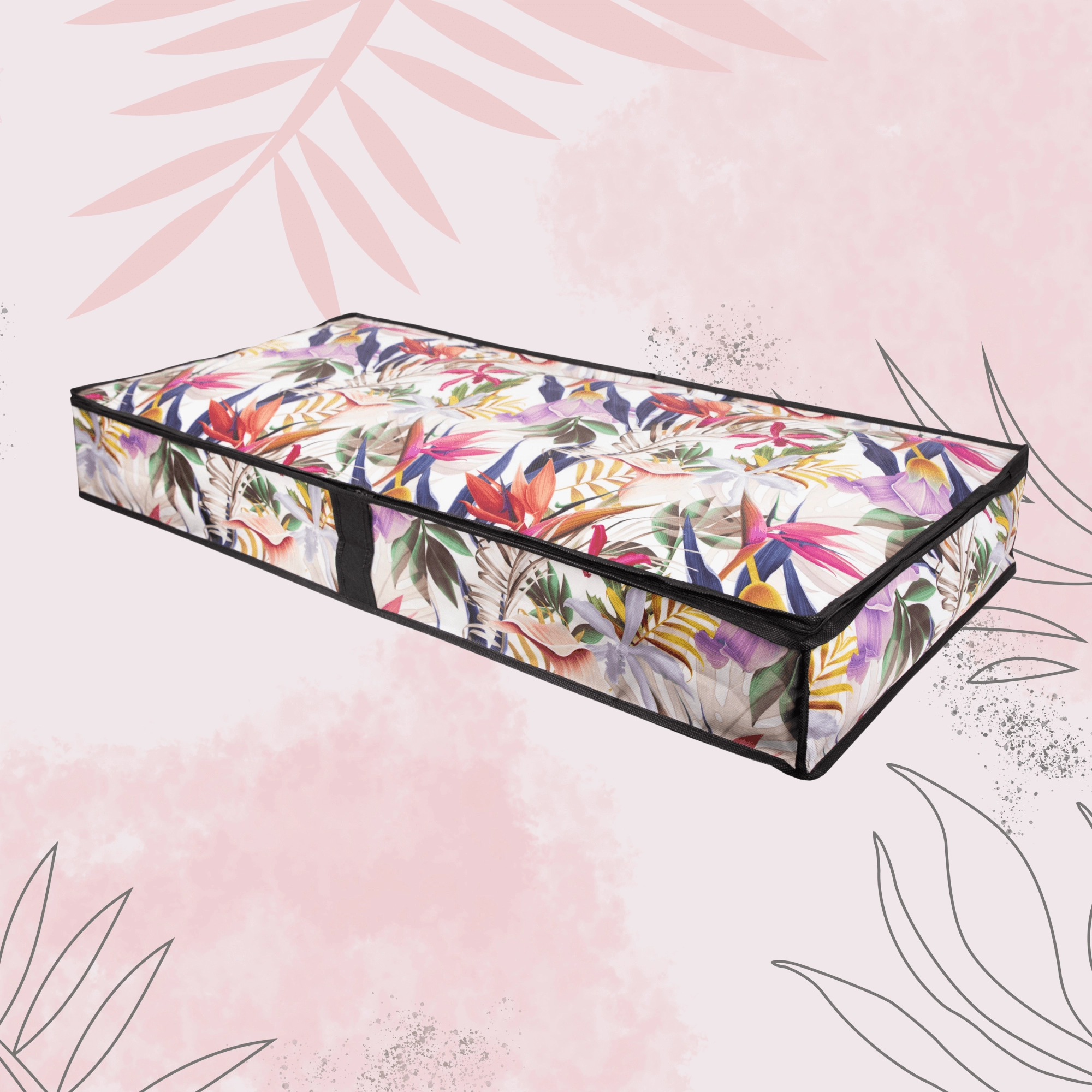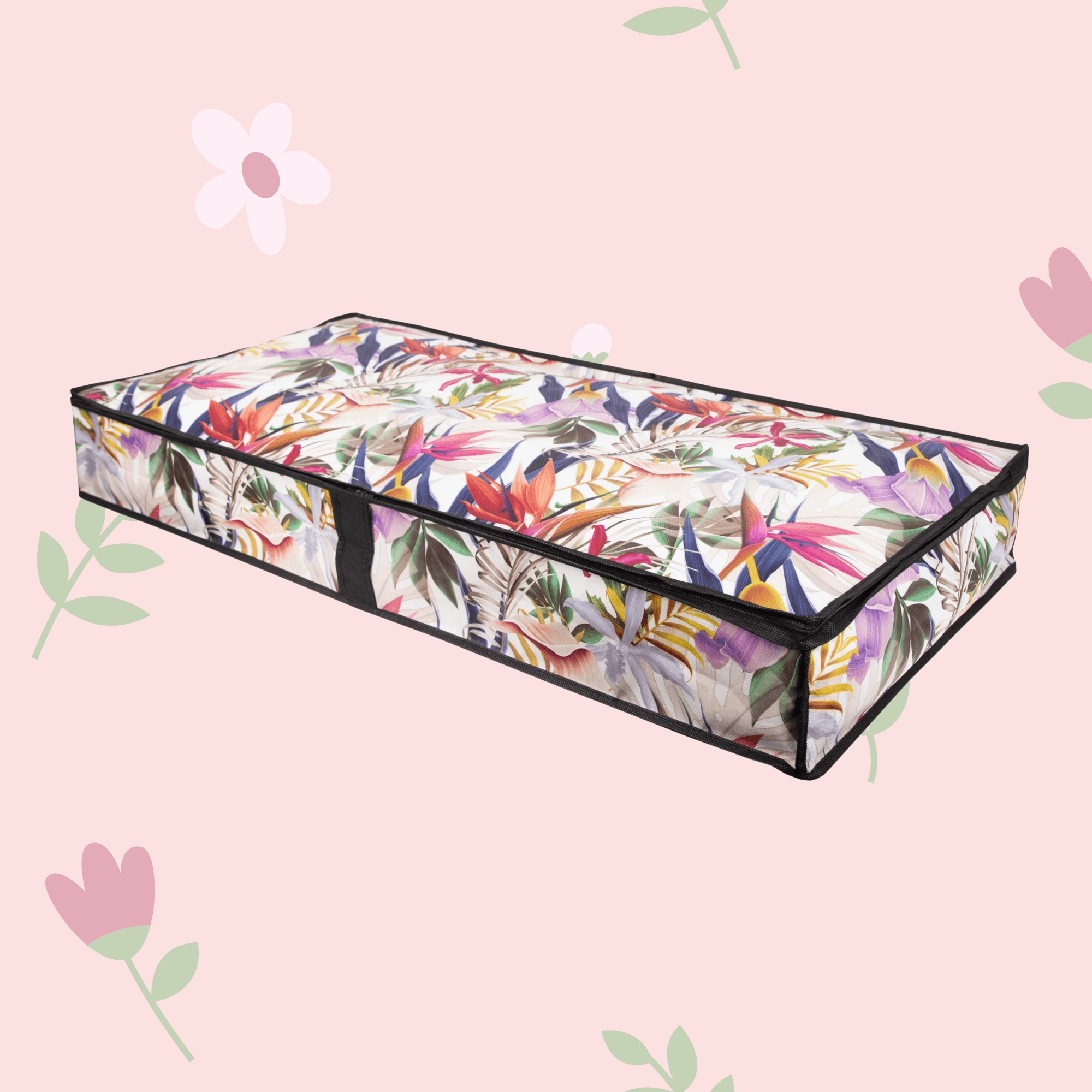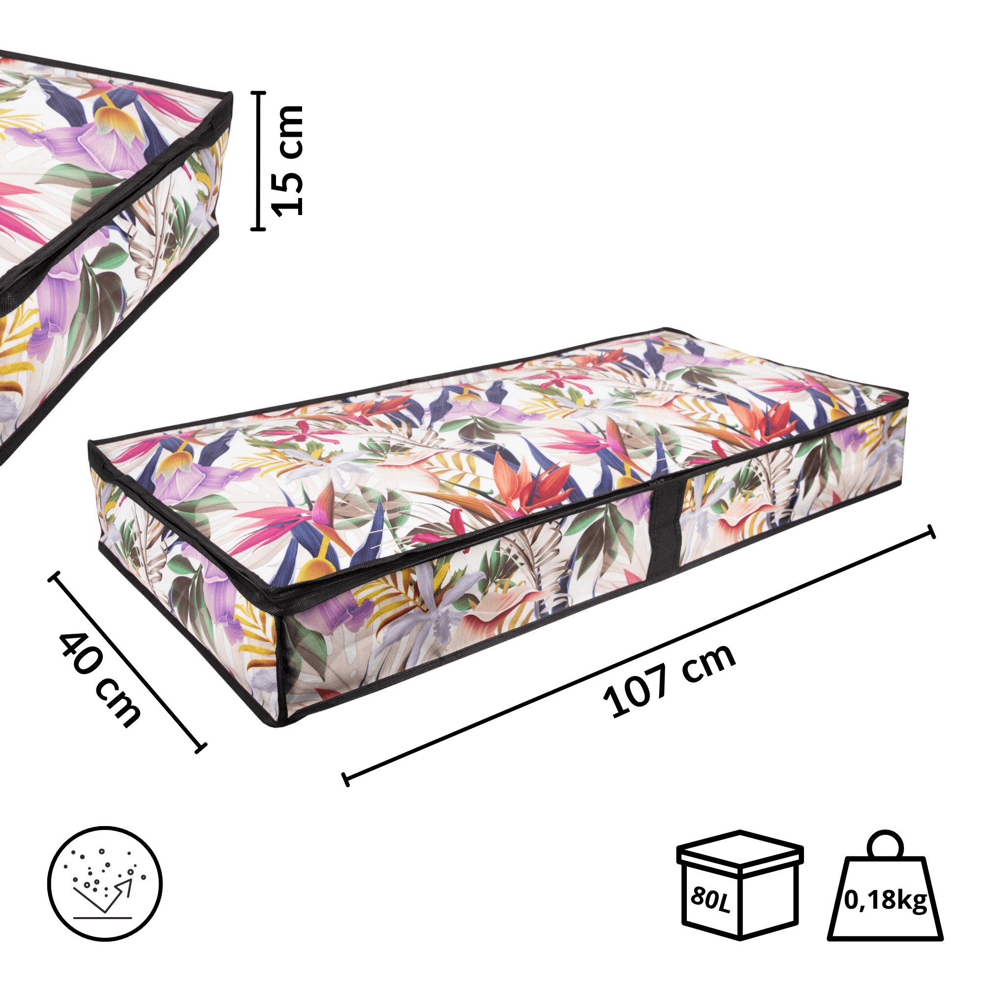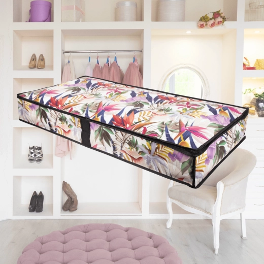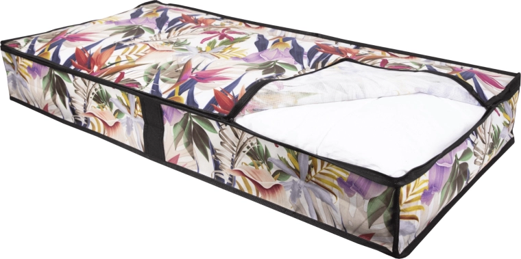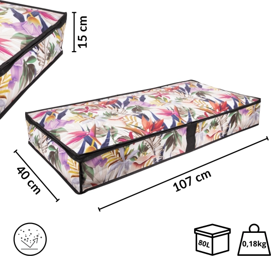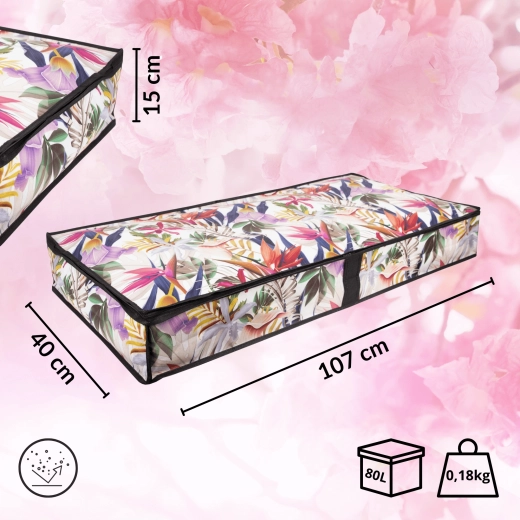 Make the most of every centimeter. The low-profile storage box measuring 107 × 50 × 15 cm slides smoothly under the bed or onto a closet shelf, keeping your textiles neatly organized and protected from dust. The floral print adds a fresh, stylish accent to your interior.