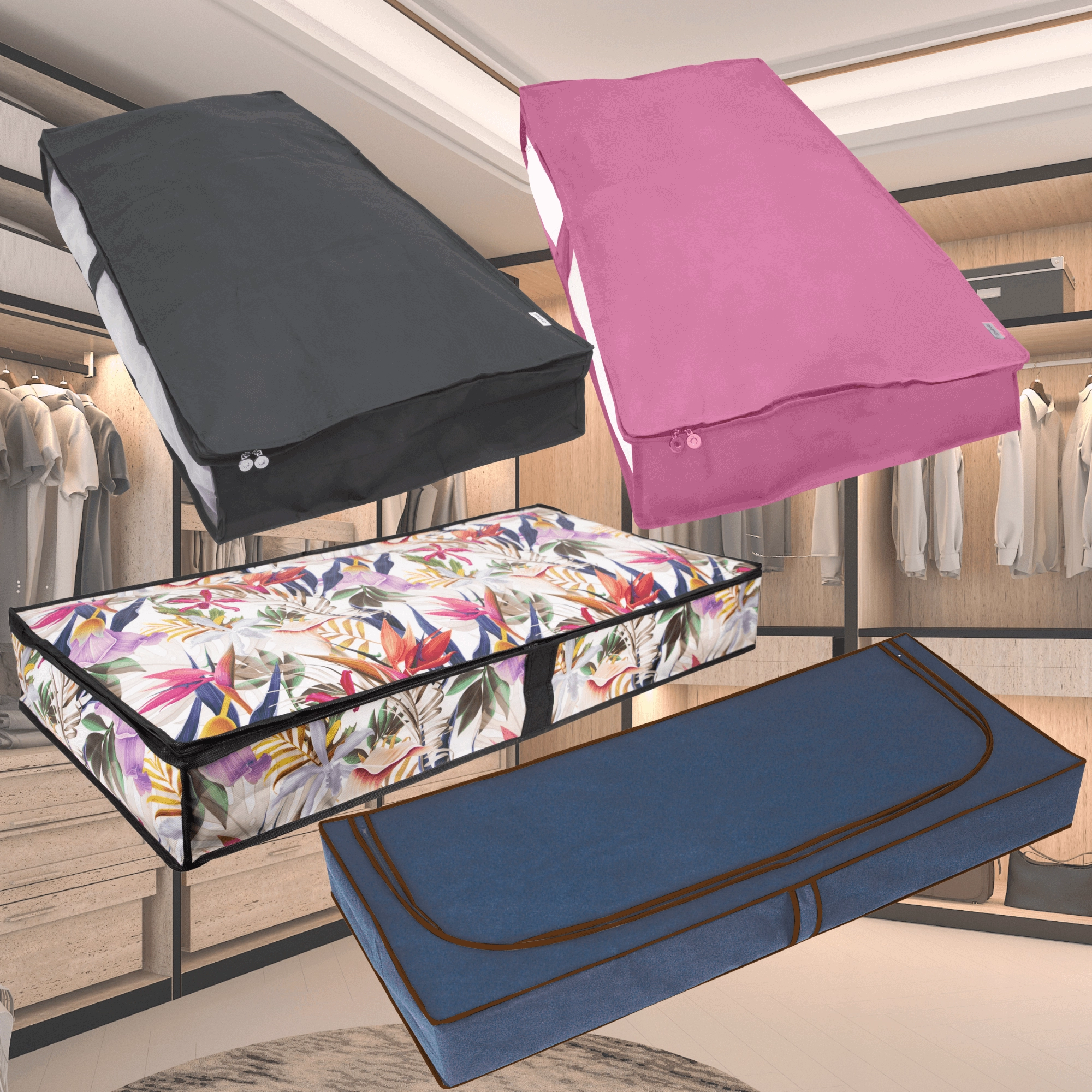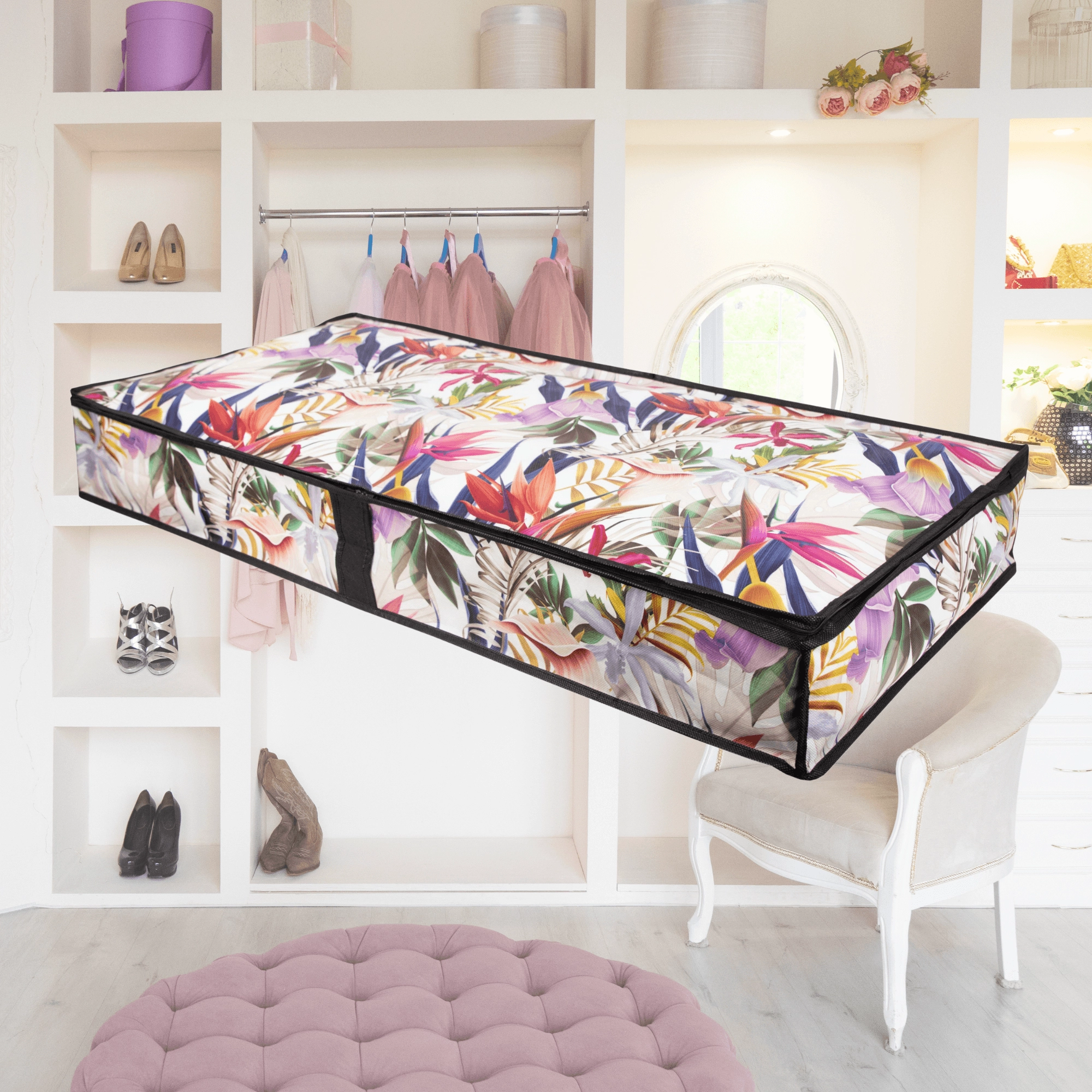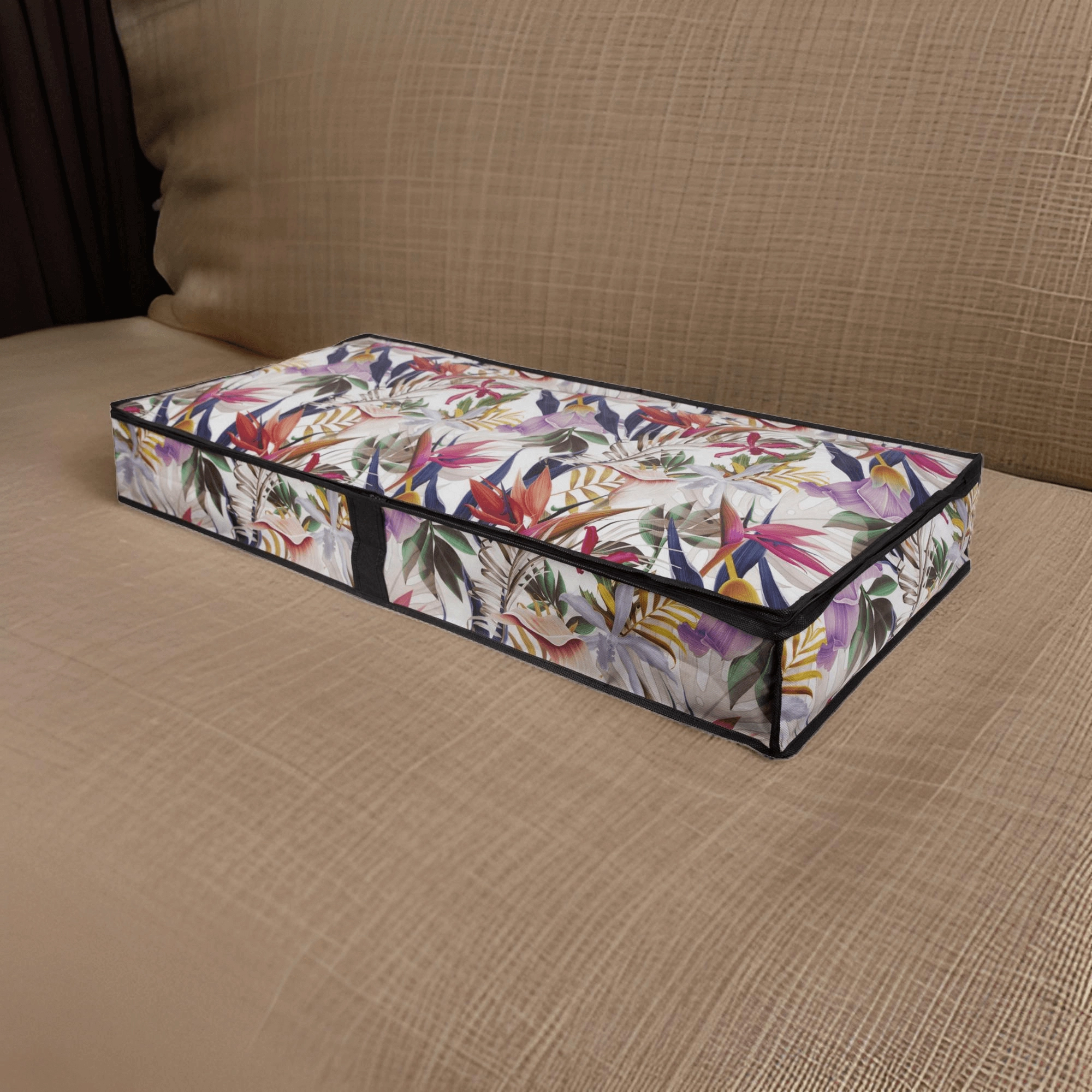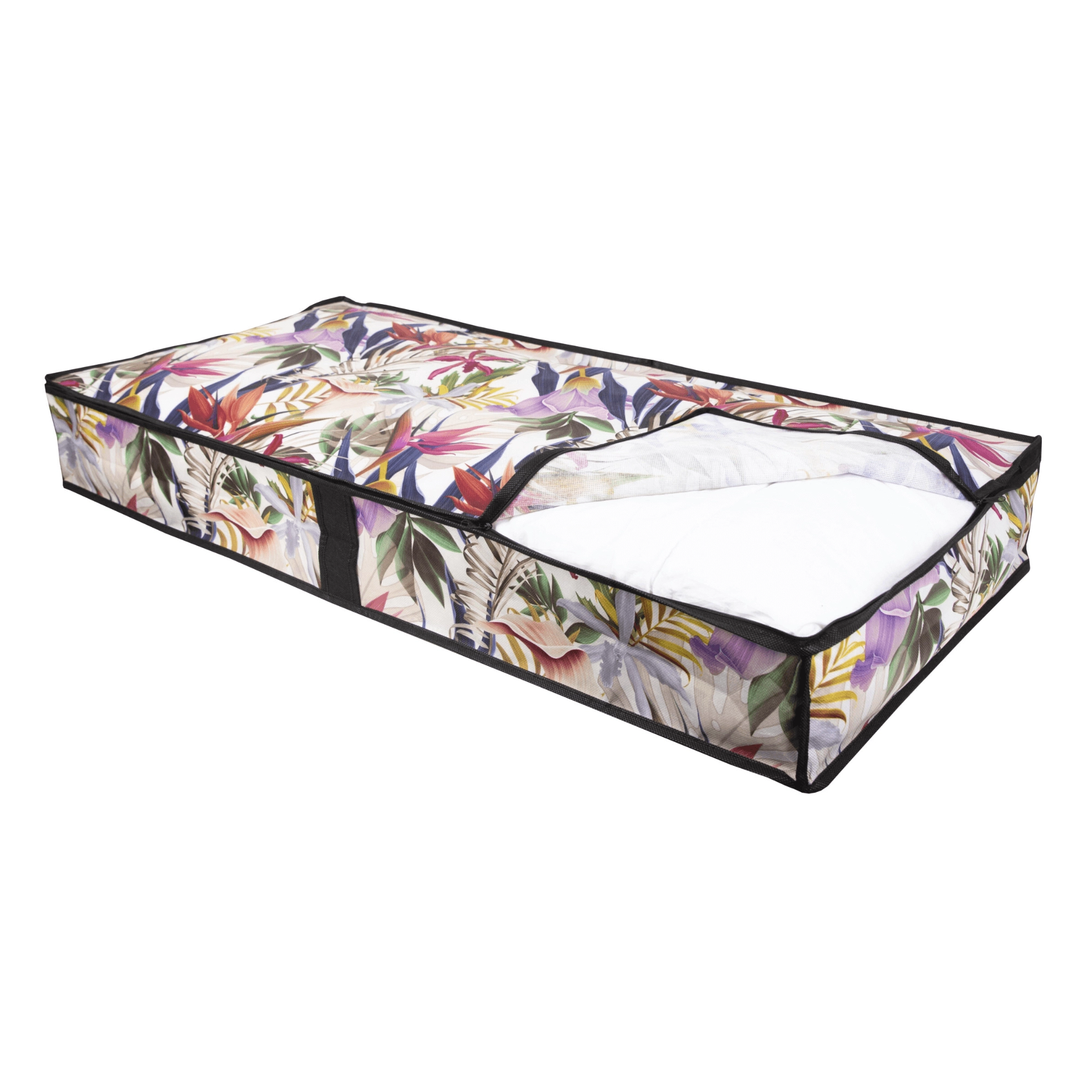 Make the most of every centimeter. The low-profile storage box measuring 107 × 50 × 15 cm slides smoothly under the bed or onto a closet shelf, keeping your textiles neatly organized and protected from dust. The floral print adds a fresh, stylish accent to your interior.