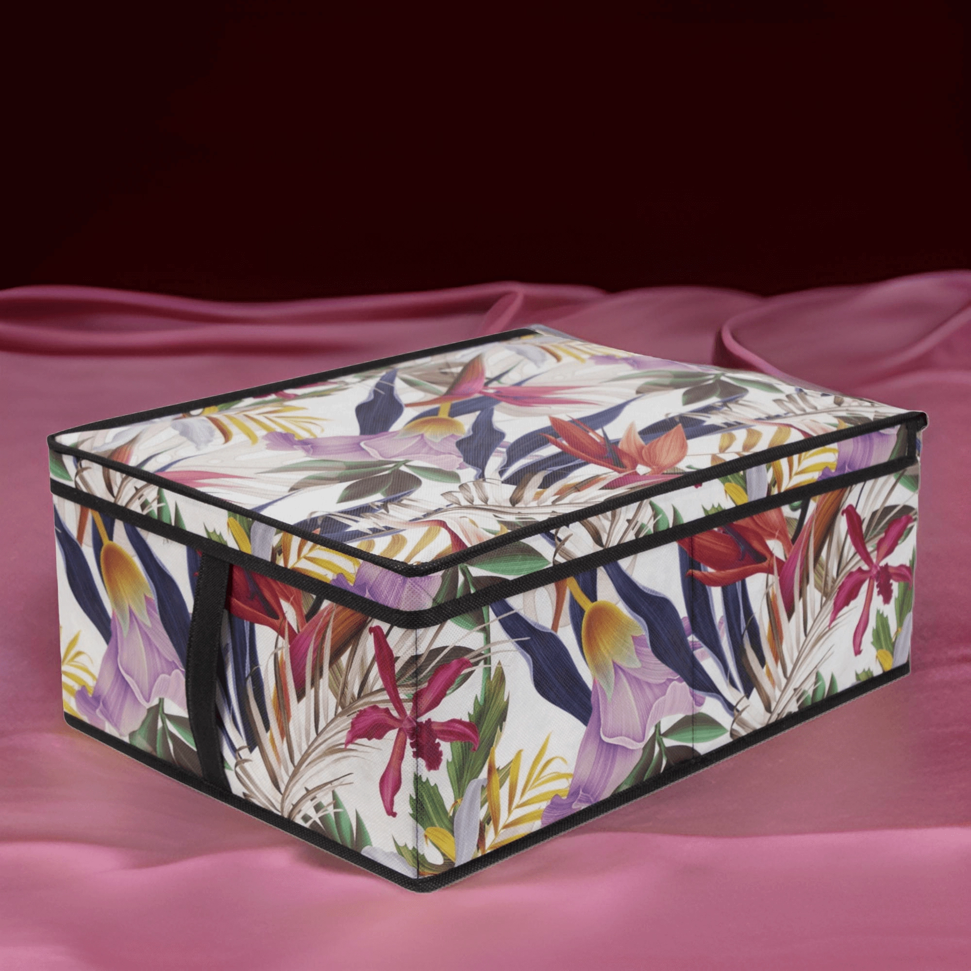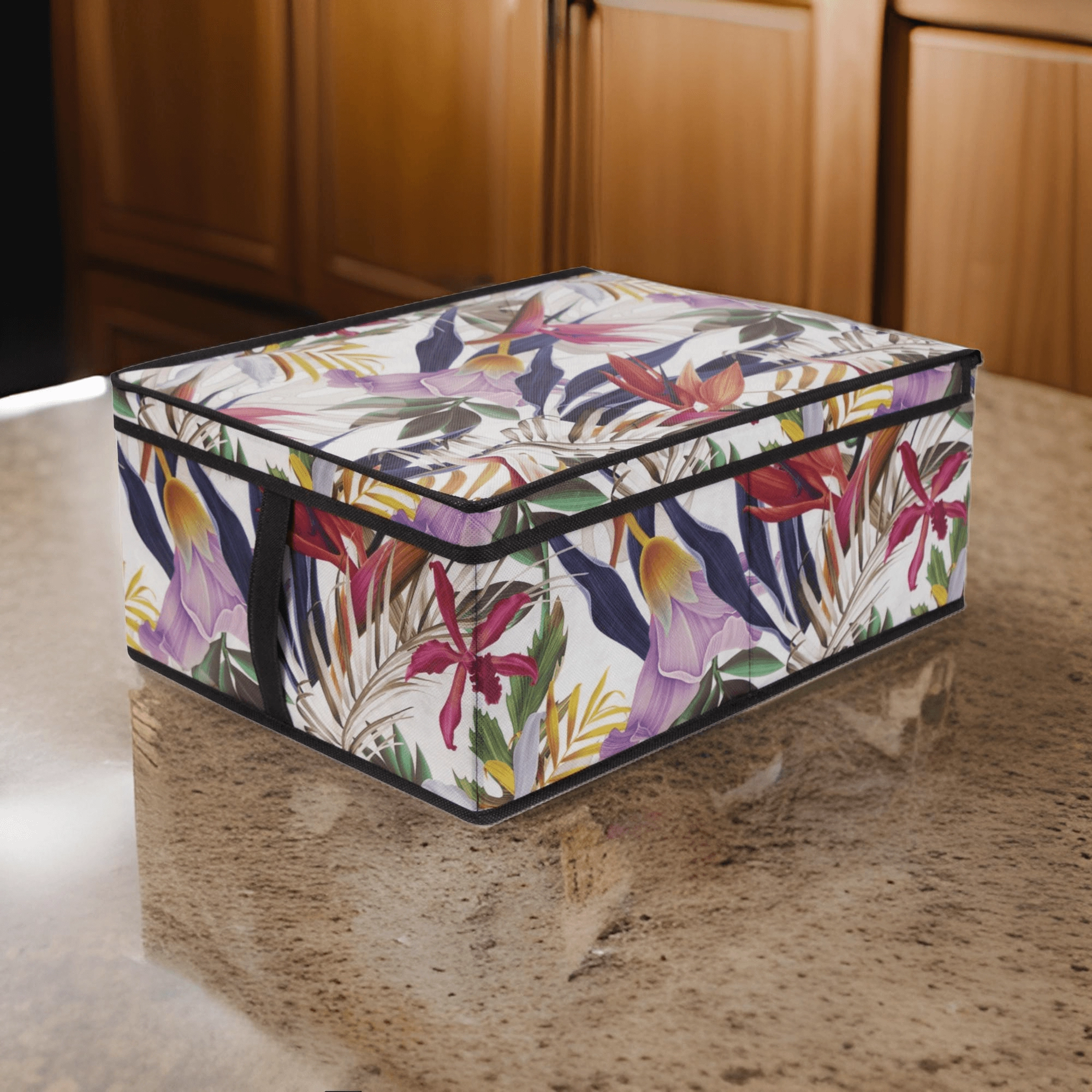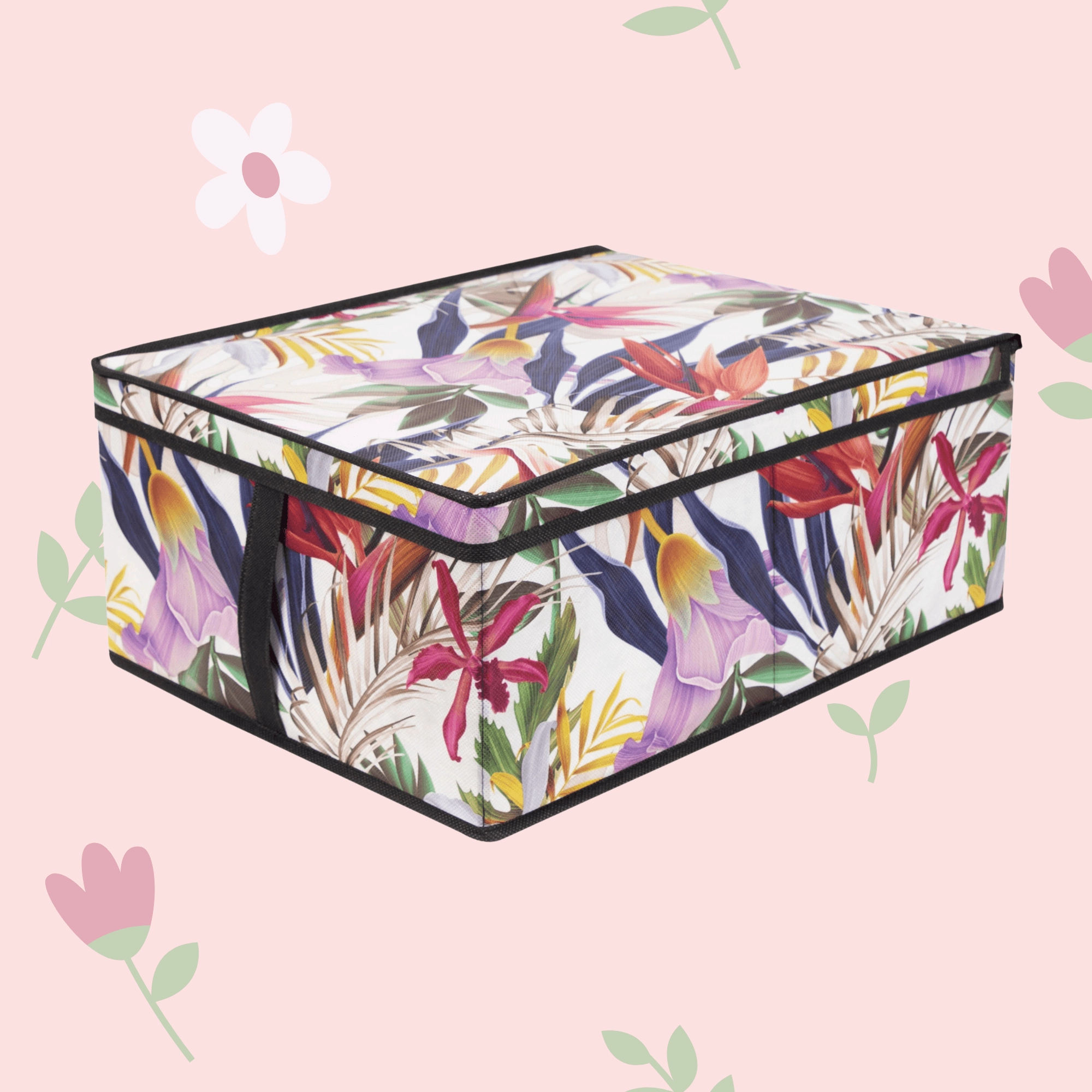 A stylish storage box with a tropical floral pattern helps keep any room tidy. With dimensions of 48 × 36 × 19 cm, it’s ideal for clothing, bedding, toys, and accessories. It has a zippered lid to keep out dust, side handles for easy carrying, and a foldable construction that saves space when not in use. Made from durable PET non-woven material in a multicolored floral design.