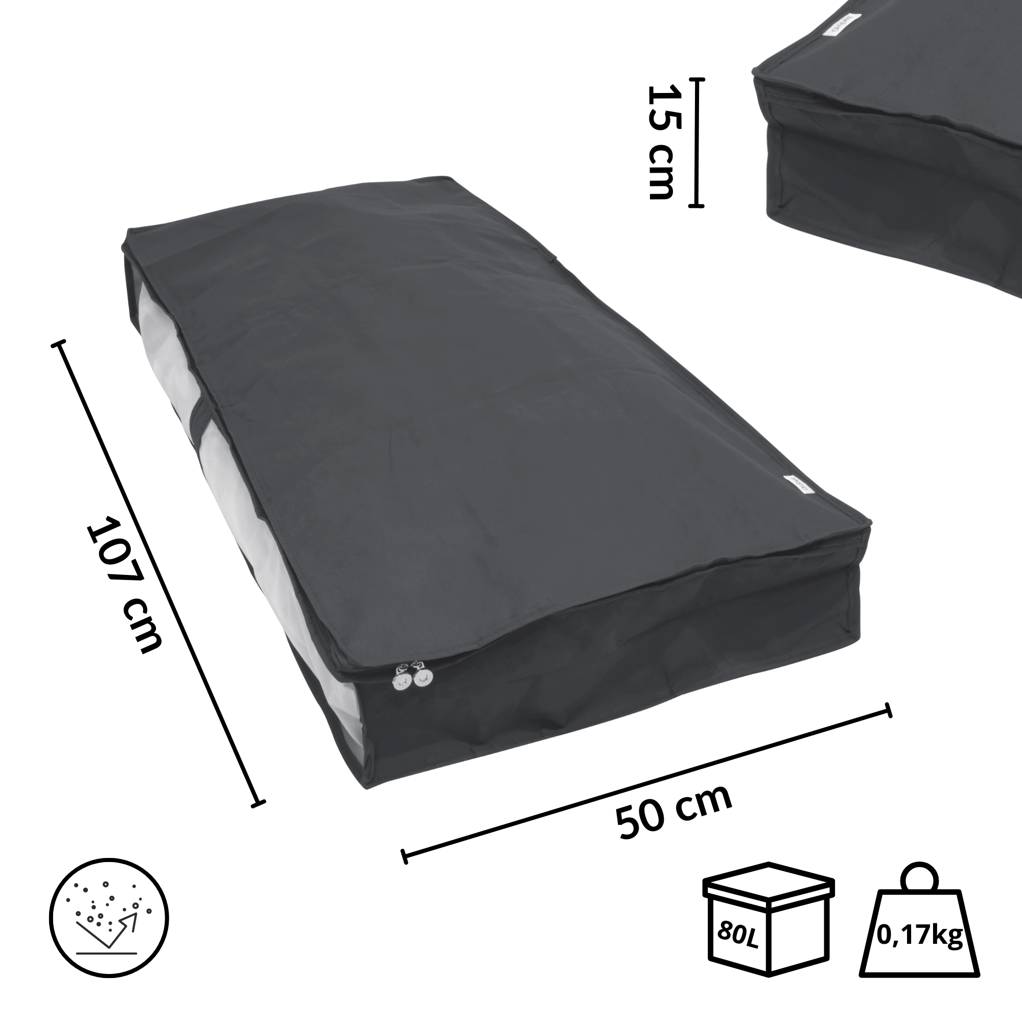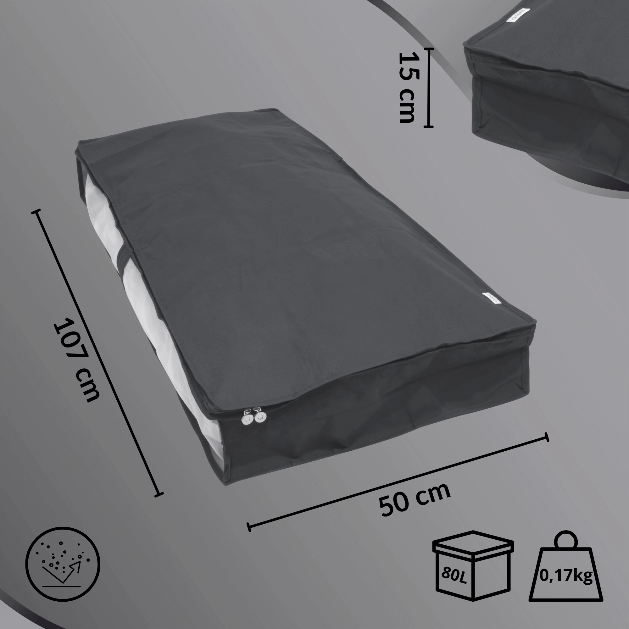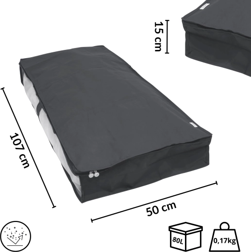 The versatile gray finish suits any interior while effectively protecting stored items from dust. Dimensions 107 × 50 × 15 cm are perfect for duvets, blankets, sweaters, or seasonal clothing.