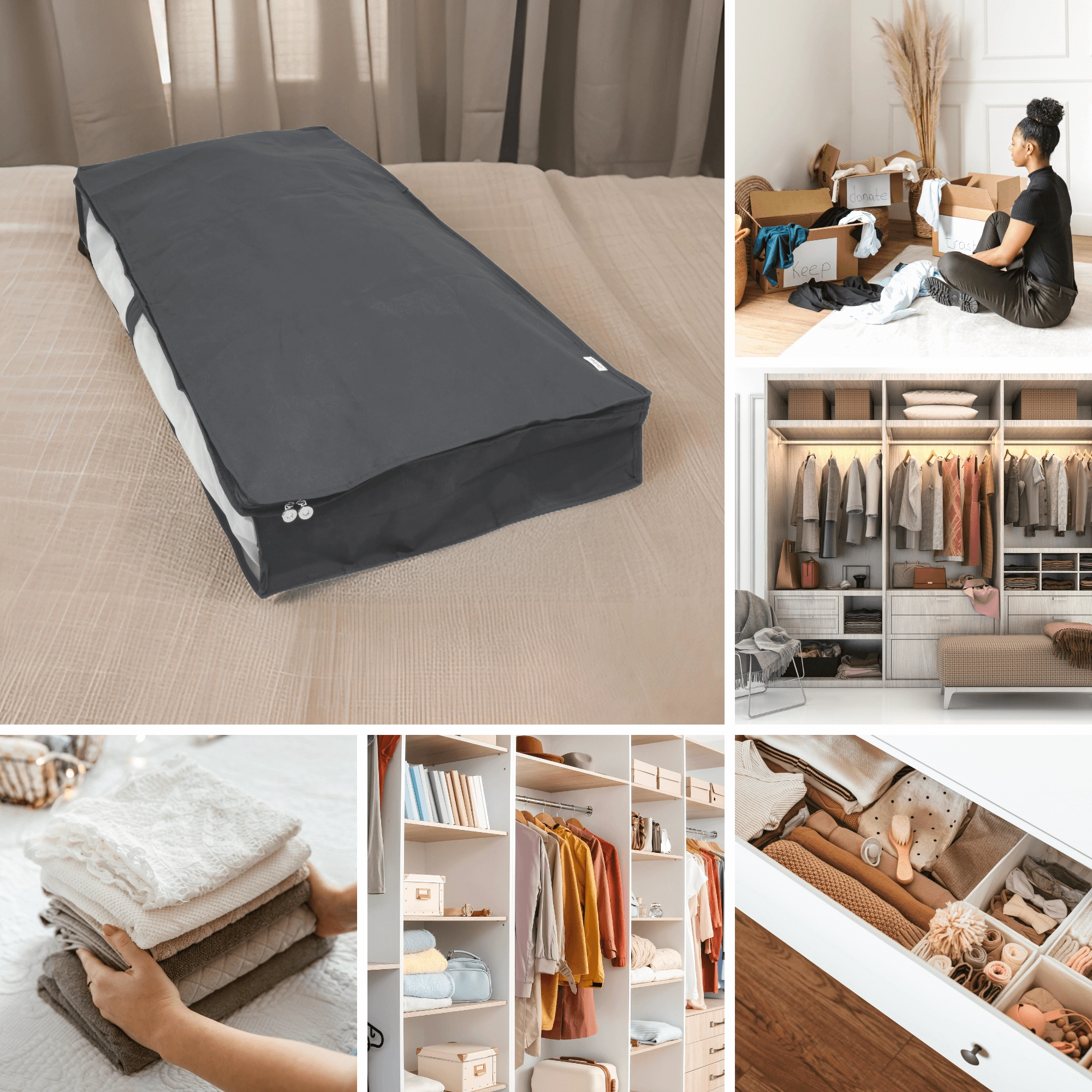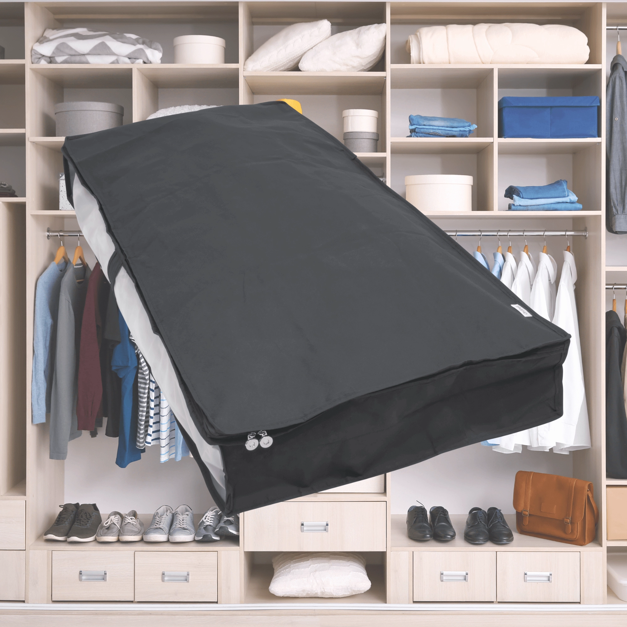 • Space-saving: low profile for under-bed, closet, or shelf storage.