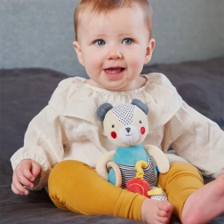 The Petit Collage bear with teether stands out for its quality craftsmanship and gentle materials. It combines soft fabric with a wooden ring to provide comfort for cuddling and relief while chewing. Thanks to its thoughtful textures and colors, it supports tactile, visual, and motor development from the very first days.