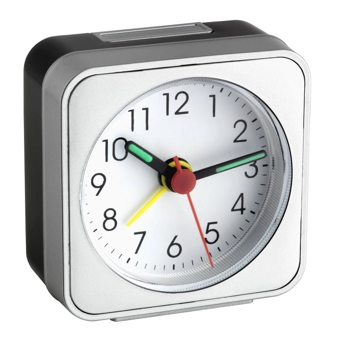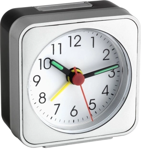 The compact TFA electronic alarm clock offers silent Sweep operation without distracting ticking, a clear analog dial, and luminous hands for easy time reading in the dark. Lightweight and practical, ideal for the nightstand and for travel.