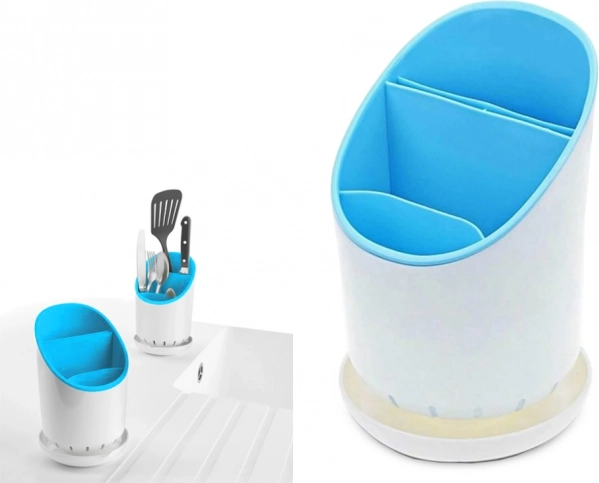 The utensil organizer offers three main compartments for grouping similar items during drying. It features a shallow compartment for smaller items like spoons and has a special knife slot and layered compartments.