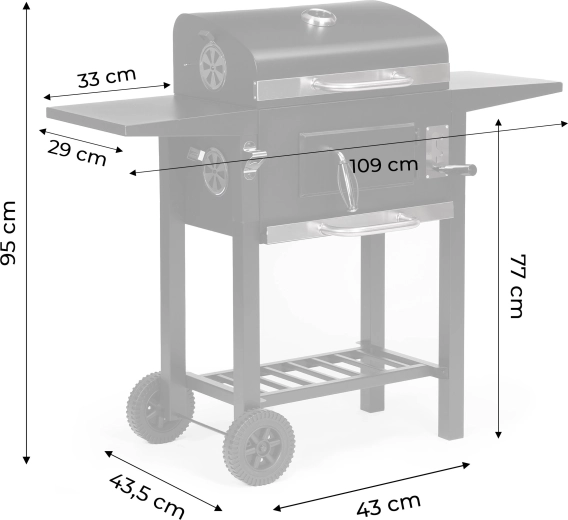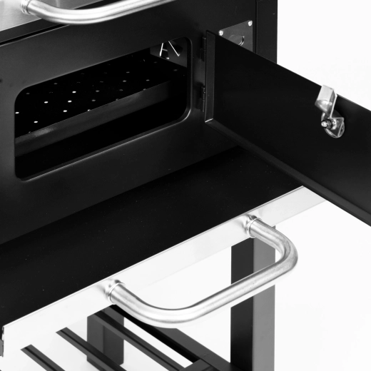 The main grate of 45×33 cm is complemented by a top warming rack of 38×19 cm to keep prepared food warm. Two side shelves of 33×29 cm provide space for seasonings and accessories, and the bottom storage grid improves workflow organization. Thanks to the pull-out ash drawer, maintenance is quick and clean, and the front firebox door makes adding charcoal easy during grilling.