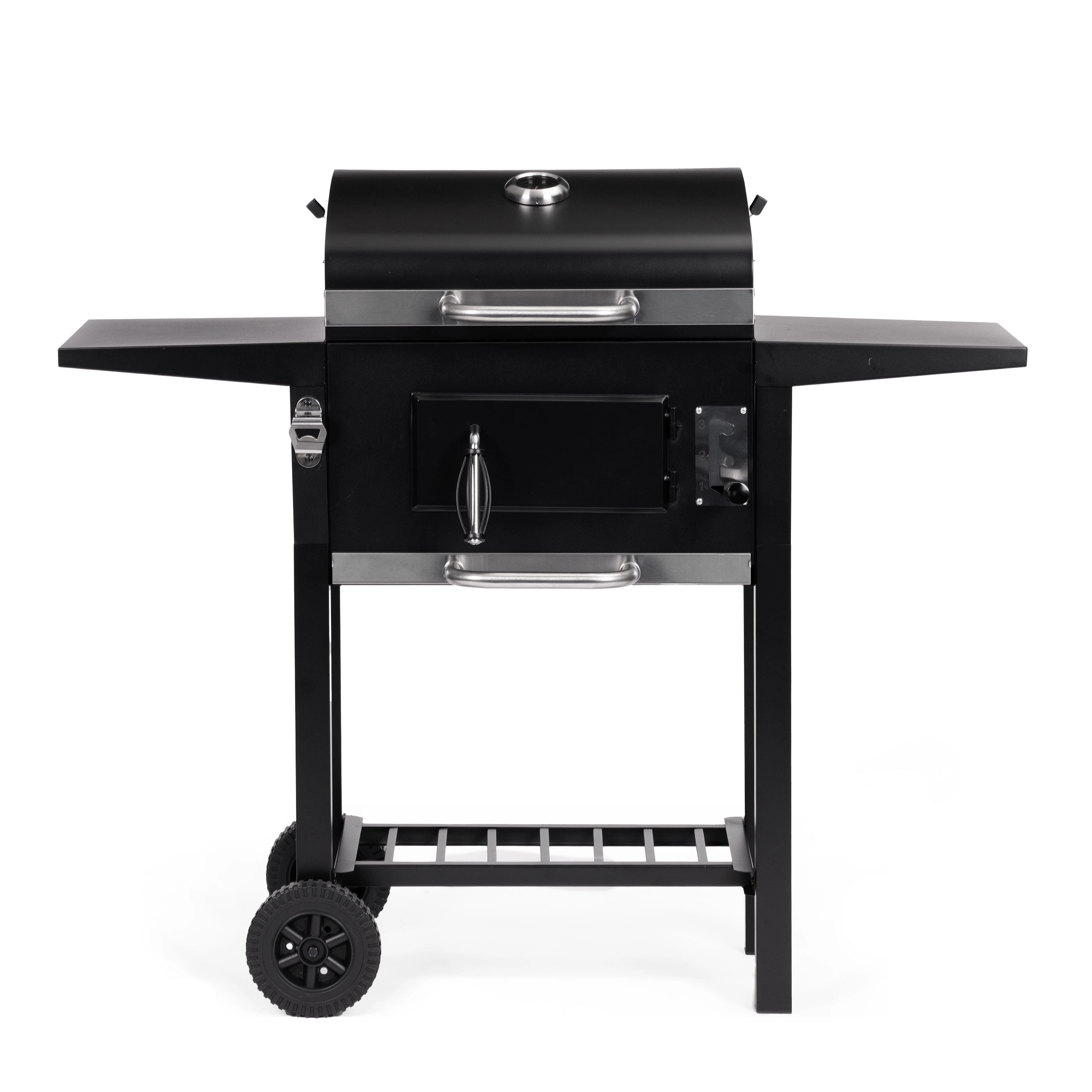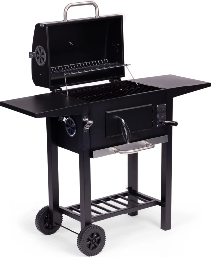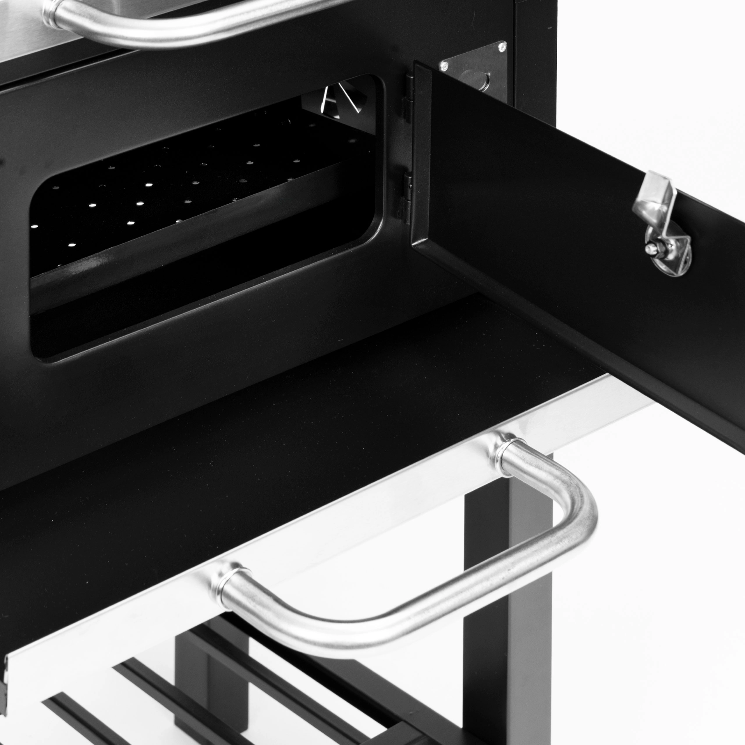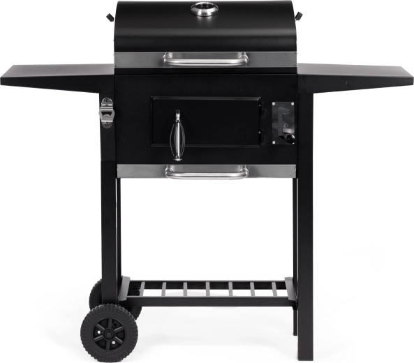 A pull-out ash drawer for quick cleaning, front door for adding charcoal, two side shelves, and a bottom storage rack for perfect organization.