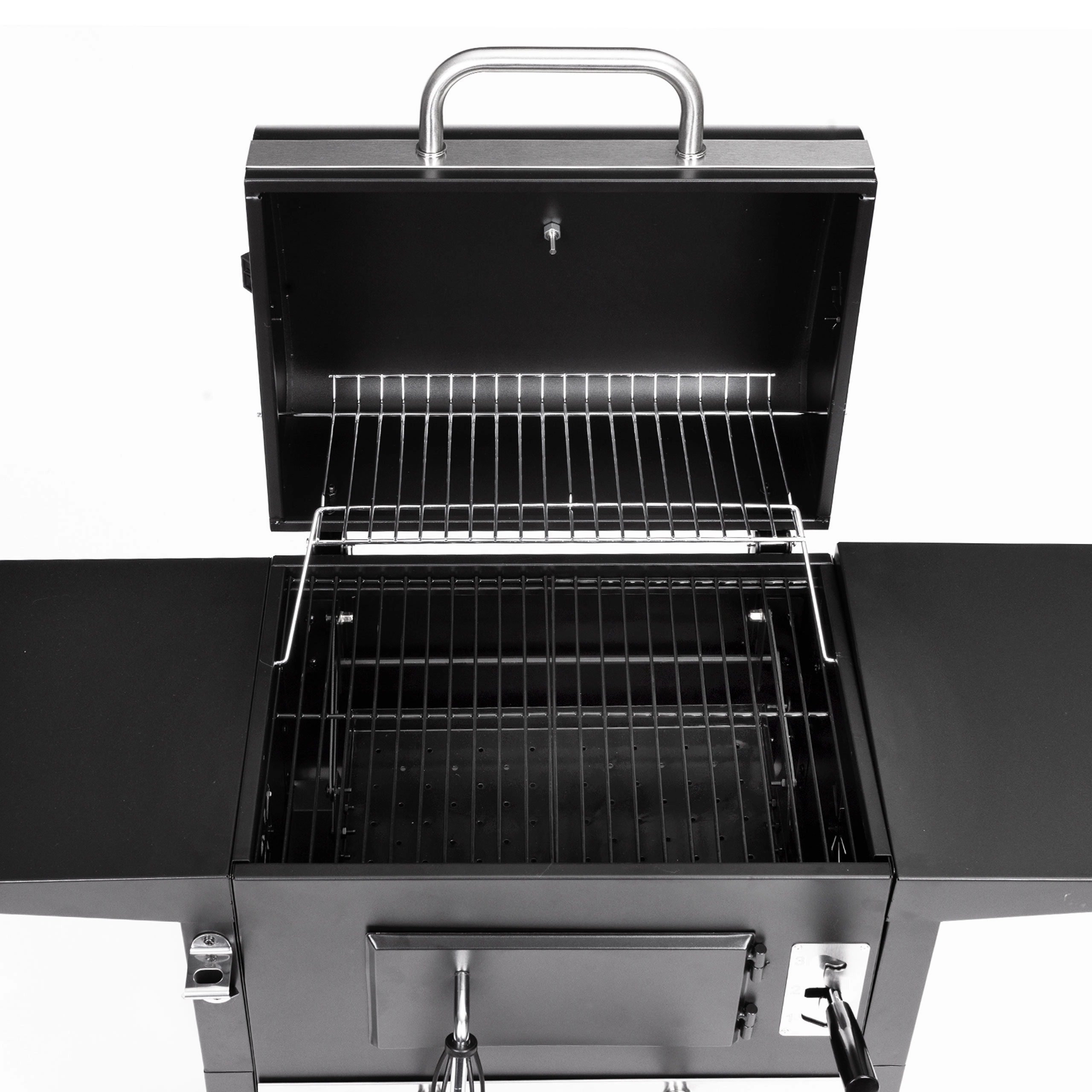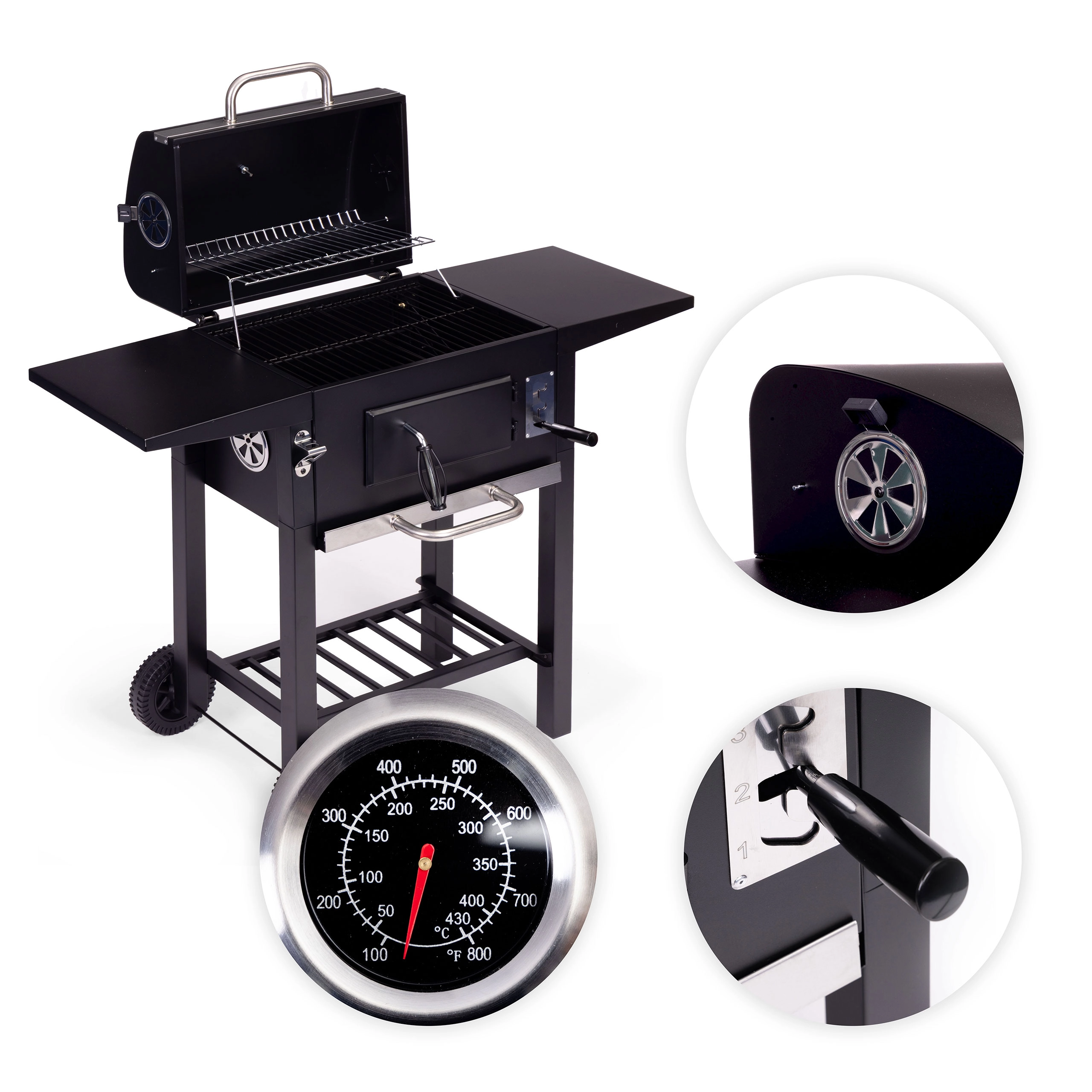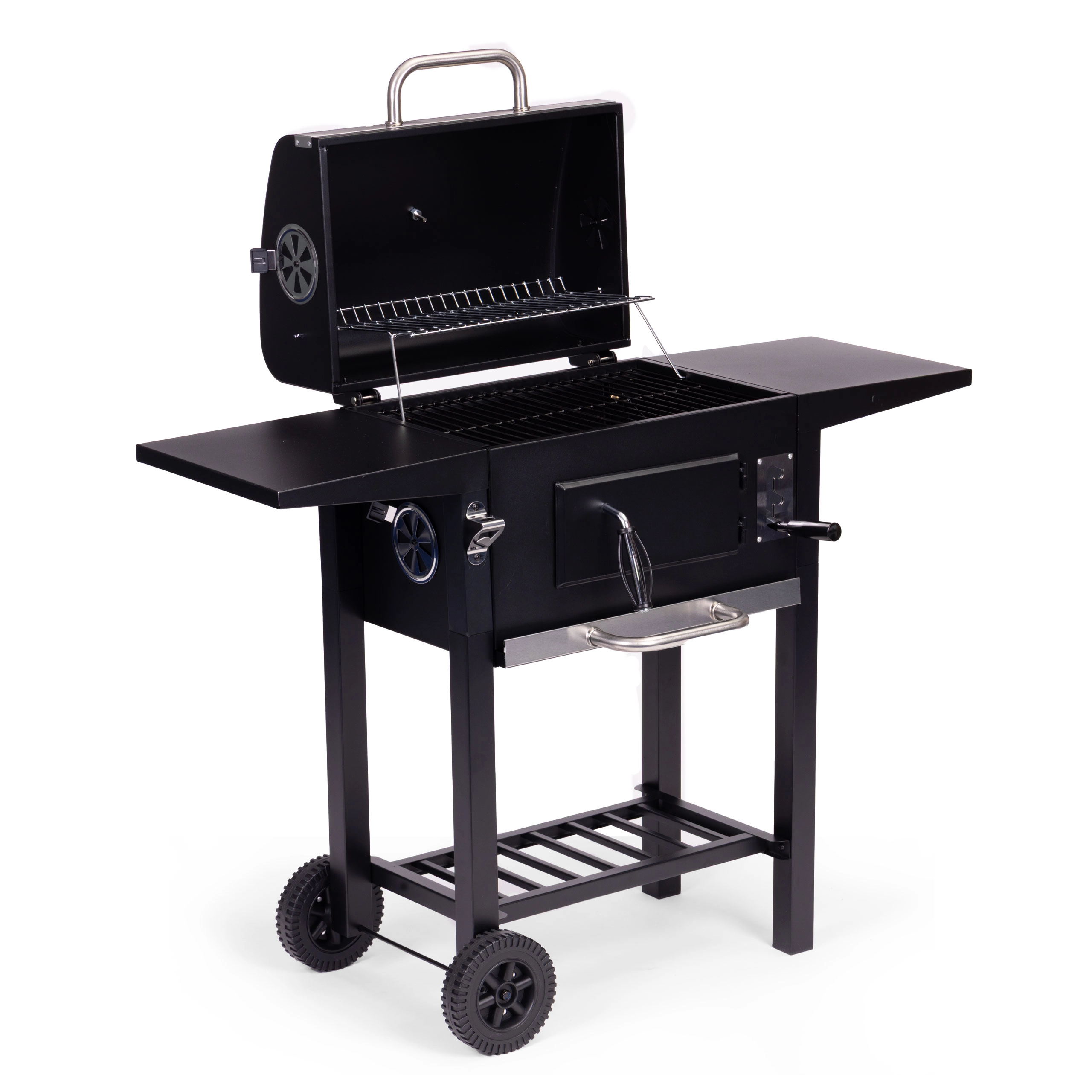 A pull-out ash drawer for quick cleaning, front door for adding charcoal, two side shelves, and a bottom storage rack for perfect organization.