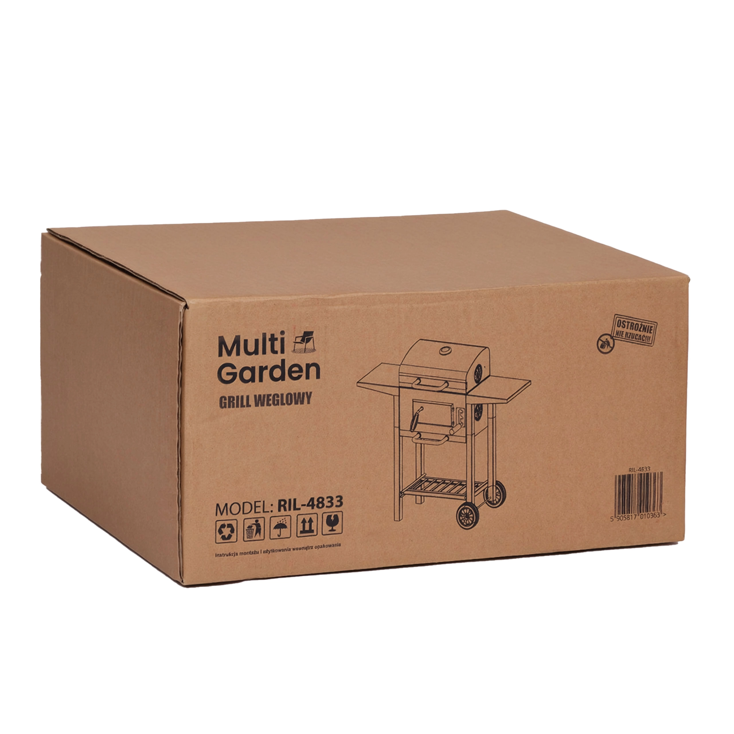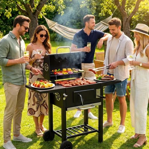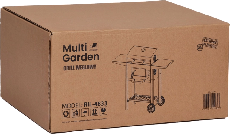 Enjoy the authentic taste of grilling with the robust MULTIGARDEN charcoal garden grill. It offers a large grilling area, 3-level grate height adjustment, a built-in thermometer, and a pull-out ash drawer for easy cleaning. Practical side and bottom shelves, ventilation openings, transport wheels, and a warming rack ensure comfort with every cookout.