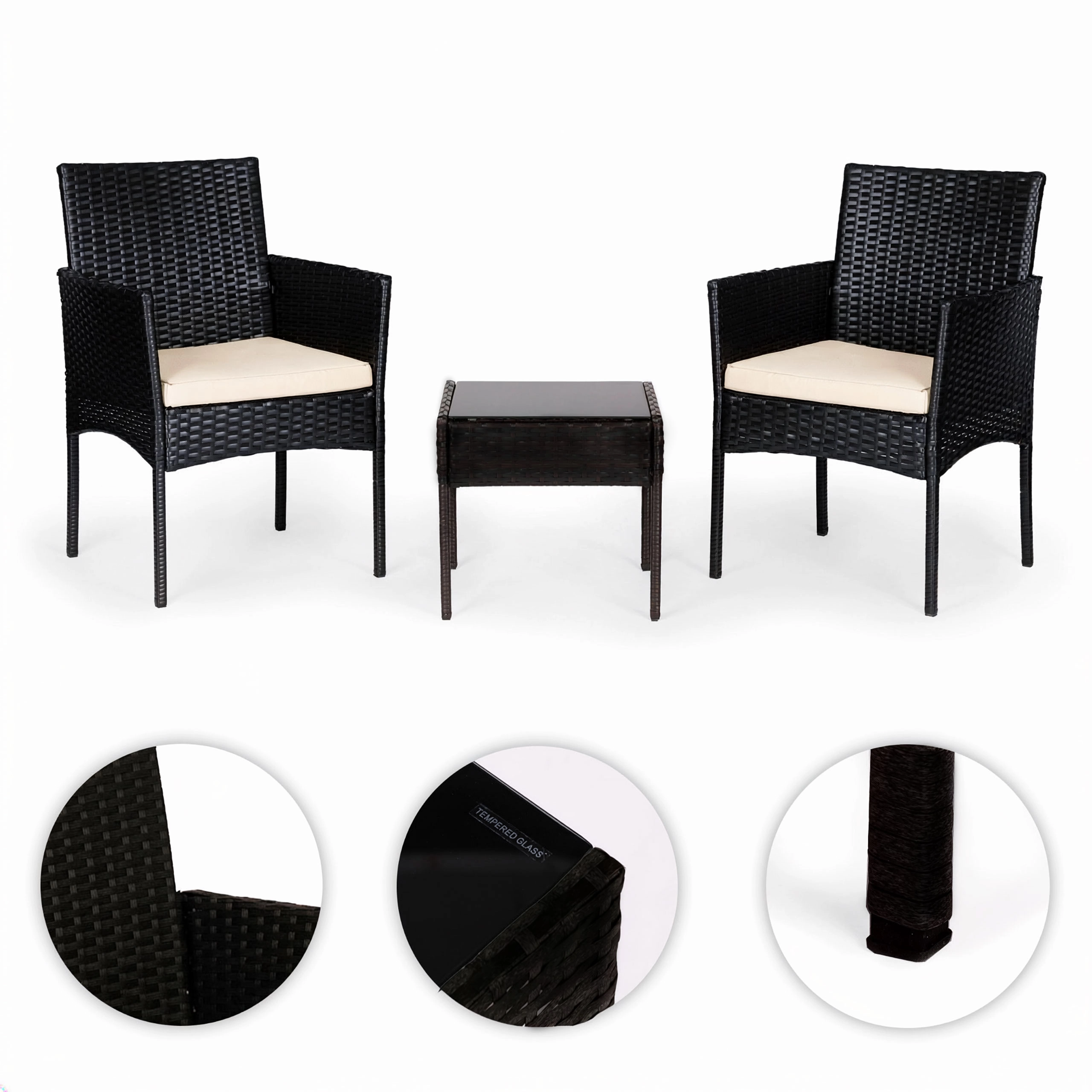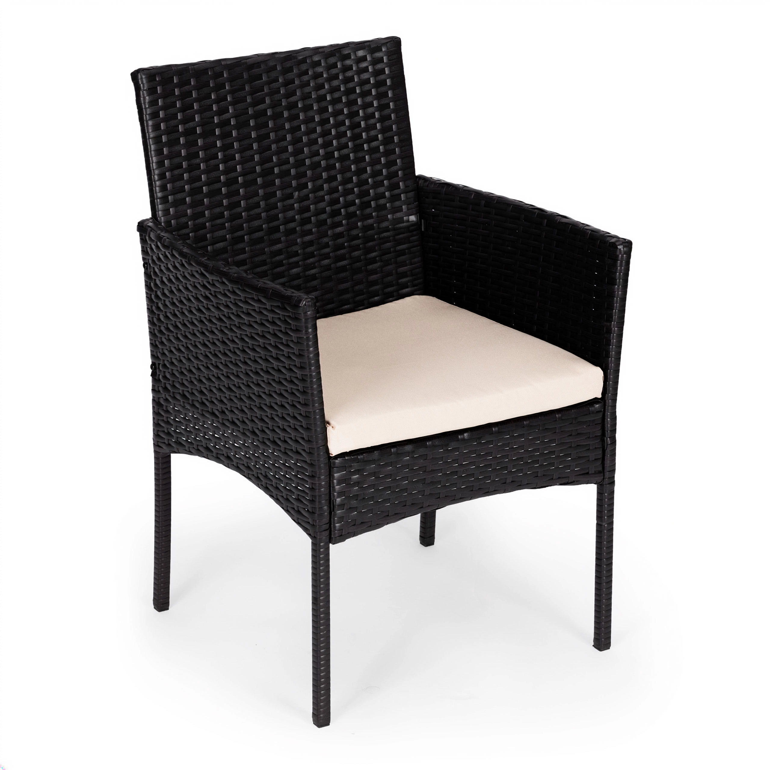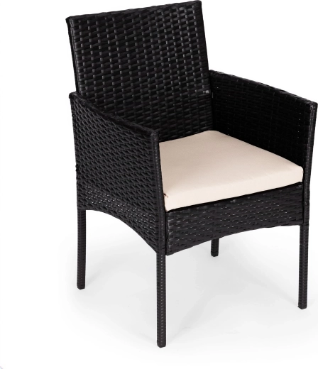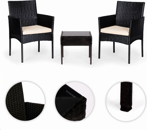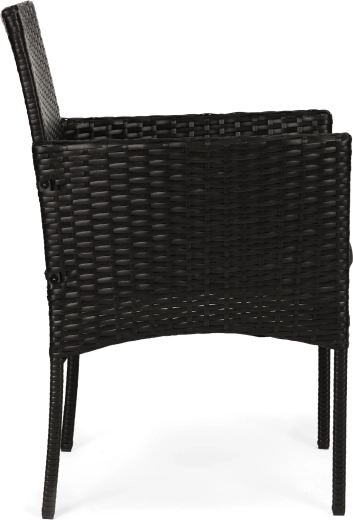 The armchairs are made of durable technorattan with a robust steel frame. 160 g/m² polyester cushions handle outdoor use well and provide comfortable seating. The table is fitted with 5 mm tempered glass for safe everyday use. Non-slip feet ensure stability and protect the floor.