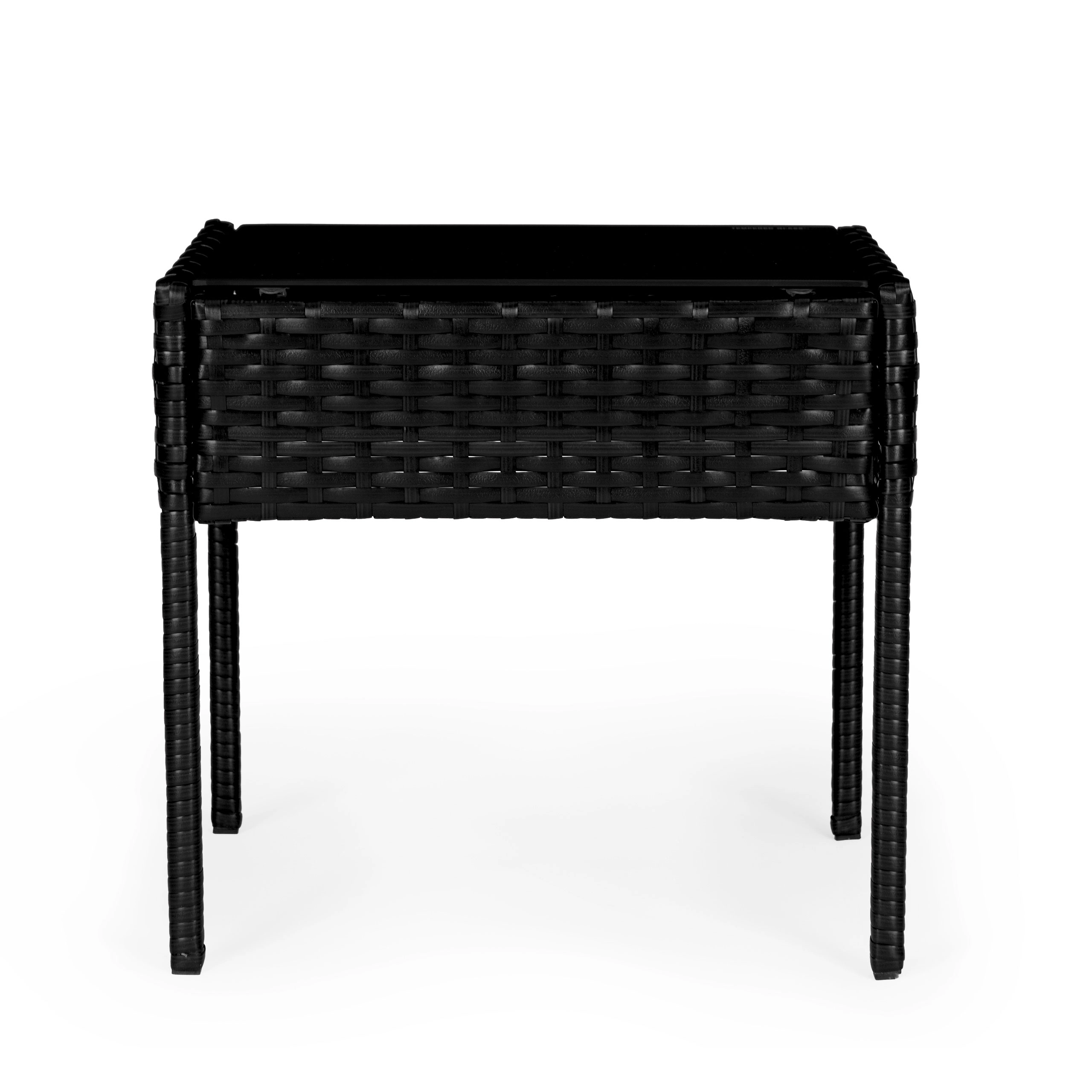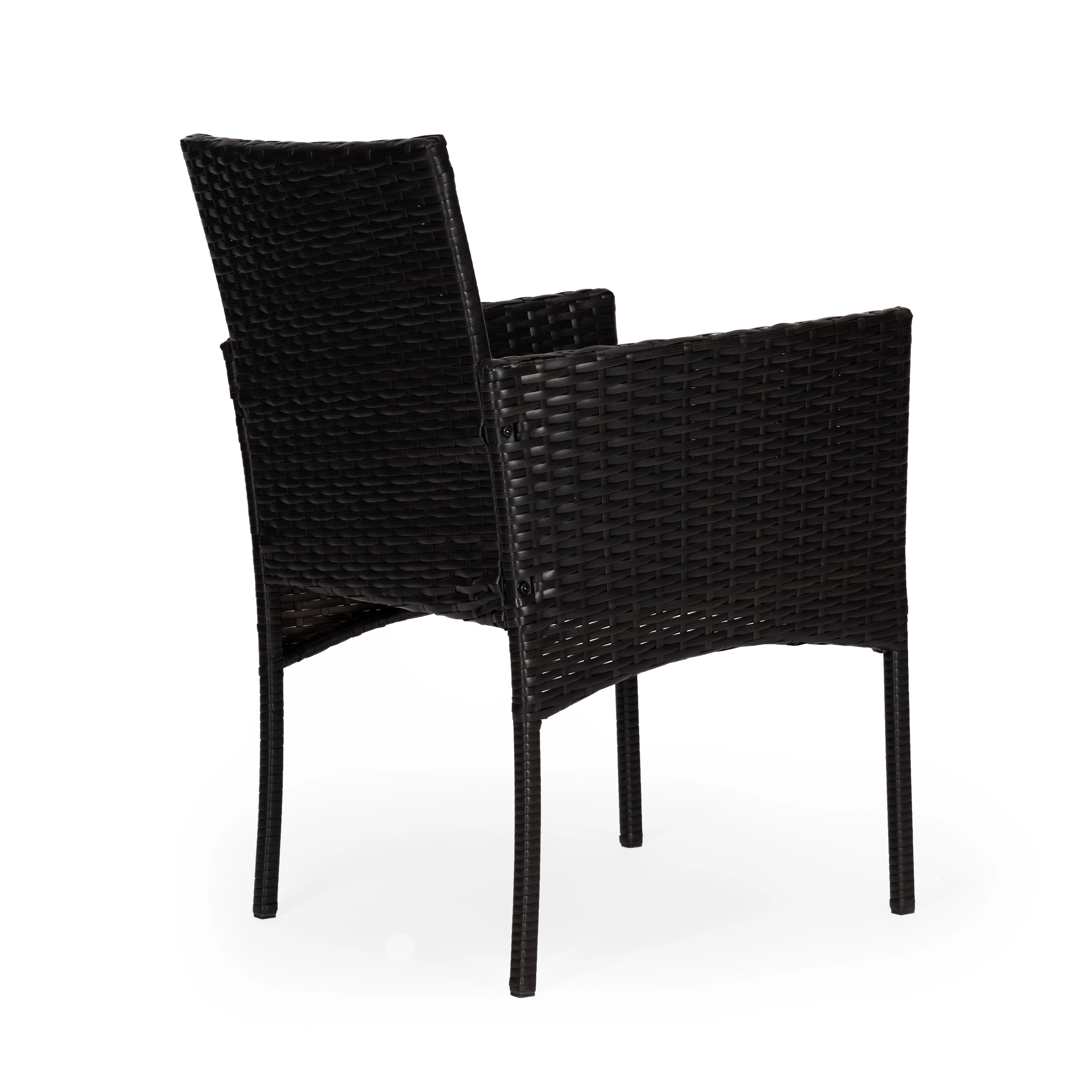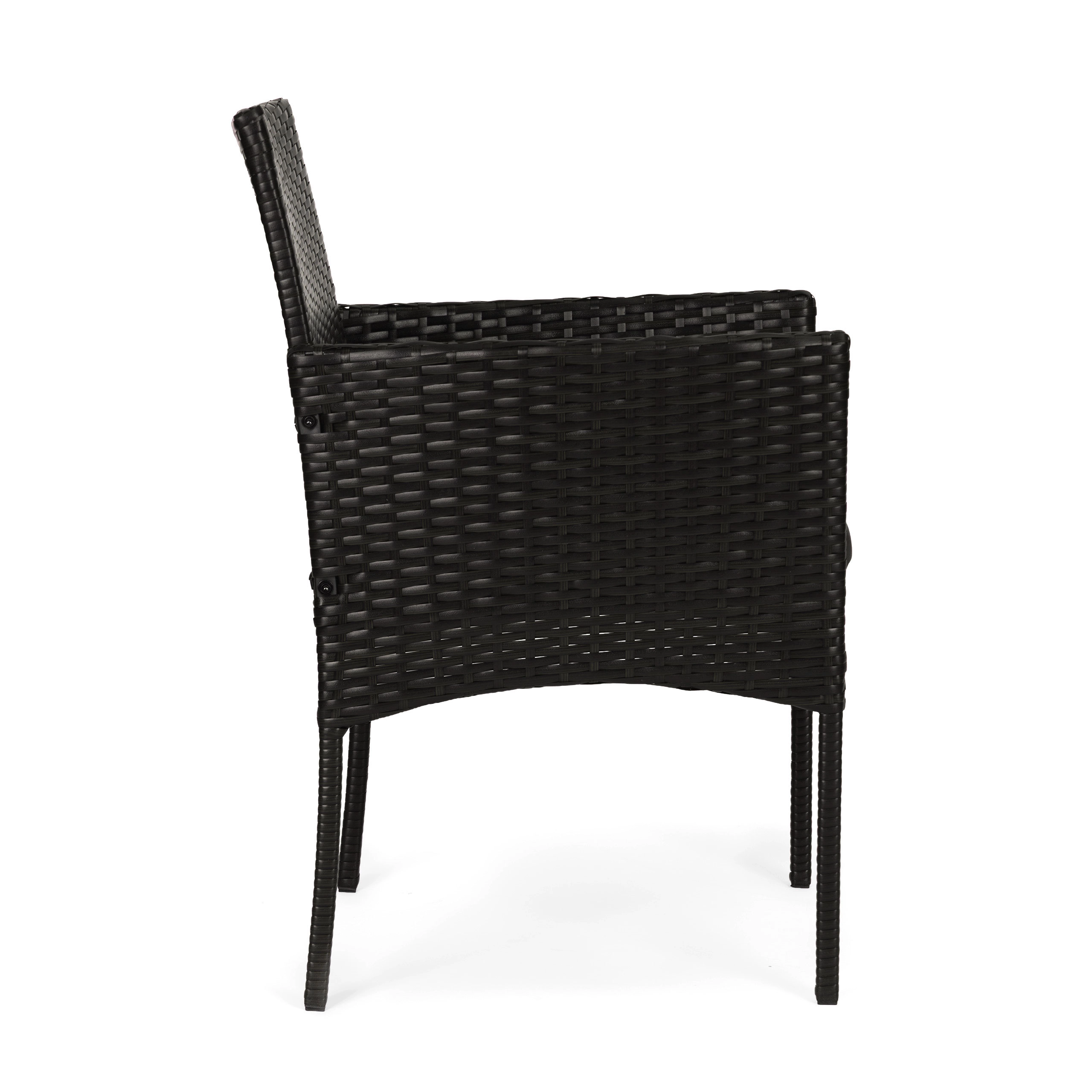 The armchairs are made of durable technorattan with a robust steel frame. 160 g/m² polyester cushions handle outdoor use well and provide comfortable seating. The table is fitted with 5 mm tempered glass for safe everyday use. Non-slip feet ensure stability and protect the floor.