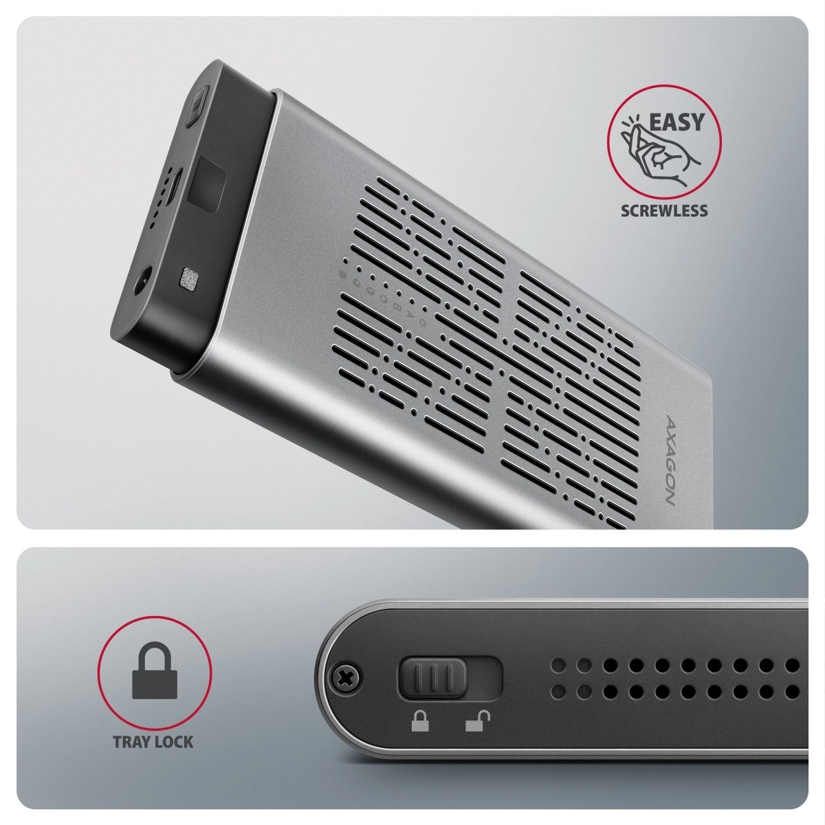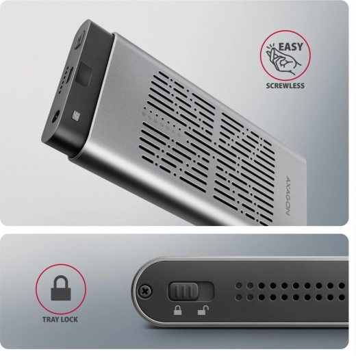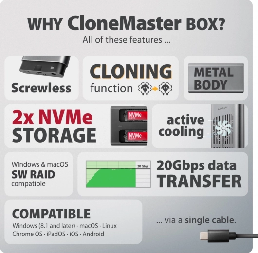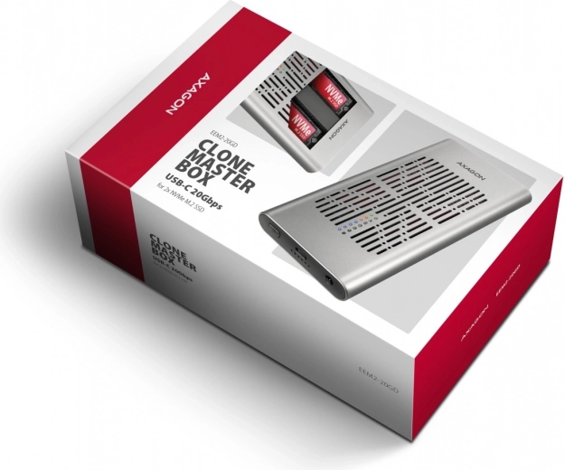 Fast external enclosure AXAGON CLONE MASTER for two NVMe M.2 SSDs combines storage and standalone disk cloning without a PC. Connection via USB‑C 3.2 Gen 2x2 (20 Gbps), support for UASP, TRIM, S.M.A.R.T. and active cooling for stable performance.