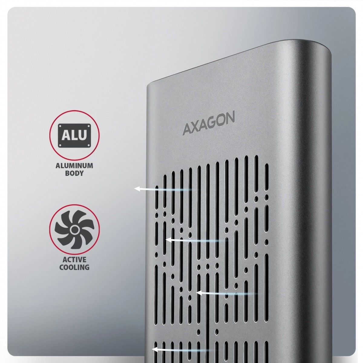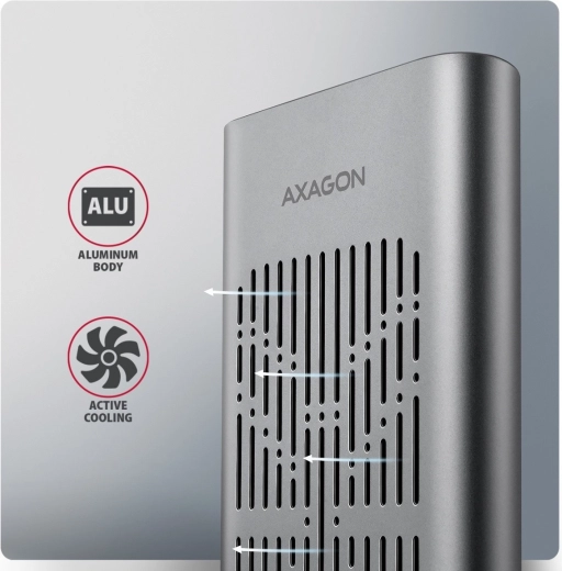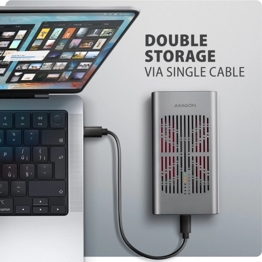 Create a universal 2‑in‑1 external storage. Connect the enclosure with a single USB‑C cable and the system will show two separate SSDs. Thanks to software RAID support in Windows (Storage Spaces) and macOS (RAID Assistant), you can easily boost data protection or performance. The aluminum body with thermal pads and an integrated fan keeps temperatures in check and minimizes thermal throttling.