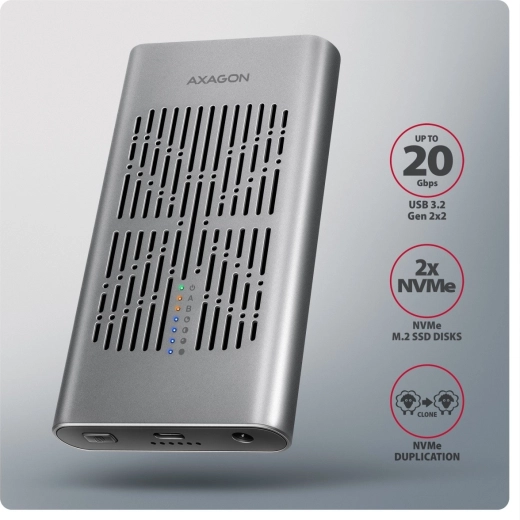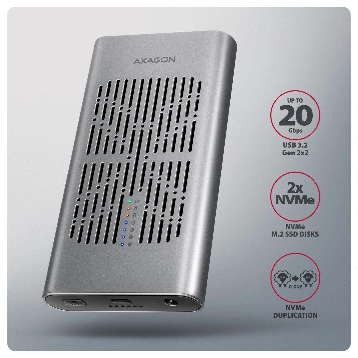 Axagon Clone Master aluminum external enclosure for two NVMe M.2 SSDs USB‑C 3.2 Gen 2x2 20 Gbps