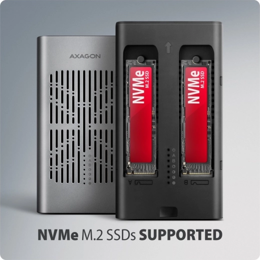 • Two NVMe M.2 in one enclosure – independent operation or software RAID.