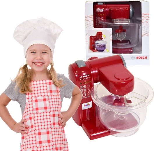 This stylish burgundy kids' kitchen mixer faithfully imitates an original BOSCH appliance. Thanks to light and sound effects, it feels like a real device and motivates children to imitate adults while cooking. The lightweight construction and safe materials ensure comfortable, worry-free use.