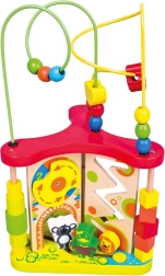 Discover a fun and durable wooden activity maze that supports children’s development from 18 months. The toy offers a colorful bead maze, sliding animal figures, and other interactive elements to practice fine motor skills, cognitive abilities, color and number recognition, and awareness of the time of day.