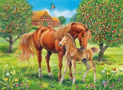 A fun puzzle for children featuring beautiful horses in a meadow, offering 100 large pieces for easy assembly.