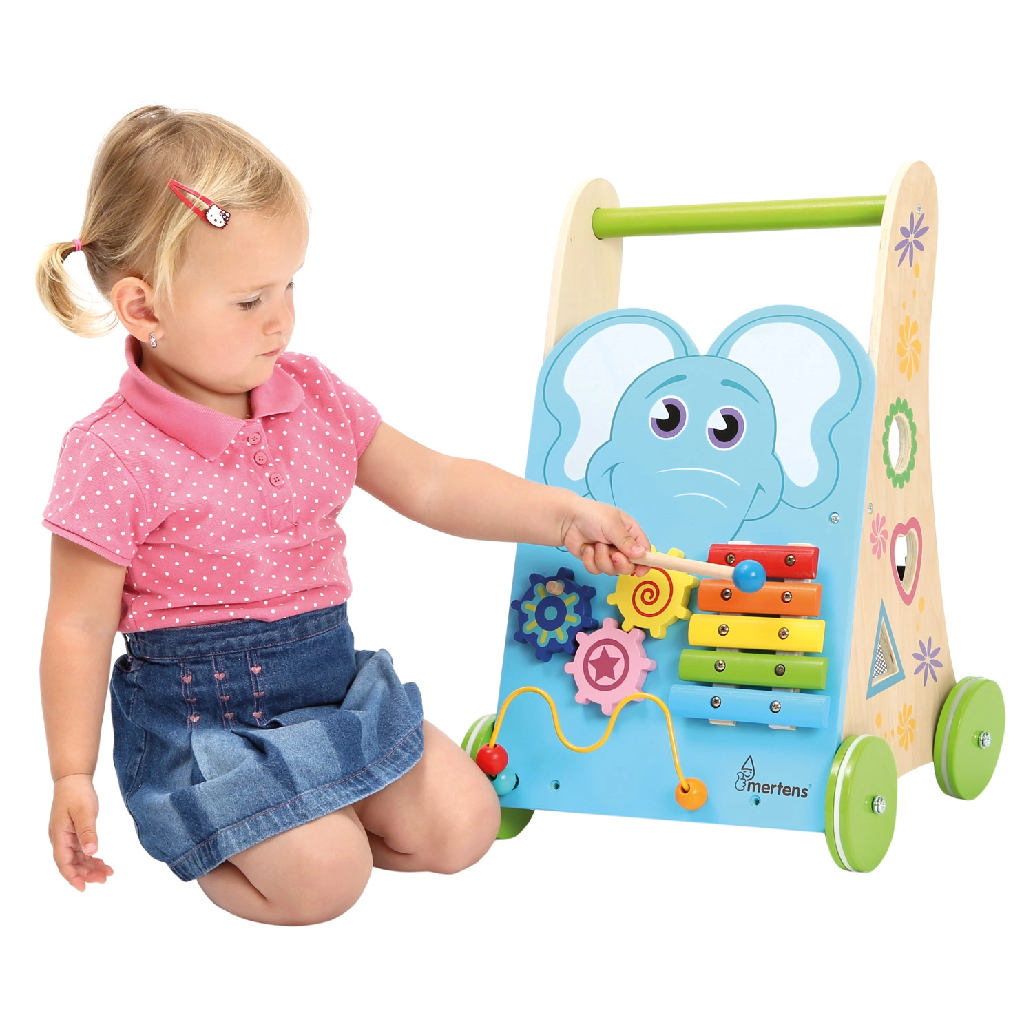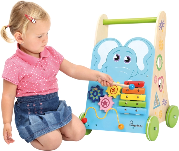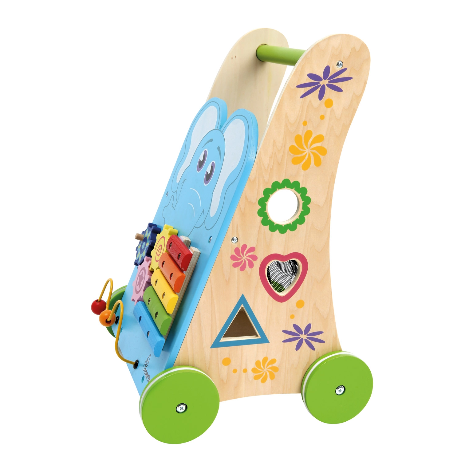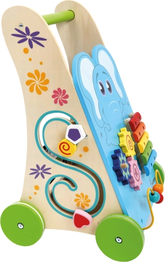 The xylophone with mallet, gears, bead maze, and shape sorter develop fine motor skills, auditory perception, and logic in one compact walker.