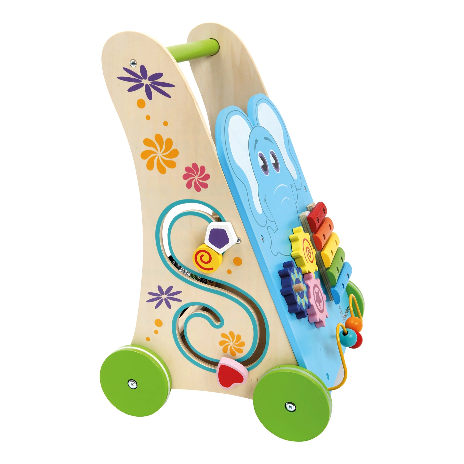• 4-in-1 activity panel: shape sorter, bead maze, gears, xylophone