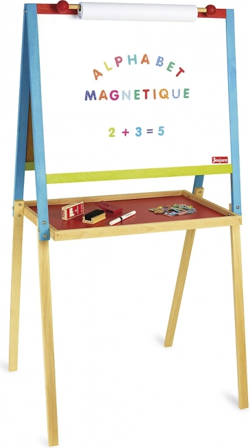 Boost children’s creativity with this sturdy 2-in-1 wooden board. It offers a black chalkboard surface and a white magnetic dry-erase surface, a paper roll holder, a large storage shelf, and rich accessories. Made in France from solid wood with a water-based finish – a safe and durable solution for everyday creating.