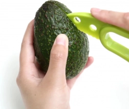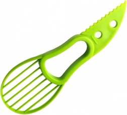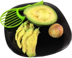 Discover an easy way to prepare an avocado in seconds. This multifunctional helper combines a sharp plastic knife for lengthwise cutting, a special section for safe pit removal, and a practical side for quick scooping and slicing the flesh into segments.